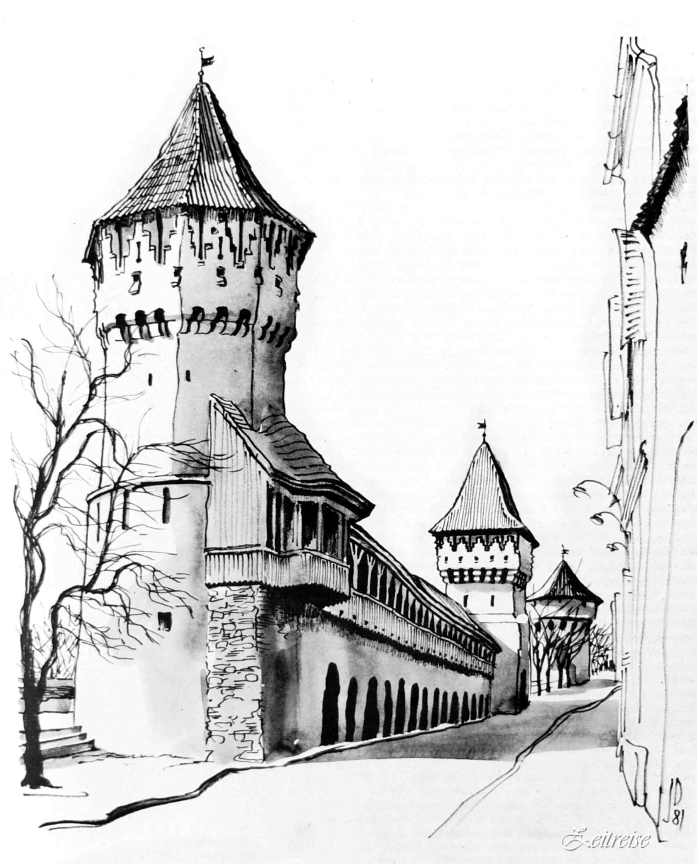 Turnul Dulgherilor, Olarilor și Archebuzierilor de pe str.Cetății și zidul centurii a III-a de fortificație restaurat 1971 – desen realizat de Juliana Fabritius-Dancu 1981