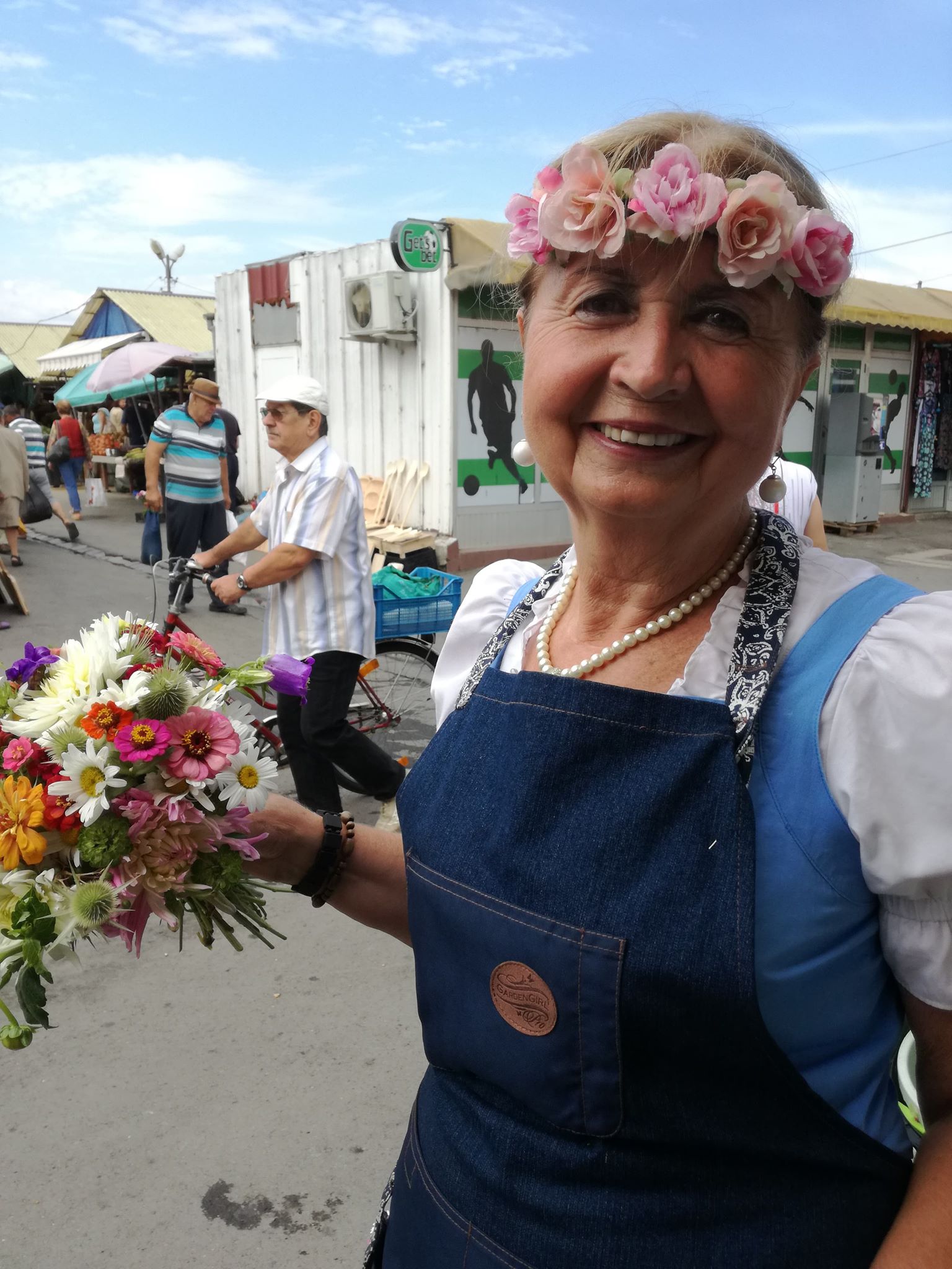 Cu aceeași dragoste și curaj Sara noastră s-a așezat în locul mamei, deși a cunoscut locuri în lume și succesul în carieră. Vine de departe, dar niciodată nu a plecat, căci Casa se poartă în inima și e parte din om. Îmi spune că mama ar fi mândră să o vadă acum aici, în Piață, în locul în care ea însăși a împărțit din roadele grădinii ani la rând. Sara trage căruciorul înflorat pe drumuri hurducate din Turnisor/Neppendorf până în Piața Mare , demnă, cu flori prinse în păr, mereu altele, dar veșnic zâmbitoare. „Gardengirl“ îi scrie pe șorțul primit în dar de la copii și e surprinsă că am remarcat acest detaliu. Mă gândesc că e o eticheta perfectă, ca un logo de firmă.