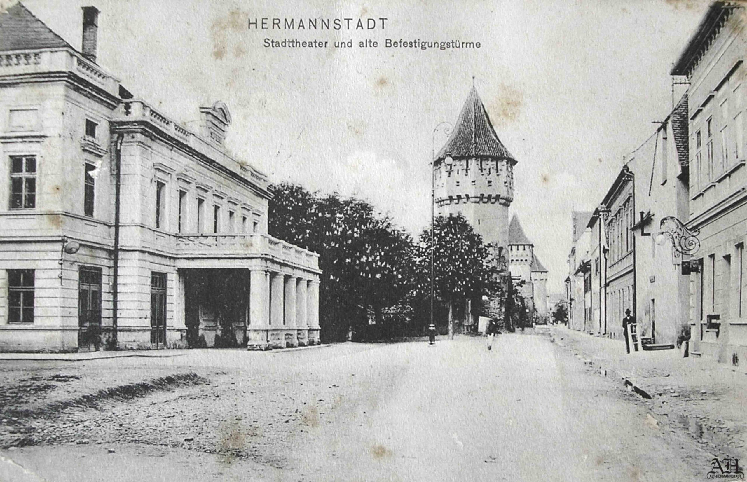 Cartea poștală inscriptionată cu textul „Hermannstadt ~ Stadttheater und alte Befestigunstürme“ // „Sibiu ~ Teatrul orășenesc și turnuri vechi de fortificație“ a fost realizată la începutul sec al XX-lea.