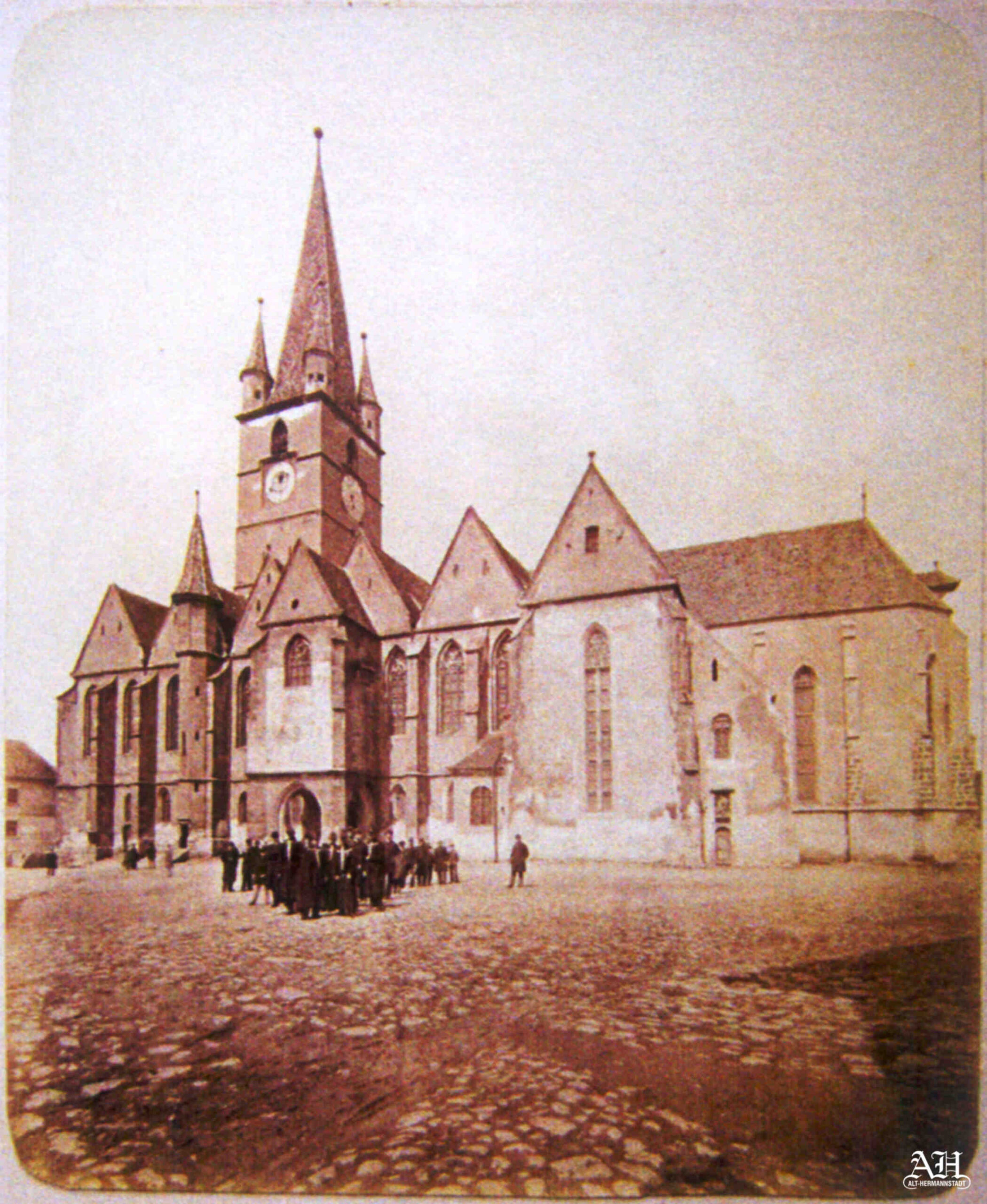 Fotografie din atelierul lui Theodor Glatz realizată 1866/67. Există altă variantă, reproducere fotografică (după același negativ, clișeu de sticlă) în care apare ceasul nou cu cadran negru pe turnul Bisericii Evanghelice. Această variantă „anacronică“, retușată/ prelucrată, a fost datată greșit, între 1881 și 1883! (1881 din cauza ceasului nou, montat în 1881 și 1883 din cauza gardul de fier forjat, care a fost construit 1883 și care bineințeles nu apare în această fotografie din 1866/67).