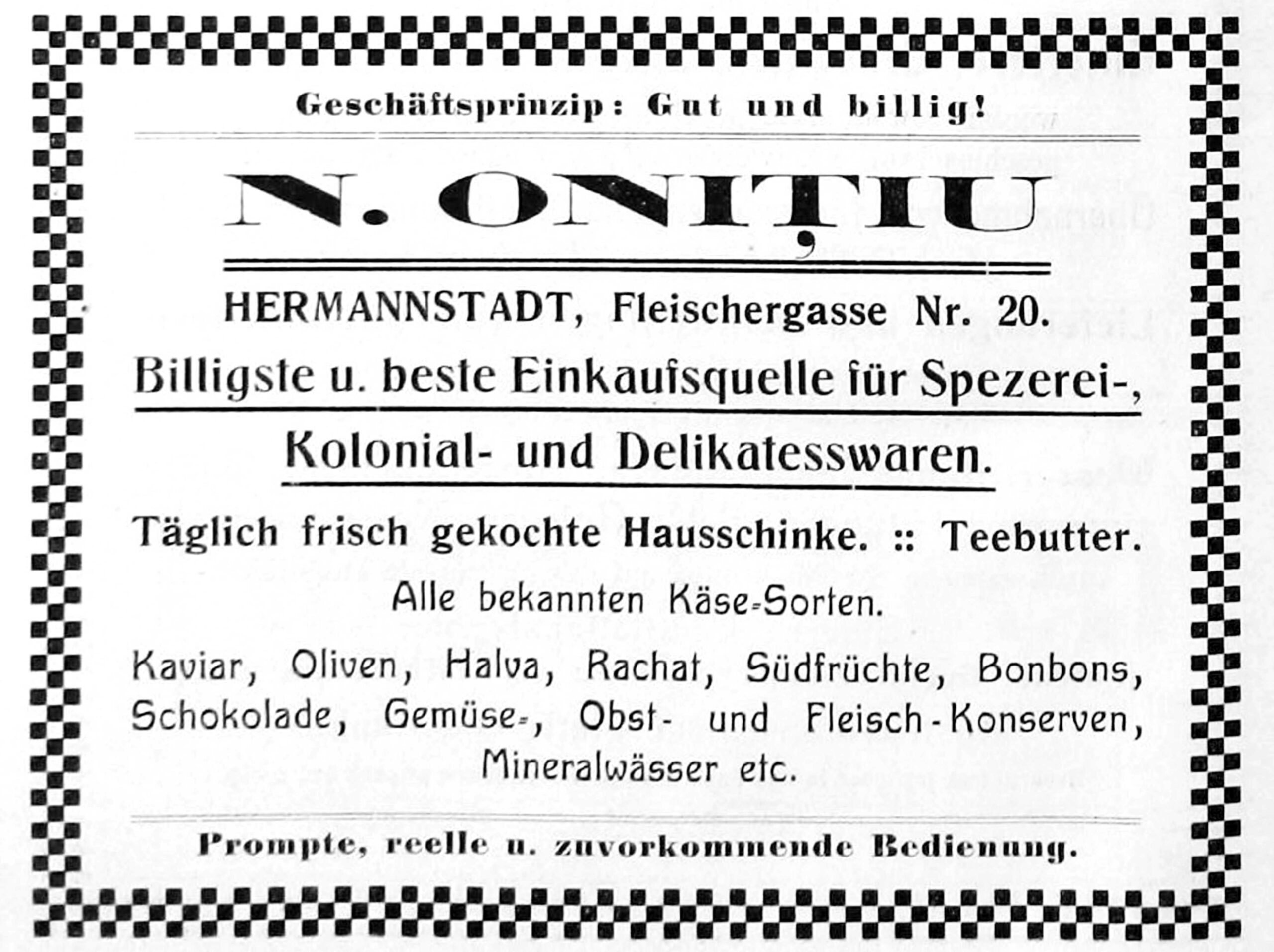 Dreapta: Reclamă comercială din cartea de adrese din 1911, la magazinul lui N. Onițiu, strada Fleischergasse Nr. 20 / Măcelarilor nr. 20, ( azi Mitropoliei 16 )!