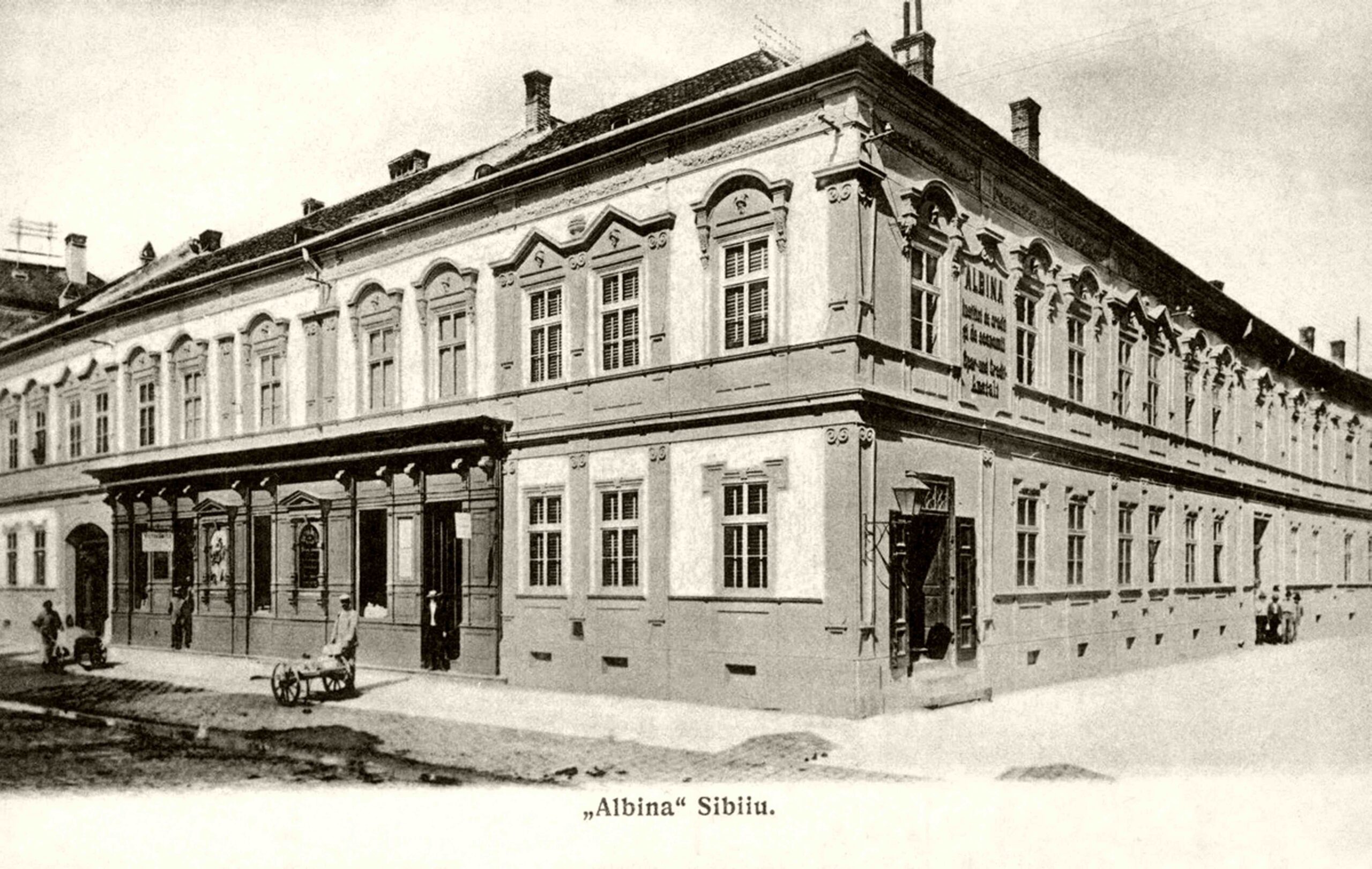 Clădirea de colț, strada Mitropoliei cu strada Poștei a fost ridicată în 1882 de banca Albina pe două parcele vechi: Fleischergasse No. 20 și Baiergasse No. 1 ( azi, strada Poștei ). Vechea clădire de pe parcela 20, în care a funcționat în secolele XVII-XIX hanul Curtea Sighișoarei // Schäßburger Herrnhof, a fost integrată în noul edificiu ( vezi acoperișul corpului de clădire spre strada Mitropoliei ).În cartea de adrese, 1887, la capitolul „Spezereiwarenhändler” ( comerciant produse spițerie ) este listat comerciantul Franz Klein, la adresa strada Măcelarilor // Fleischergasse nr. 20 / Mitropoliei 16.