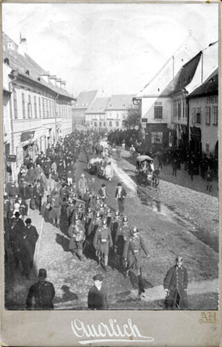 Cortegiul funerar cu trupul neînsufleţit al Episcopului Bisericii Evanghelice din Transilvania Dr. Georg Daniel Teutsch. G. D. Teusch (* 12 decembrie 1817 la Sighisoara; † 2 iulie 1893 la Sibiu) a fost una dintre personalitățile marcante ale societății sibiene. Din 19 septembrie 1867 până în 1893 a fost episcop al Bisericii Evanghelice C.A. din Transilvania. (Fotografii din colecția personală)
