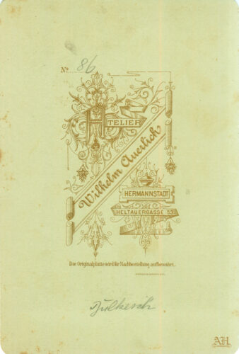 Fotografia este etichetată pe verso cu textul „Atelier Wilhelm Auerlich – Hermannstadt – Heltauergasse 53”.