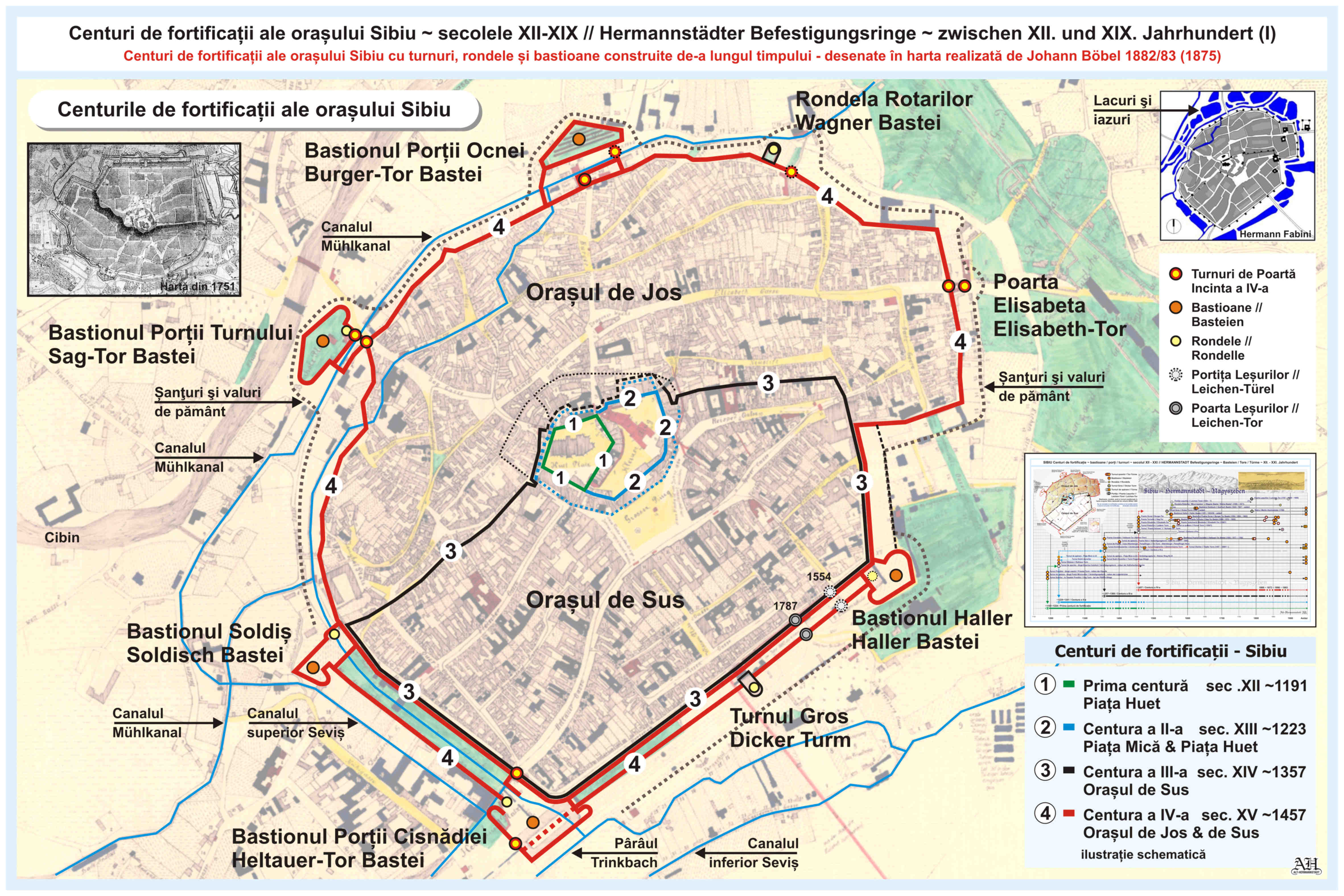 Centuri de fortificații ale orașului Sibiu cu turnuri, porți de acces, bastioane și rondele construite de-a lungul timpului – desenate în harta lui Johann Böbel din 1882/1883 (1875)