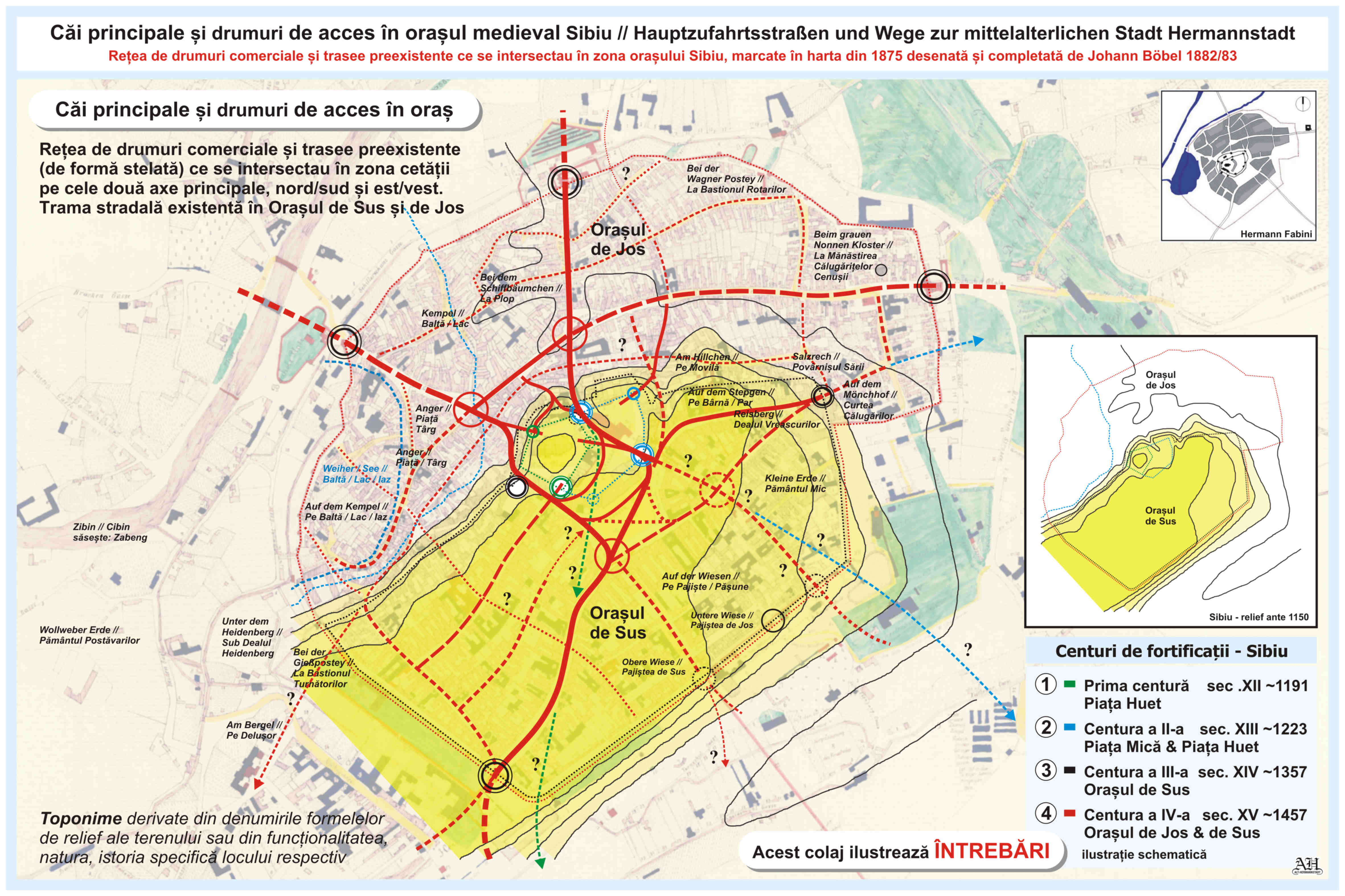 Acest colaj ilustrează trama stradală și căile principale de acces în orașul medieval Sibiu. Rețeaua probabilă de drumuri comerciale și trasele preexistente, de formă stelată (ce se intersectau în zona cetătii pe cele două axe principale, nord/sud și est/vest) sunt marcate / însemnate cu linie roșie în harta din 1875 desenată și completată cu texte olografe de Johann Böbel 1882/83.