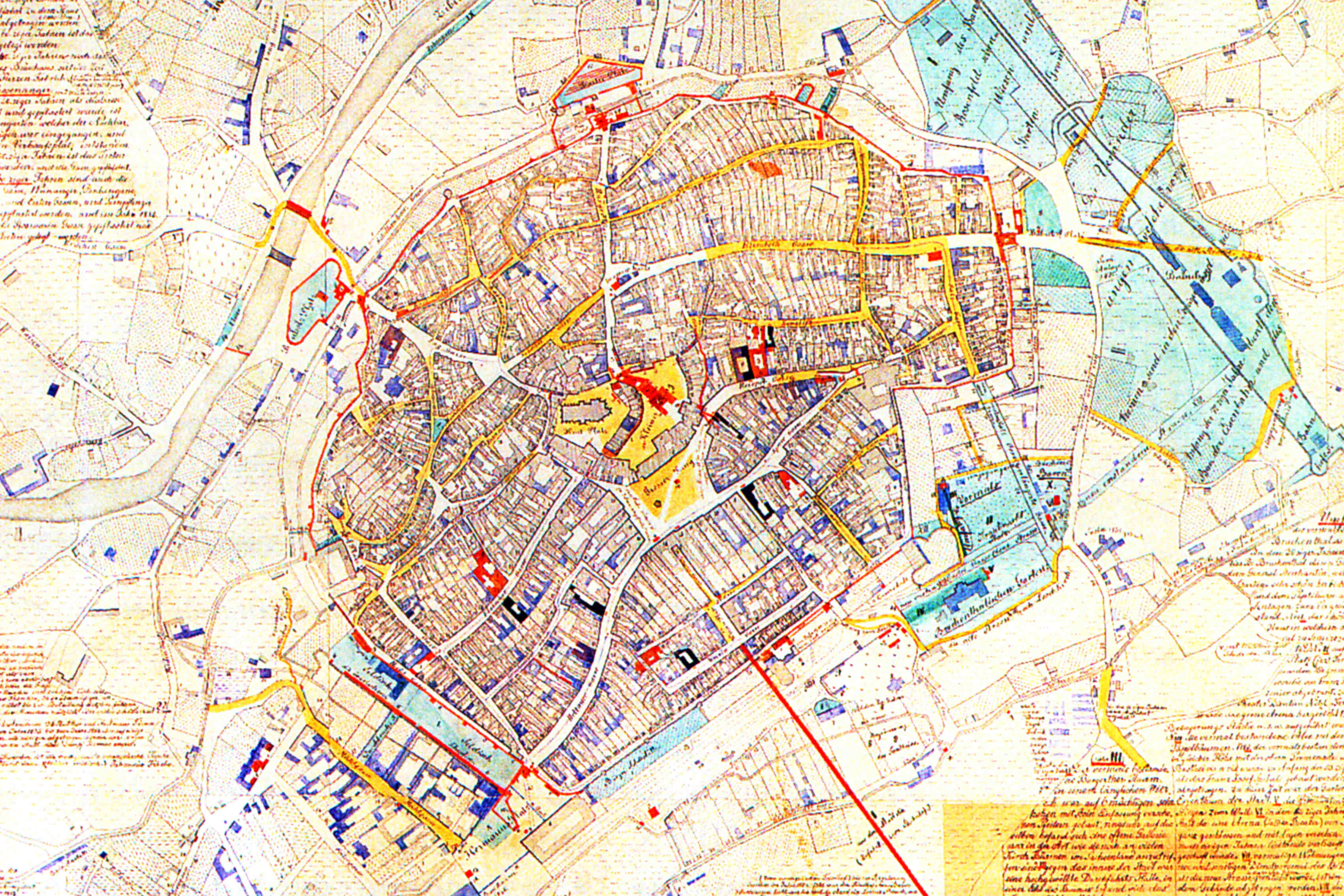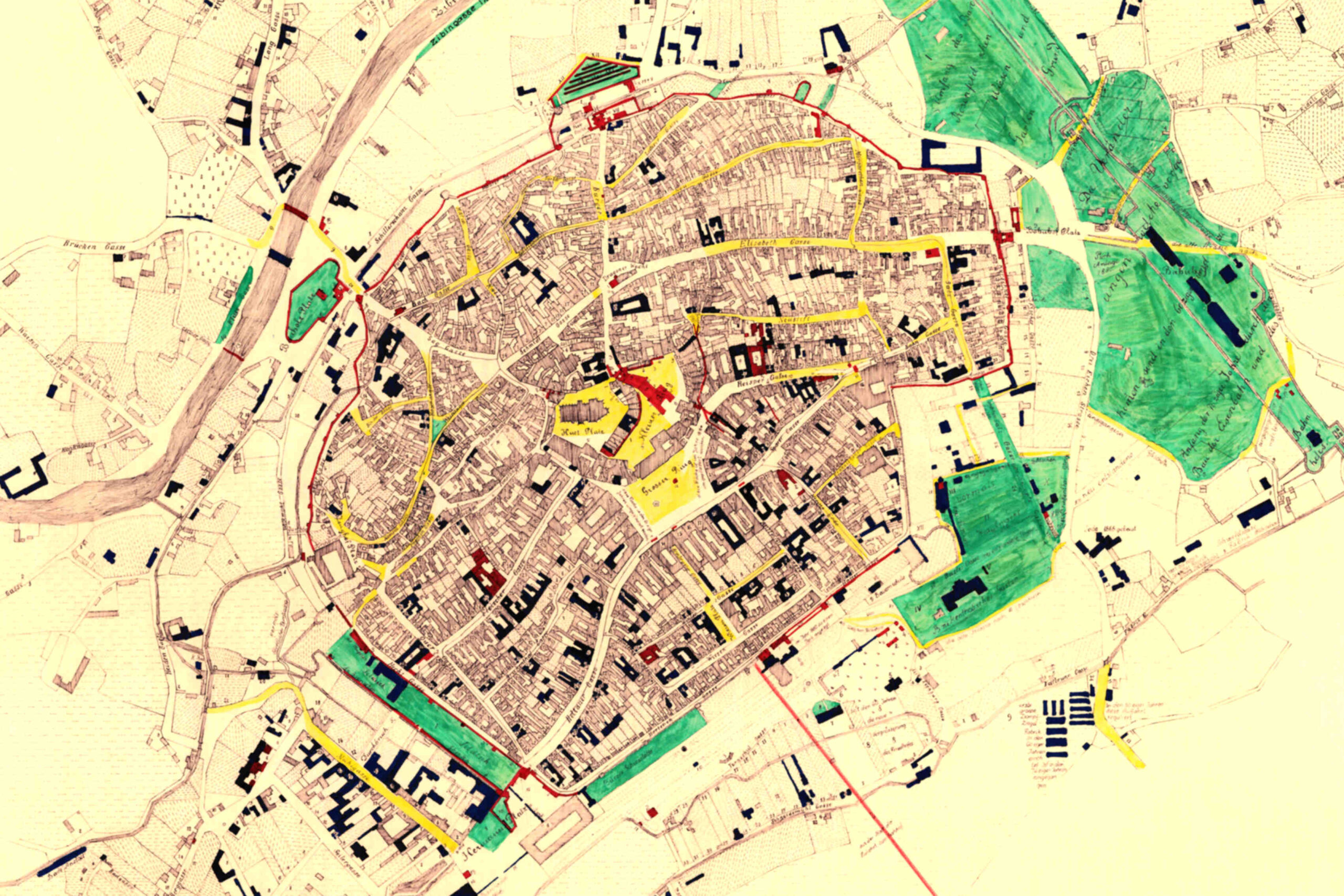„Harta orașului Sibiu 1882“ // „Stadtplan von Hermannstadt 1882“ – hartă cu texte olografe desenată de Johann Böbel.