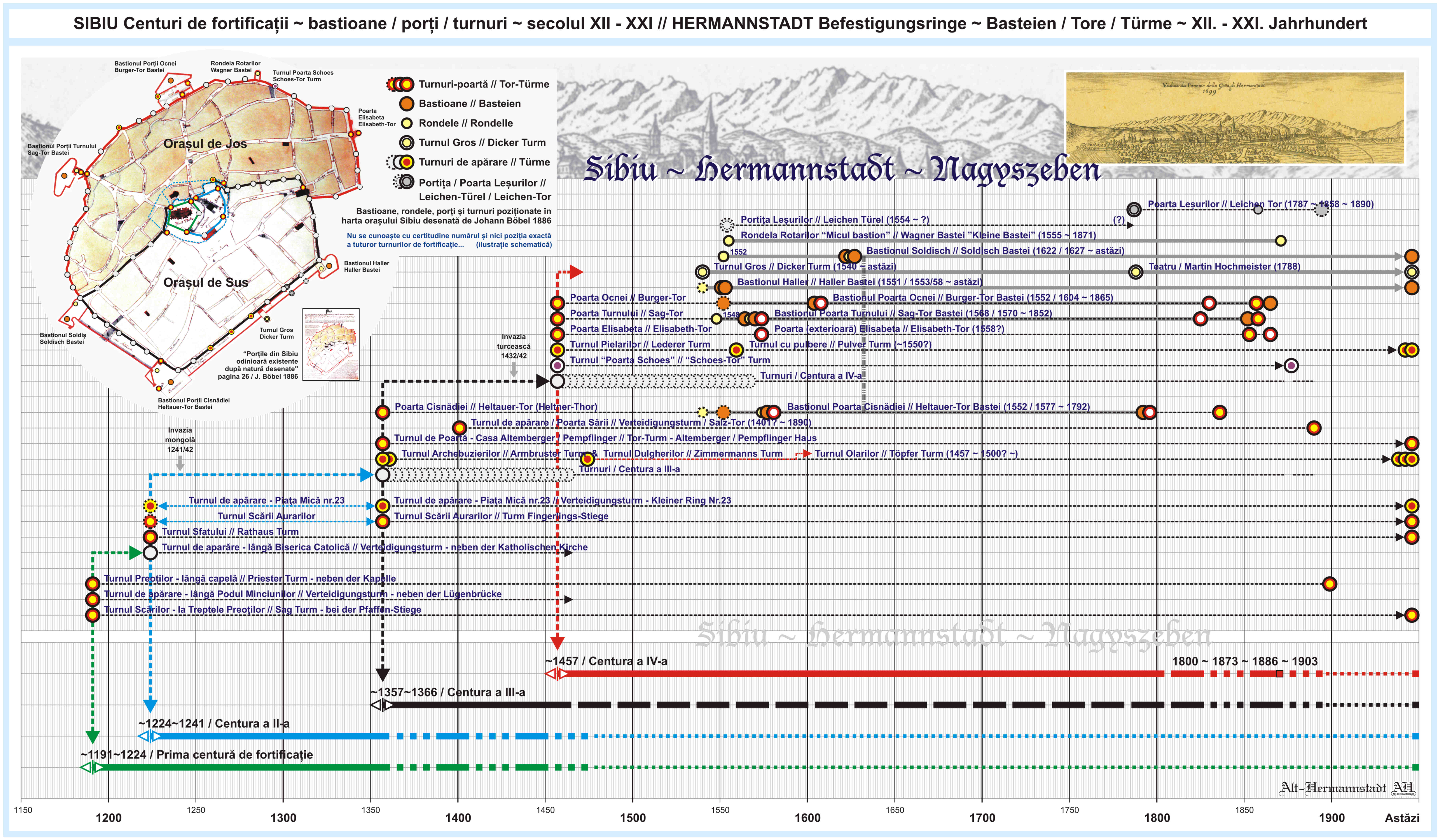 (sursa ilustrațiilor: arhiva grupului facebook Alt-Hermannstadt)Diagrama ~ Cronologia sistemelor de fortificații sibiene ~ vizualizează informațiile existente, cunoscute de mine la această dată, și necesită actualizări și rectificări…