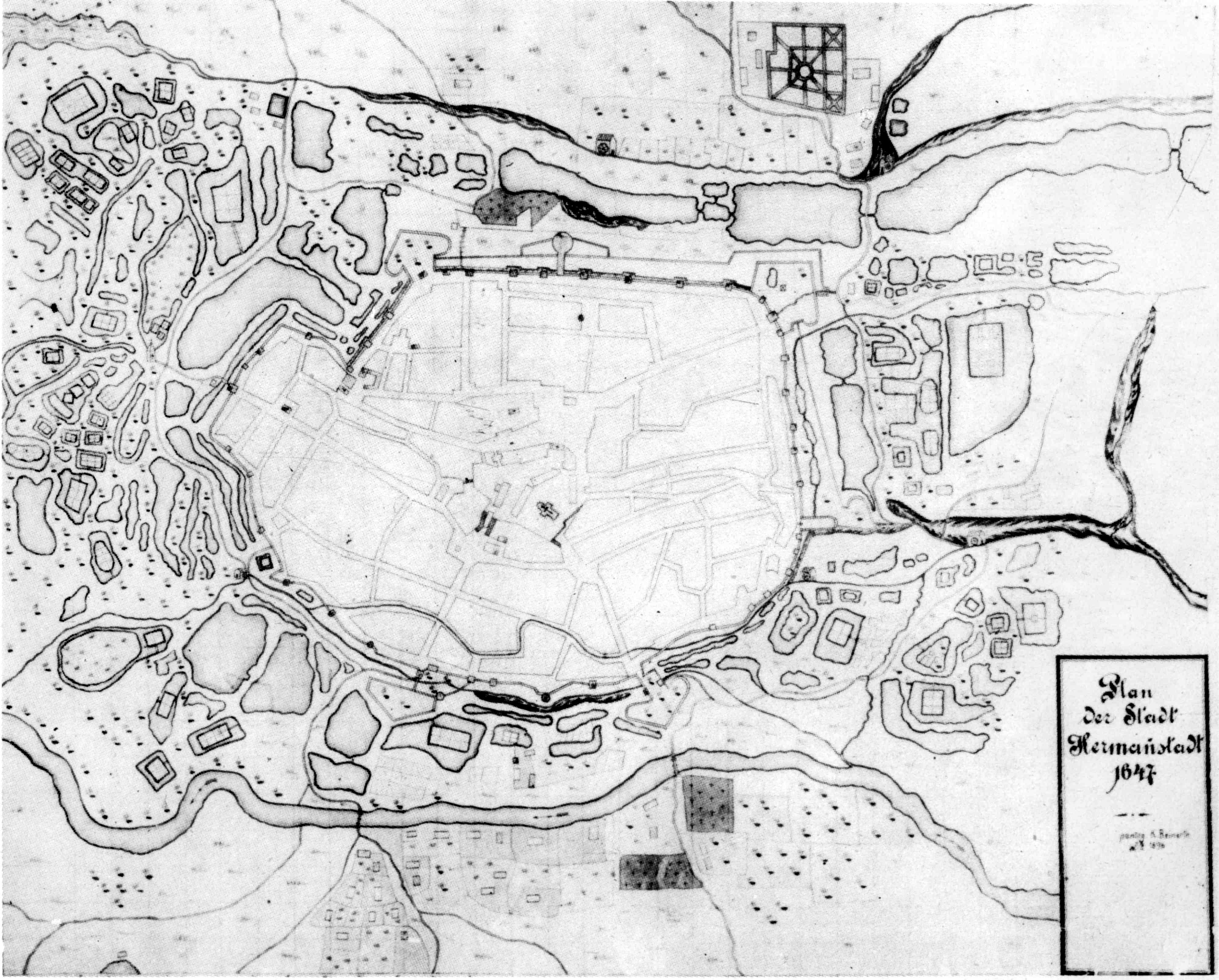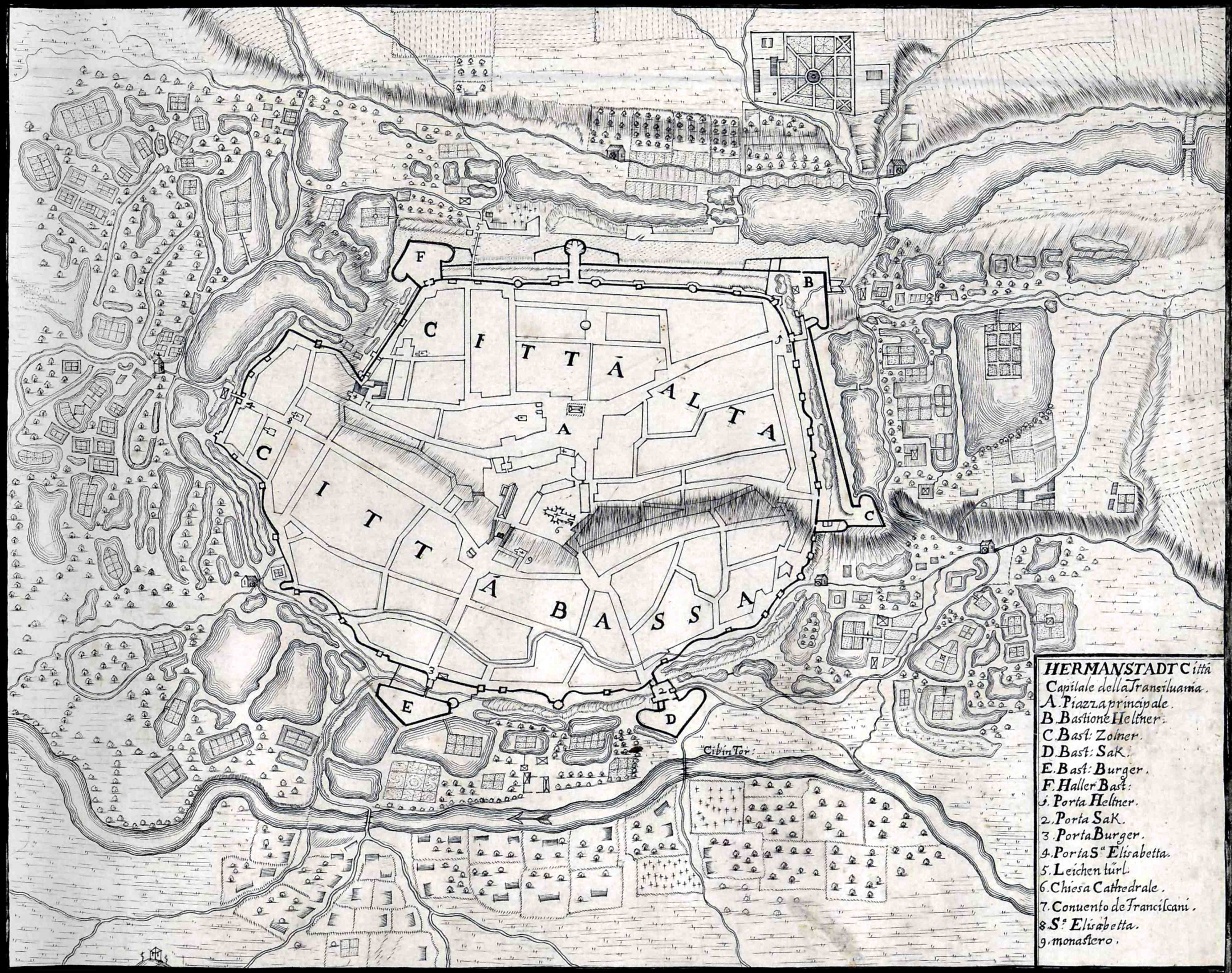 Harta orașului Sibiu cu sistemele de fortificații din secolul al XVII-lea – „Cibinium alias Hermons. o Hermestat Capitale Della Transilvania.resa all-Esercito Imperiale l-anno.1687“ – Giovanni Giacomo Rossi.