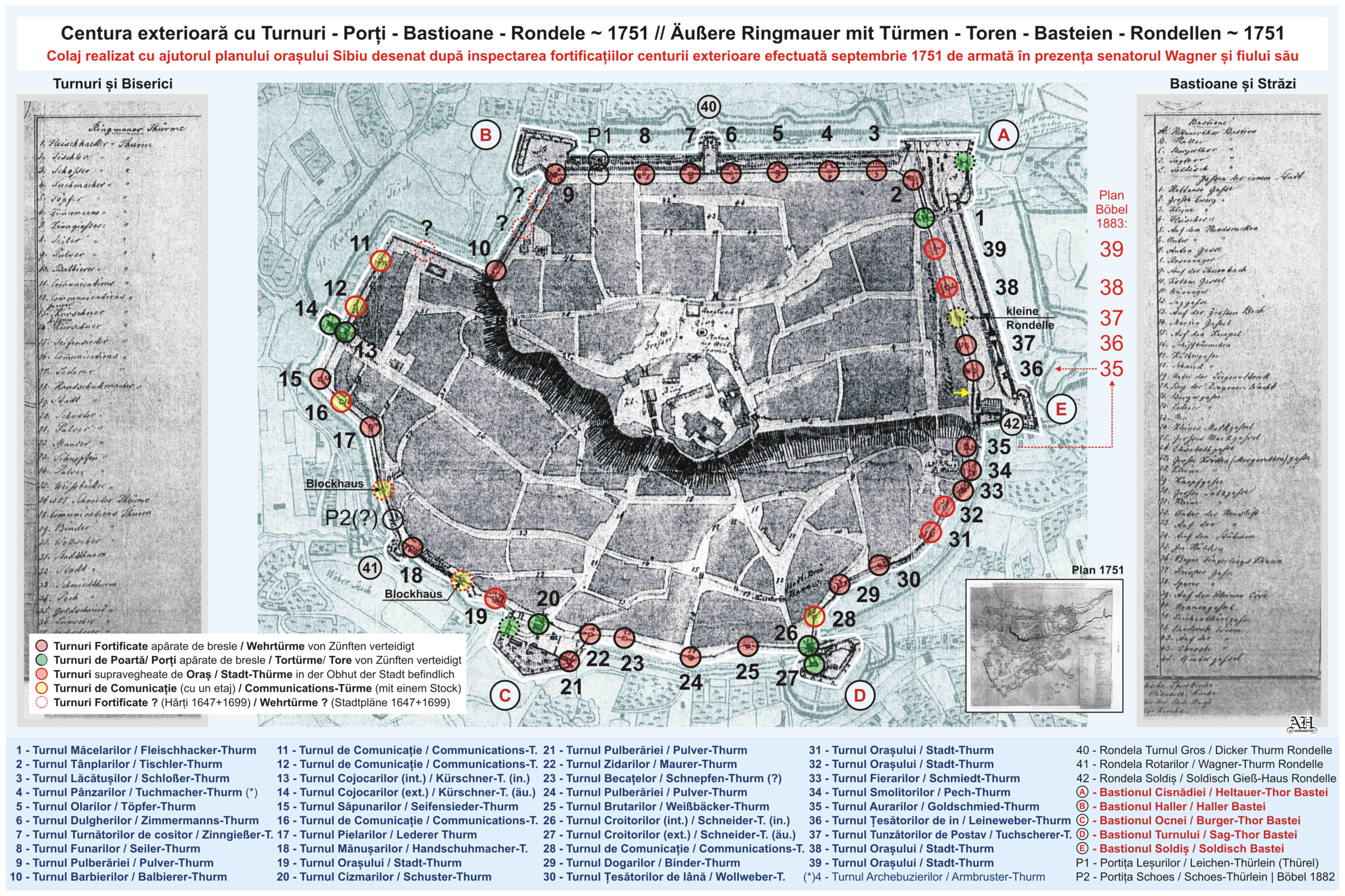„Centura exterioară – Turnuri de apărare – Porți – Bastioane ~ 1751 // Äußere Ringmauer – Wehrtürme – Tore – Basteien ~ 1751“