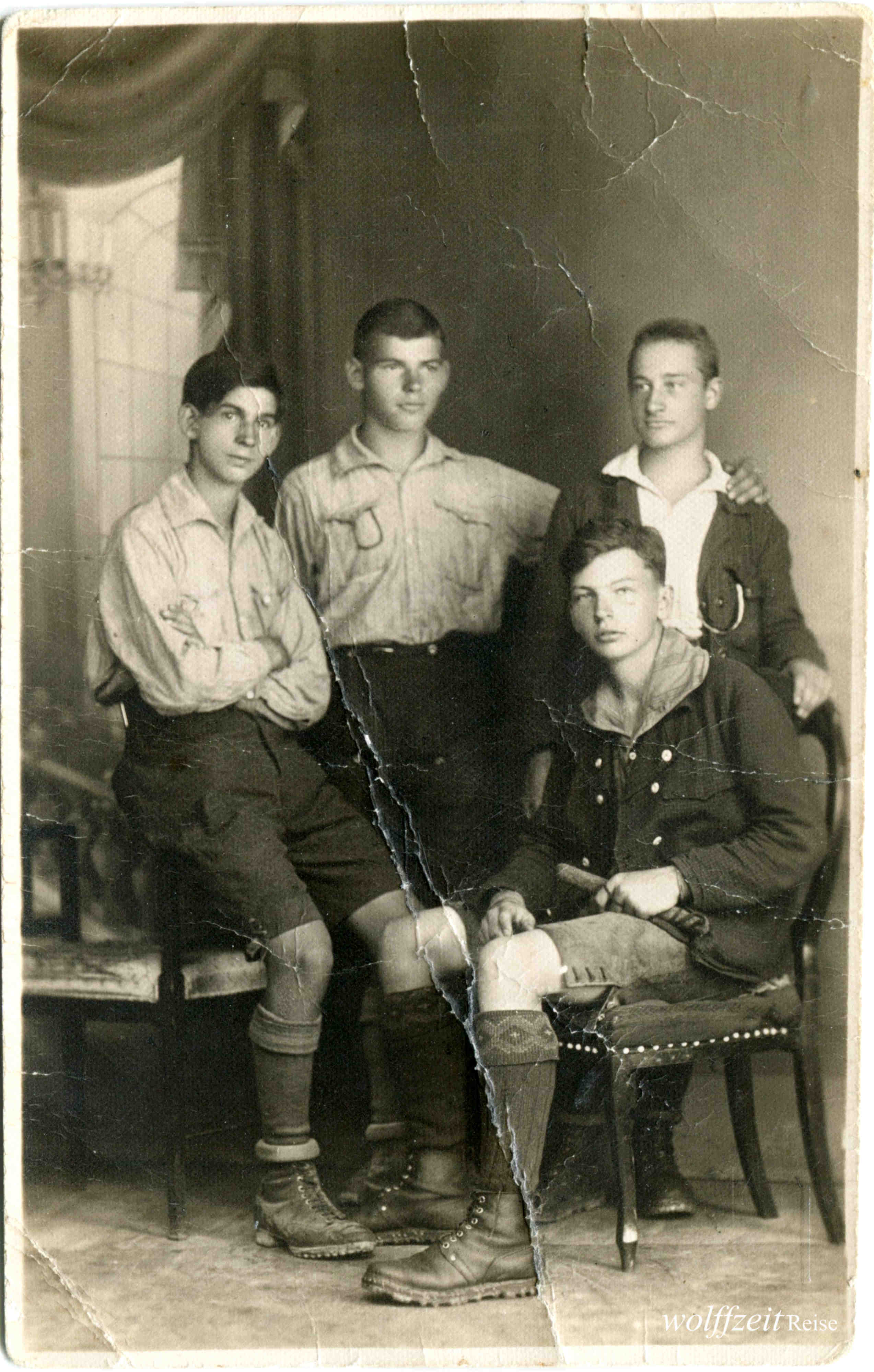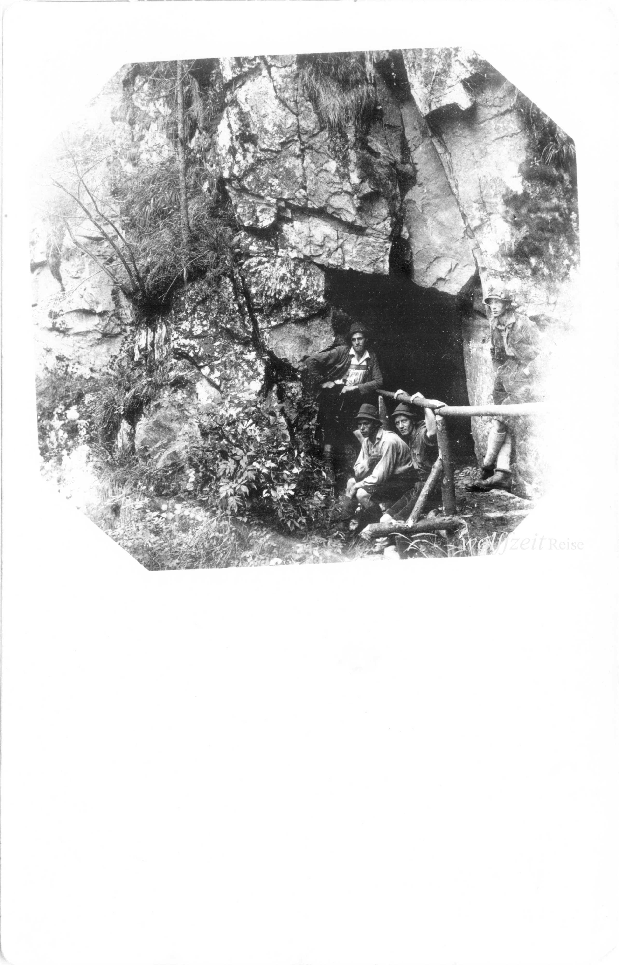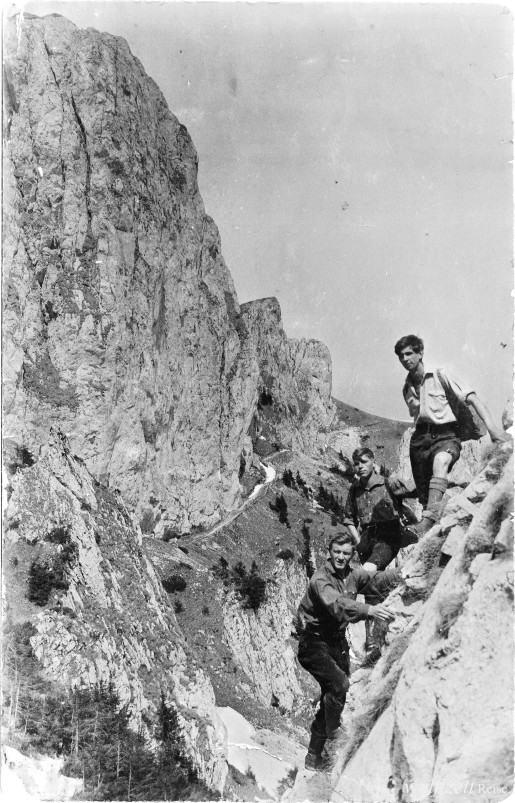 Die Fotos dieser Serie sind auf der Rückseite mit Datum und Text „Karl Lehmann, Brașov” gestempelt. Fotos aus dem Familienarchiv.Tură în munții Bârsei, Bucegi și Ciucaș cu Josef Habicher (1904-1945), legendarul ghid montan Karl Lehmann (1894-1990) și prieteni SKV / 1925. Bunicul meu, sibianul Josef / Jos Habicher, este tânărulul din mijloc, între Michael Bonfert (sus) și Karl Lehmann (jos), în fotografia a doua.