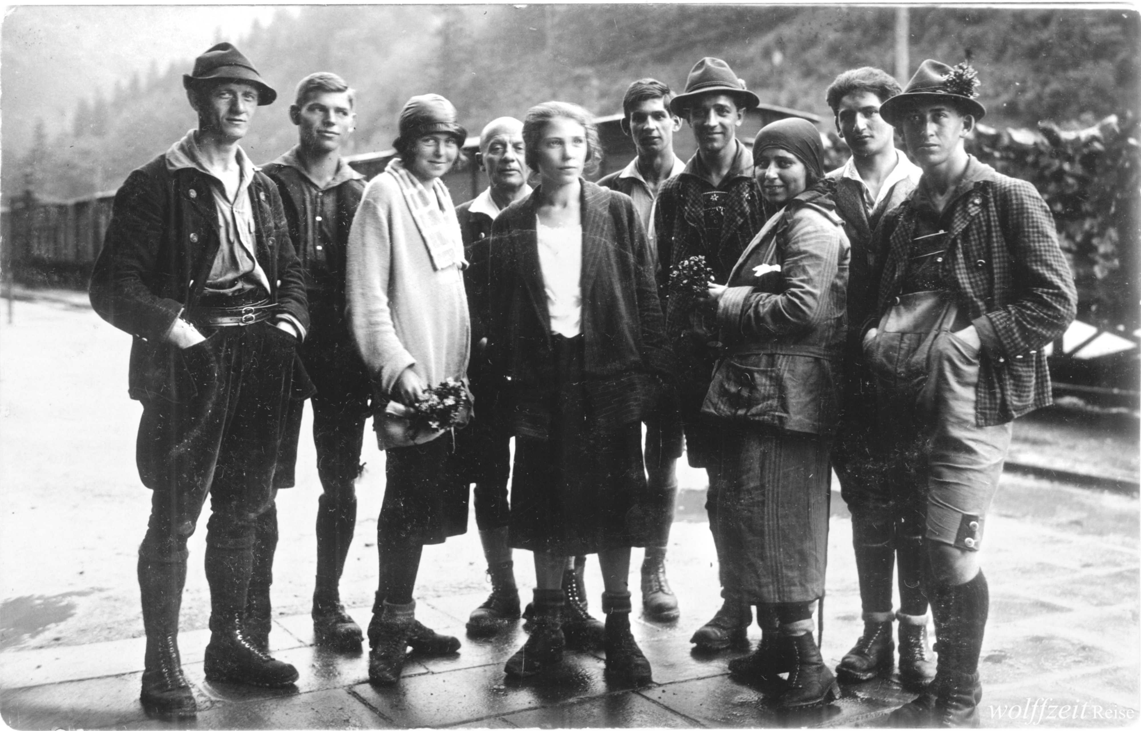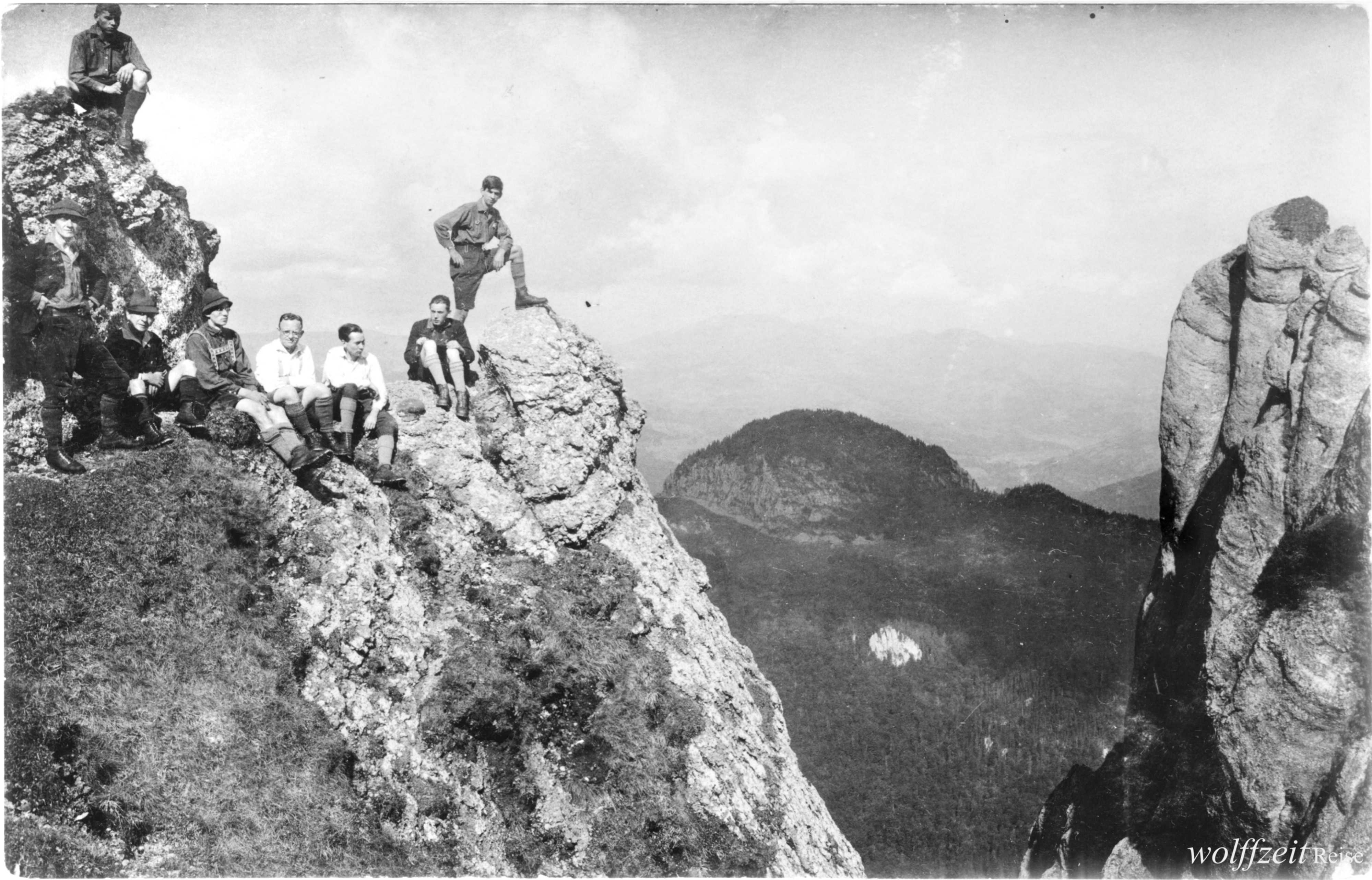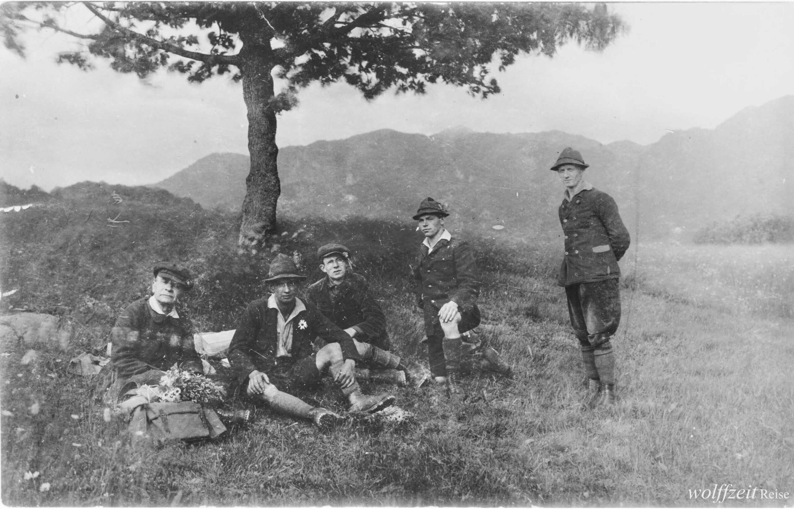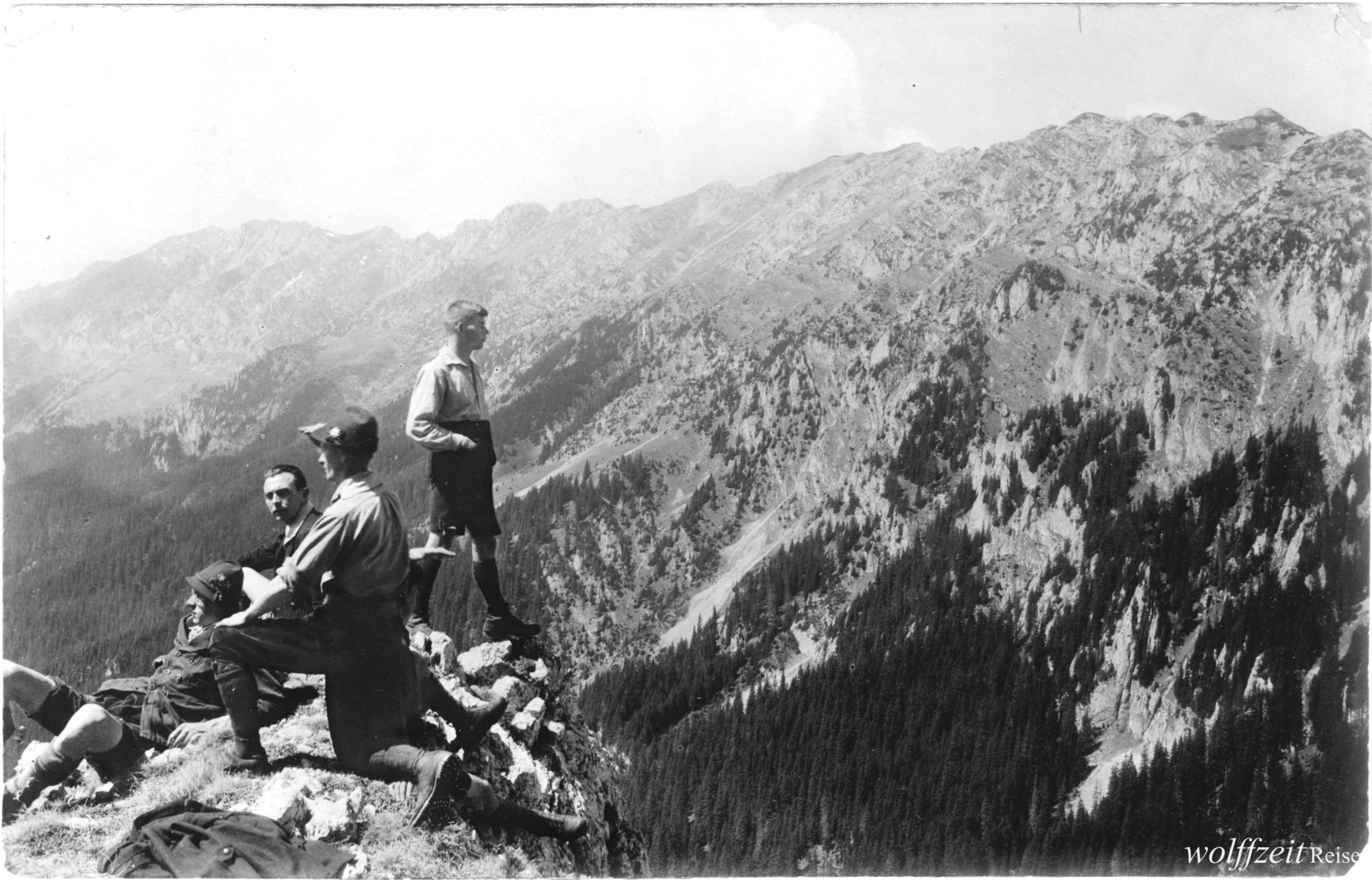 Dieses Foto, aufgenommen im September 1924, zeigt Josef Habicher aus Hermannstadt mit Freunden aus Kronstadt nach der Bewältigung der Kammwanderung Schweindorf – Zernen/ Königstein im Fogarascher Gebirge.