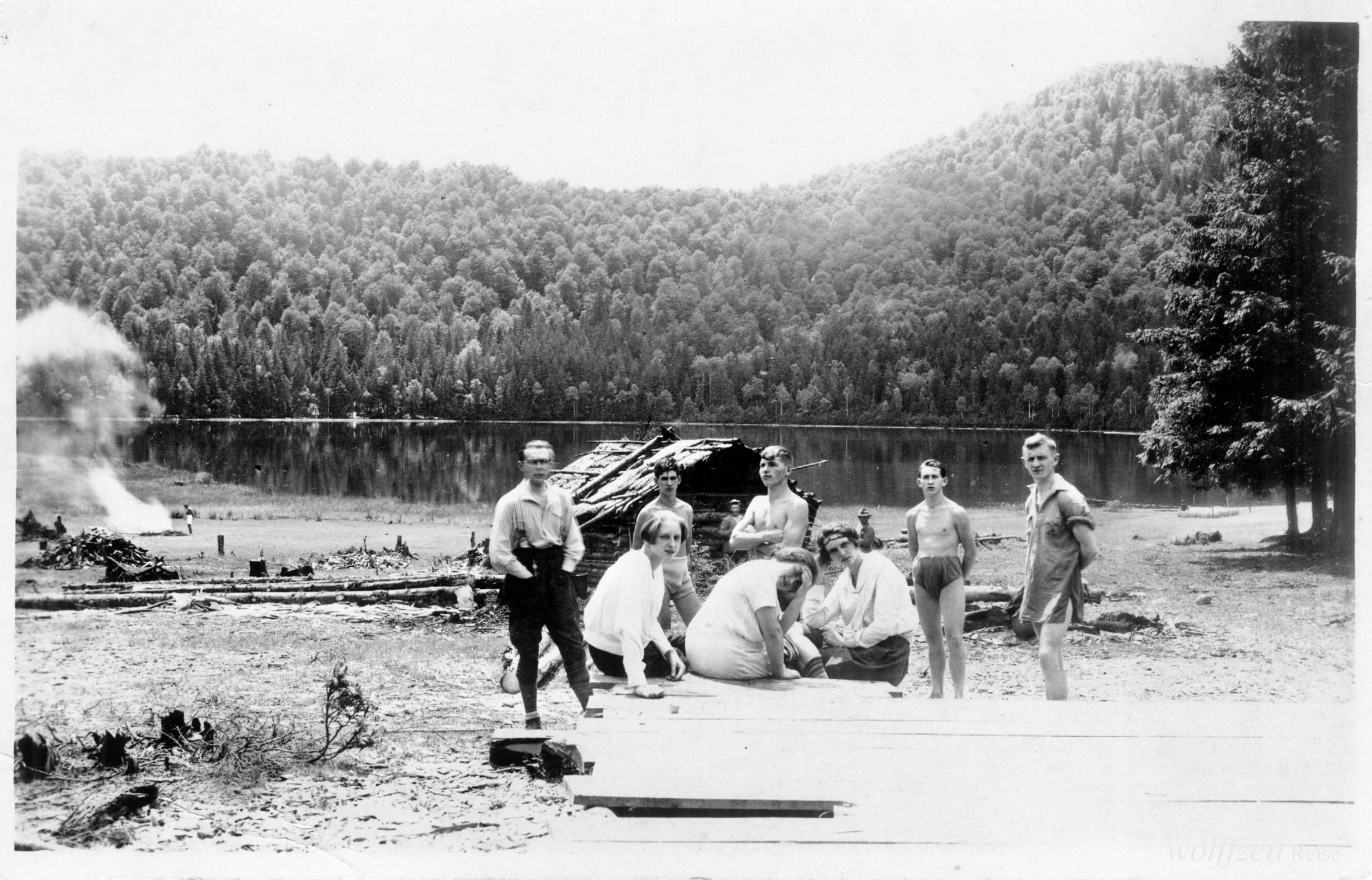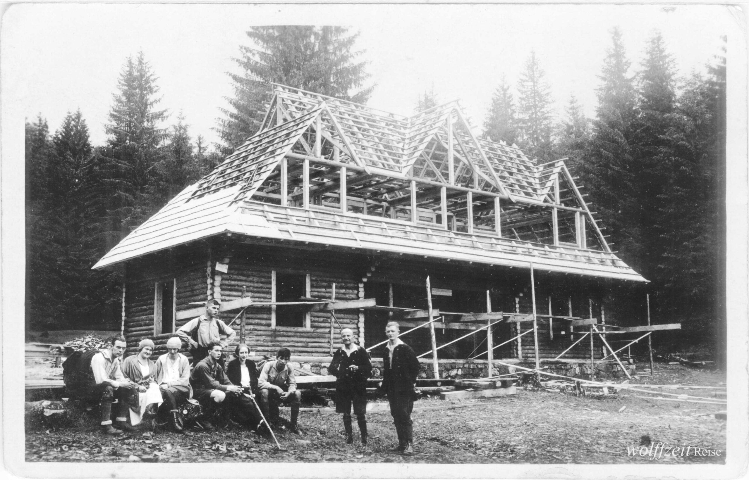 Die Fotos dieser Serie sind auf der Rückseite mit folgendem Text gestempelt: Karl Lehmann, Brașov. Fotos aus dem Familienarchiv.Tură în munții Cindrel cu Josef Habicher (1904-1945), legendarul ghid montan Karl Lehmann (1894-1990) și prieteni SKV / 1925. Bunicul meu, sibianul Josef / Jos Habicher, este al doilea din dreapta în prima fotografie. Prietenul său Karl Lehmann șede pe bancă lângă femeie.