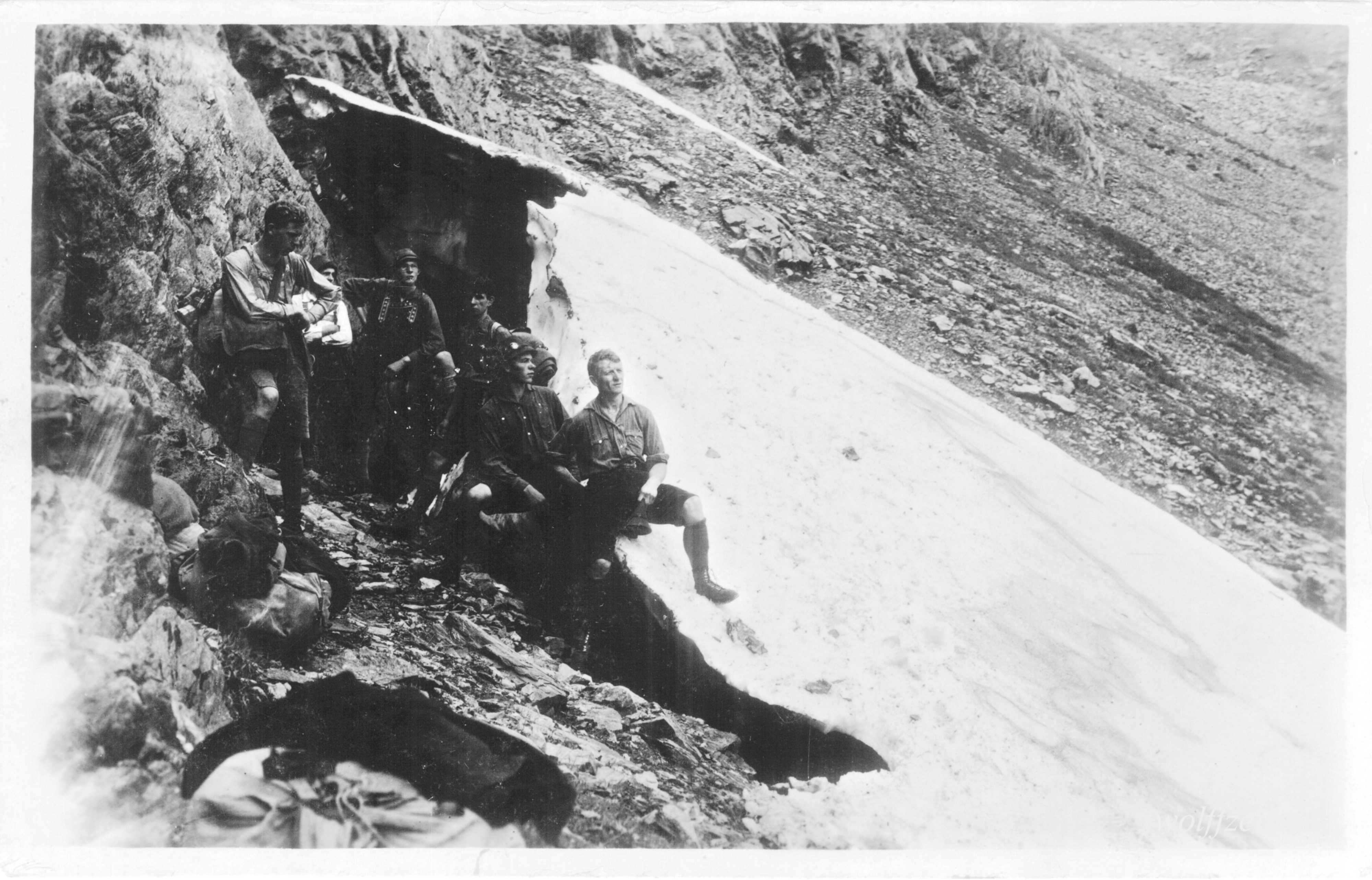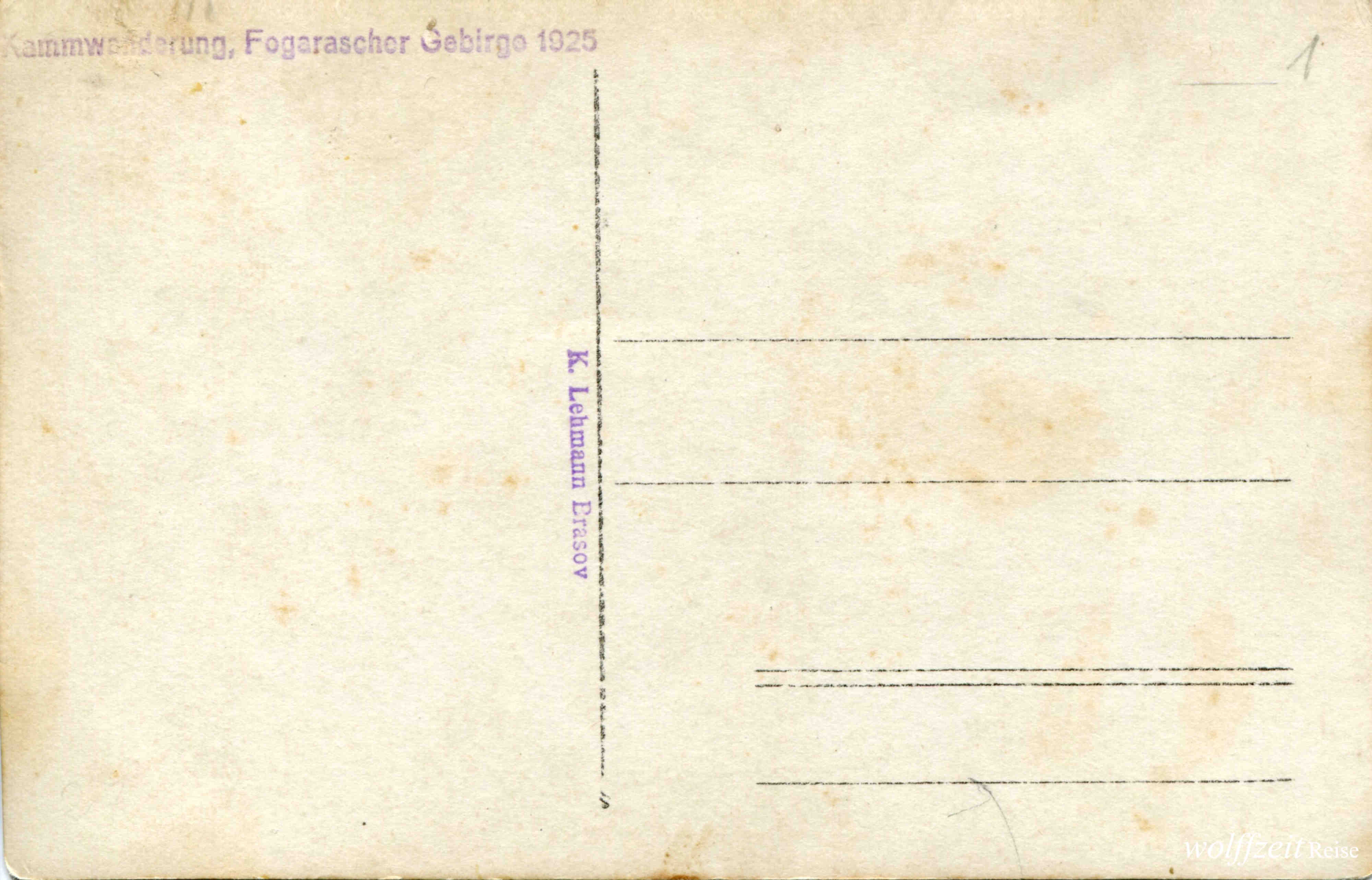 Die Fotos dieser Serie sind auf der Rückseite mit folgendem Text gestempelt: Kammwanderung, Fogarascher Gebirge 1925 und Karl Lehmann, Brașov. Fotos aus dem Familienarchiv.Tură de creastă în munții Făgărașului cu Josef Habicher (1904-1945), legendarul ghid montan Karl Lehmann (1894-1990), Michael Bonfert și prieteni SKV / 1925. Bunicul meu, sibianul Josef / Jos Habicher este tânărulul din mijlocul prietenilor săi brașoveni în a doua fotografie. În dreapta șed Karl Lehmann și Michael Bonfert, prieten de familie al bunicului meu.