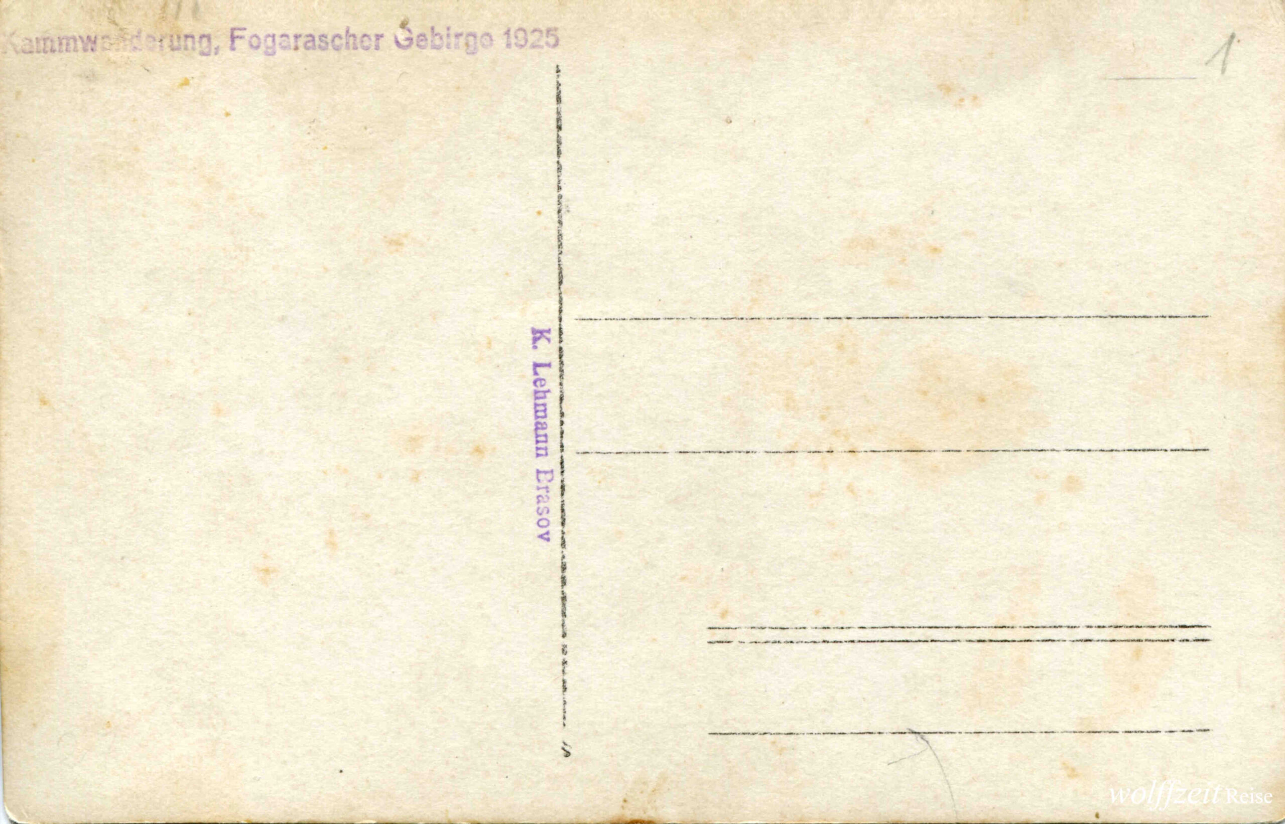 Fotografiile acestui set sunt ștampilate pe verso cu următorul text: Kammwanderung, Fogarascher Gebirge 1925 și Karl Lehmann, Brașov. Fotografii din arhiva familială.Königstein vom Burzental aus gesehen |1| Piatra Craiului privit dinspre valea Bârsei