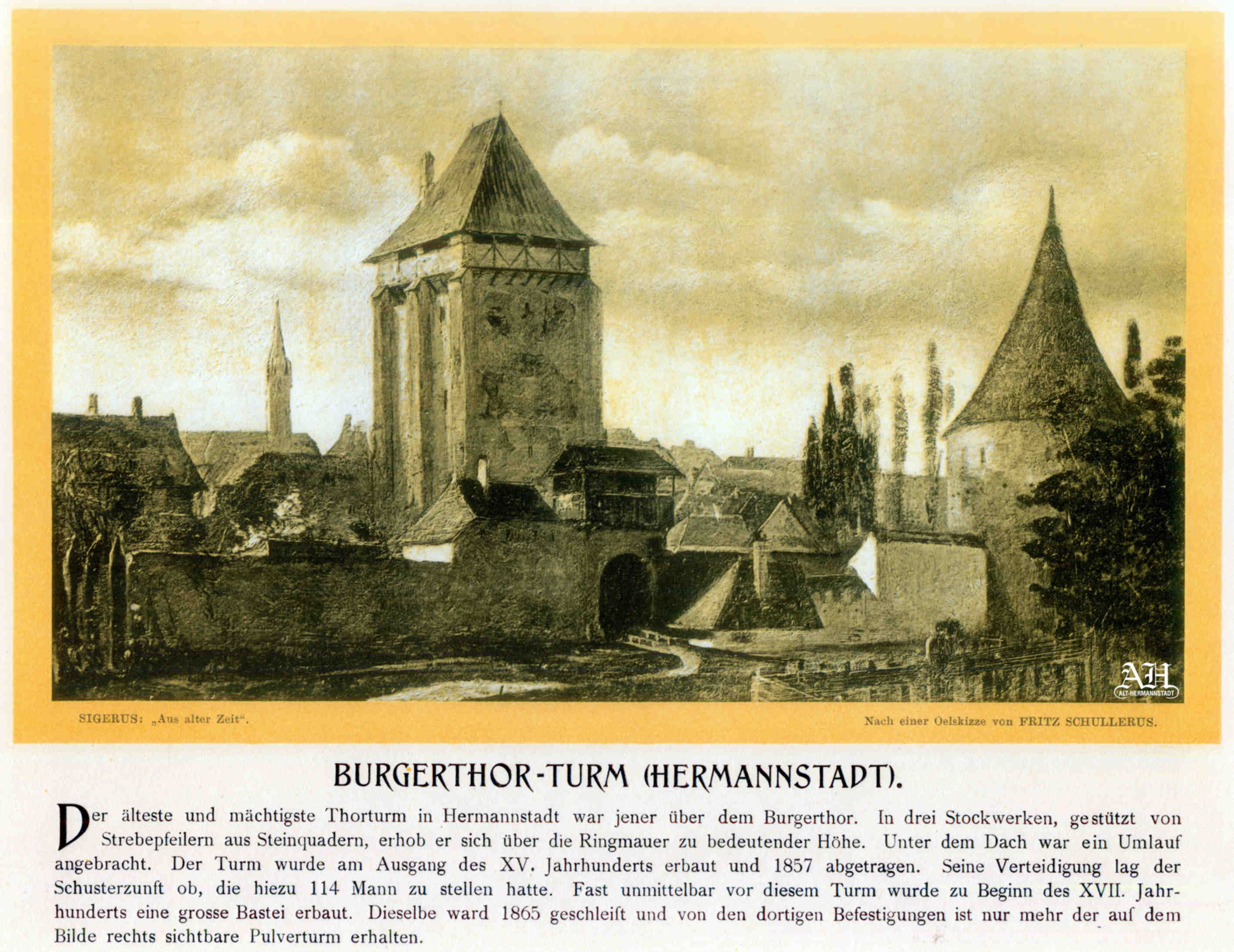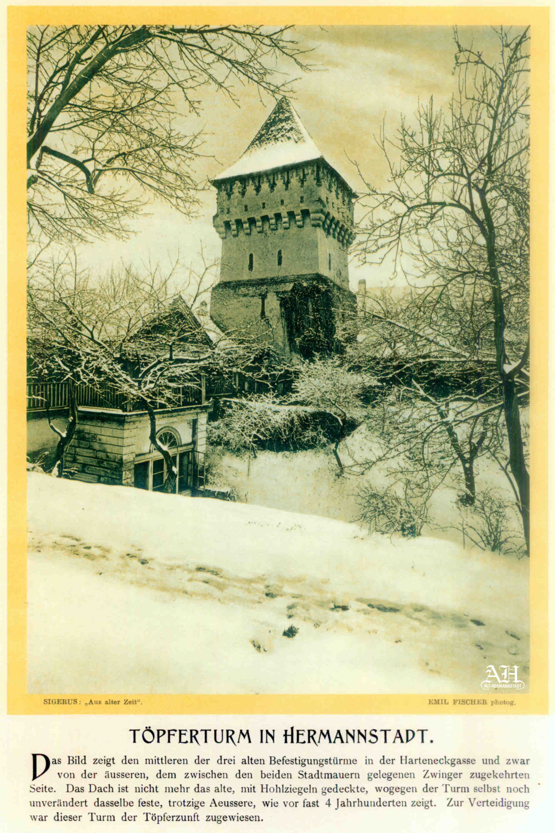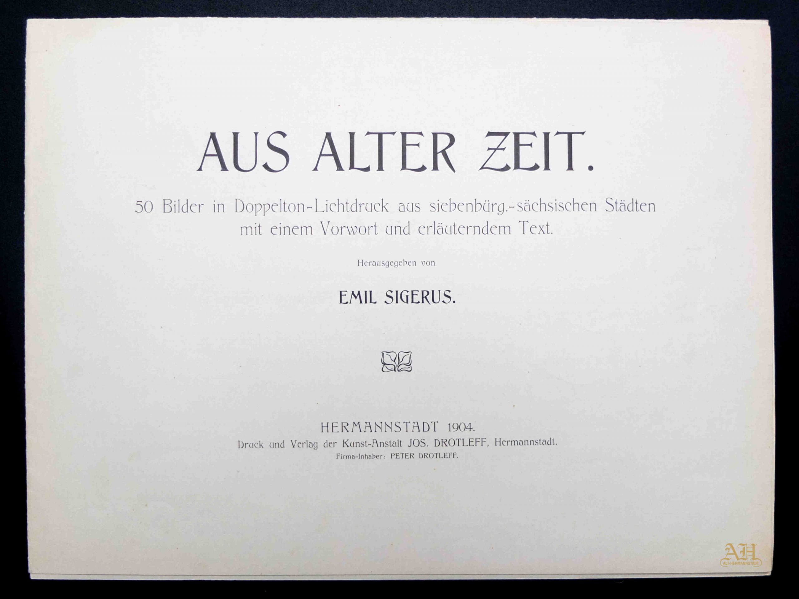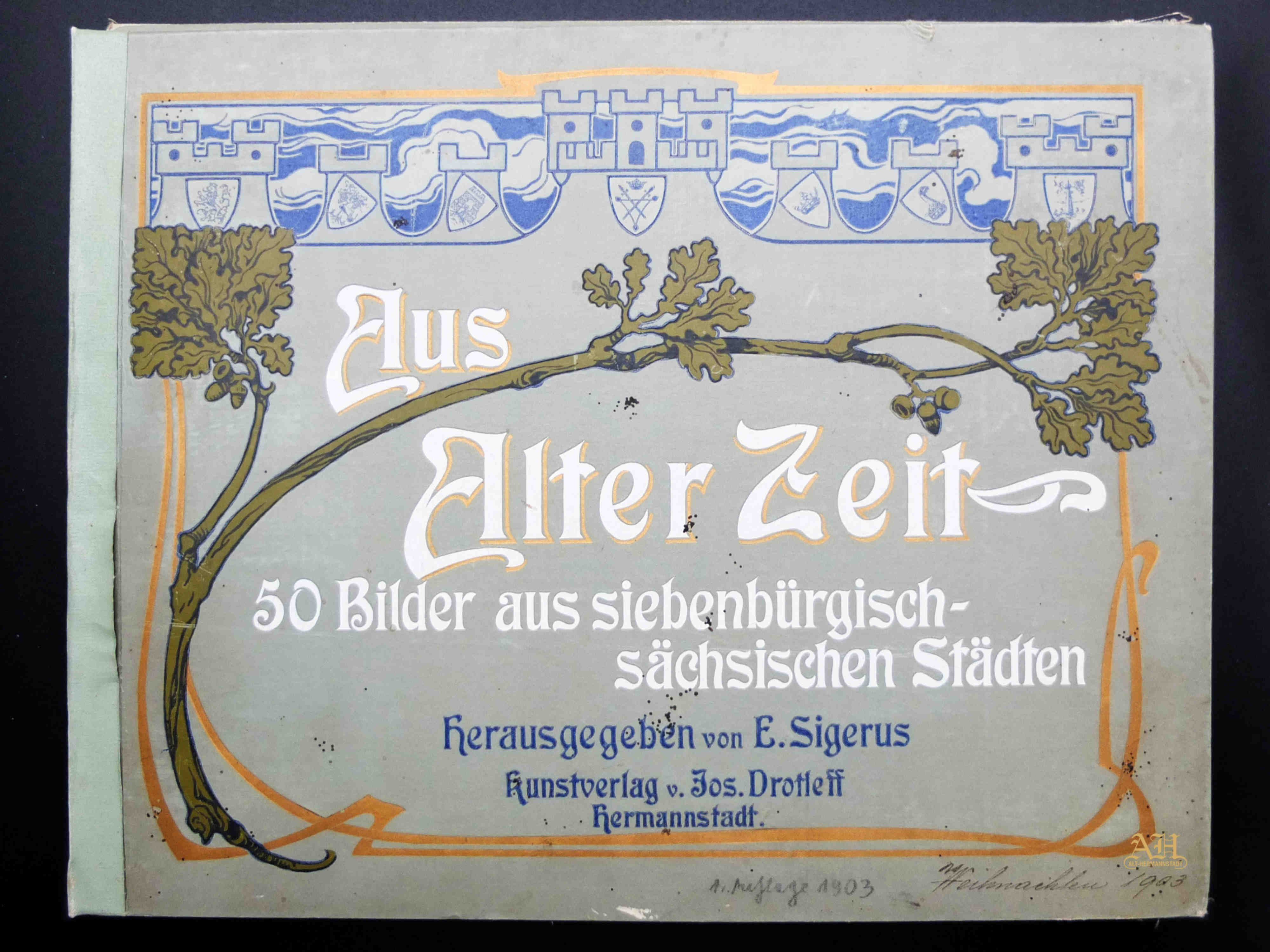 Albumul Siebenbürgisch-Sächsische Burgen und Kirchenkastelle // Cetăți și Biserici fortificate săsești din Ardeal a fost editat de Emil Sigerus 1900 și tipărit la Institulul tipografic sibian „Kunstanstalt Jos. Drotleff, Hermannstadt“ / proprietar Peter Drotleff.