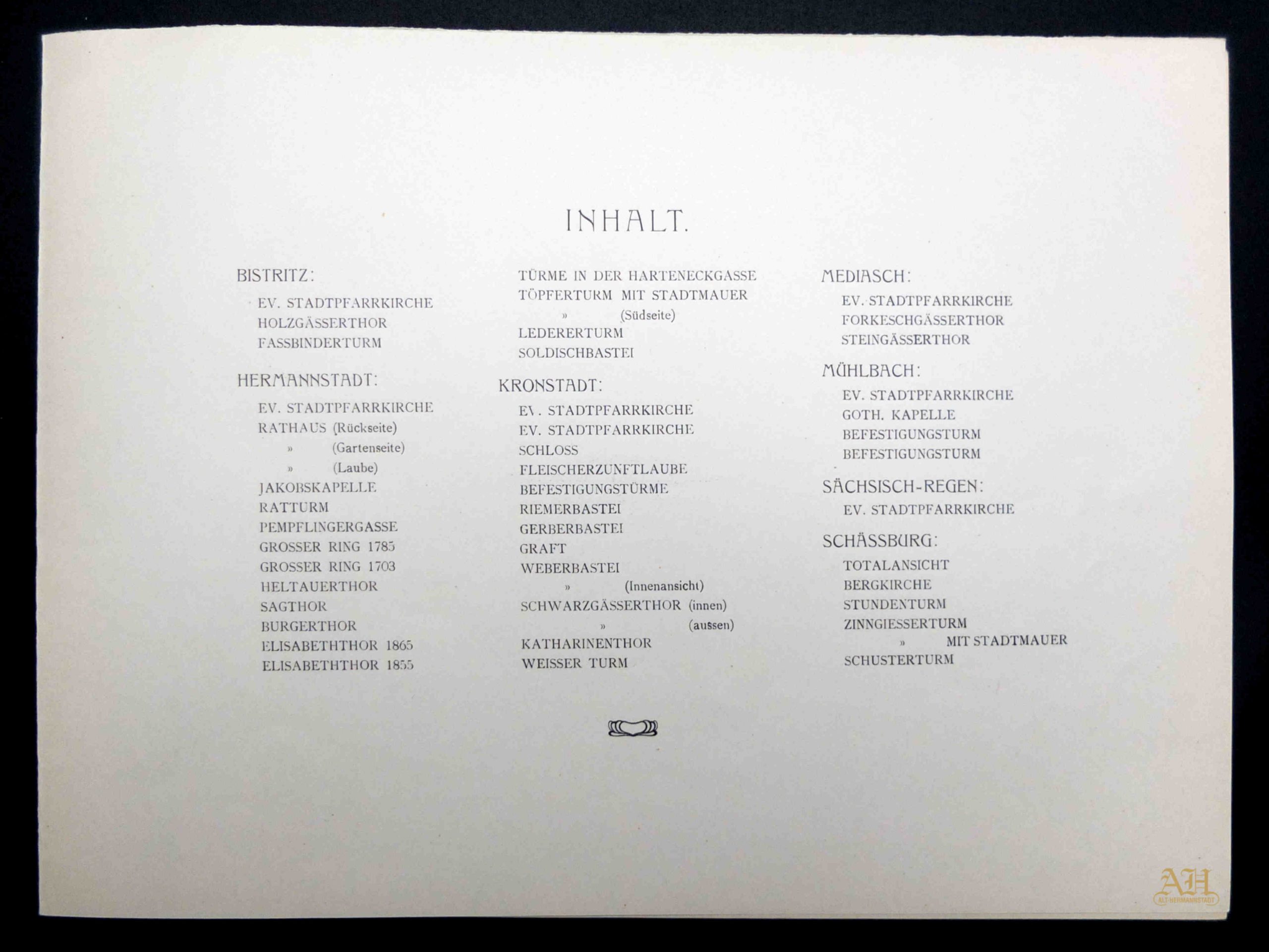 Albumul publicat 1901 conține 50 de foi cu ilustrații realizate după fotografii prin procedeul tiparului plan Phototypie. Foile cu dimensiunile de 33×24 cm redau 50 instantanee din 48 localități săsești din Ardeal. Acest exemplar se află în colecția Helmut Wolff (anterior Langstein). -
