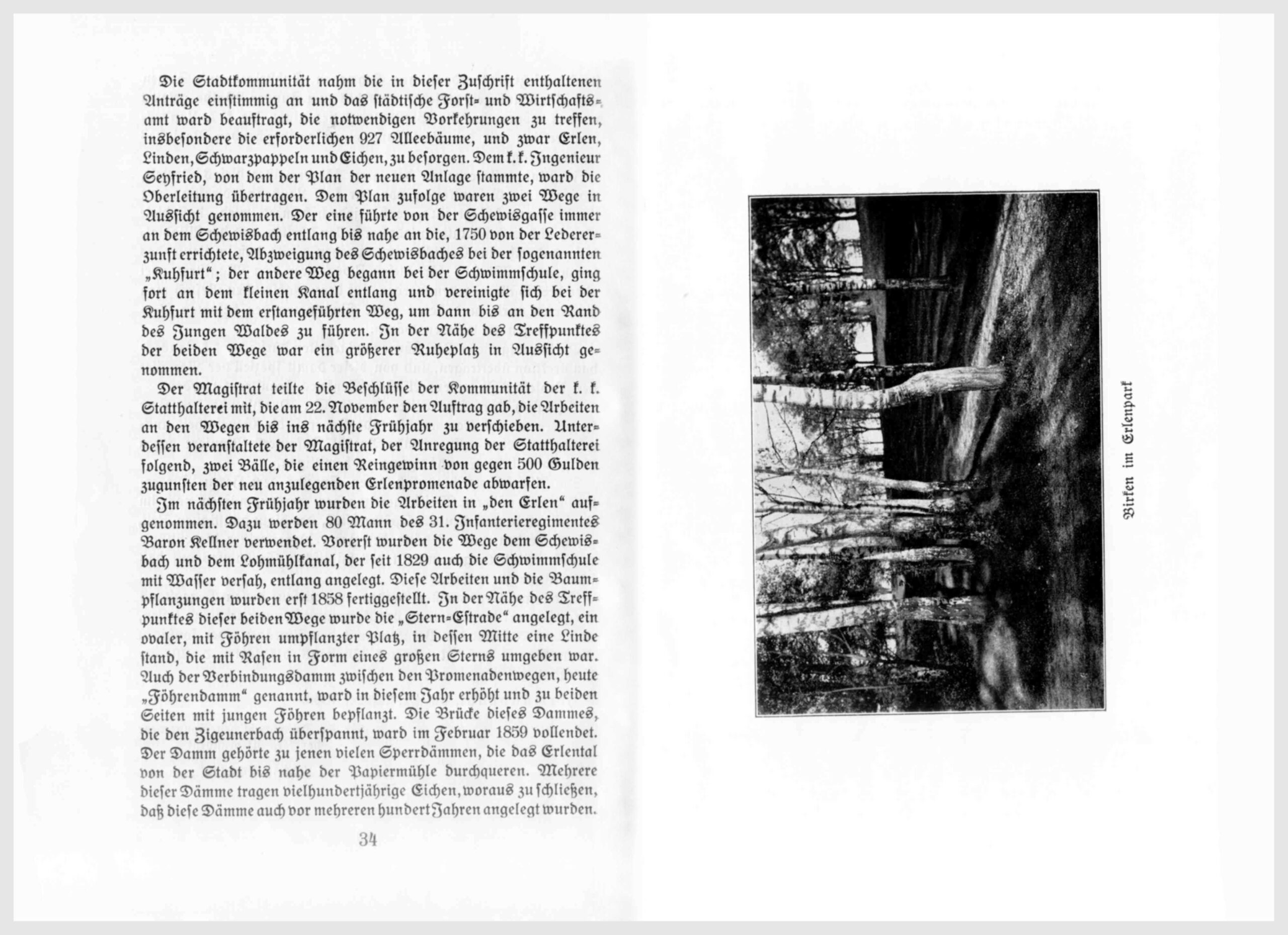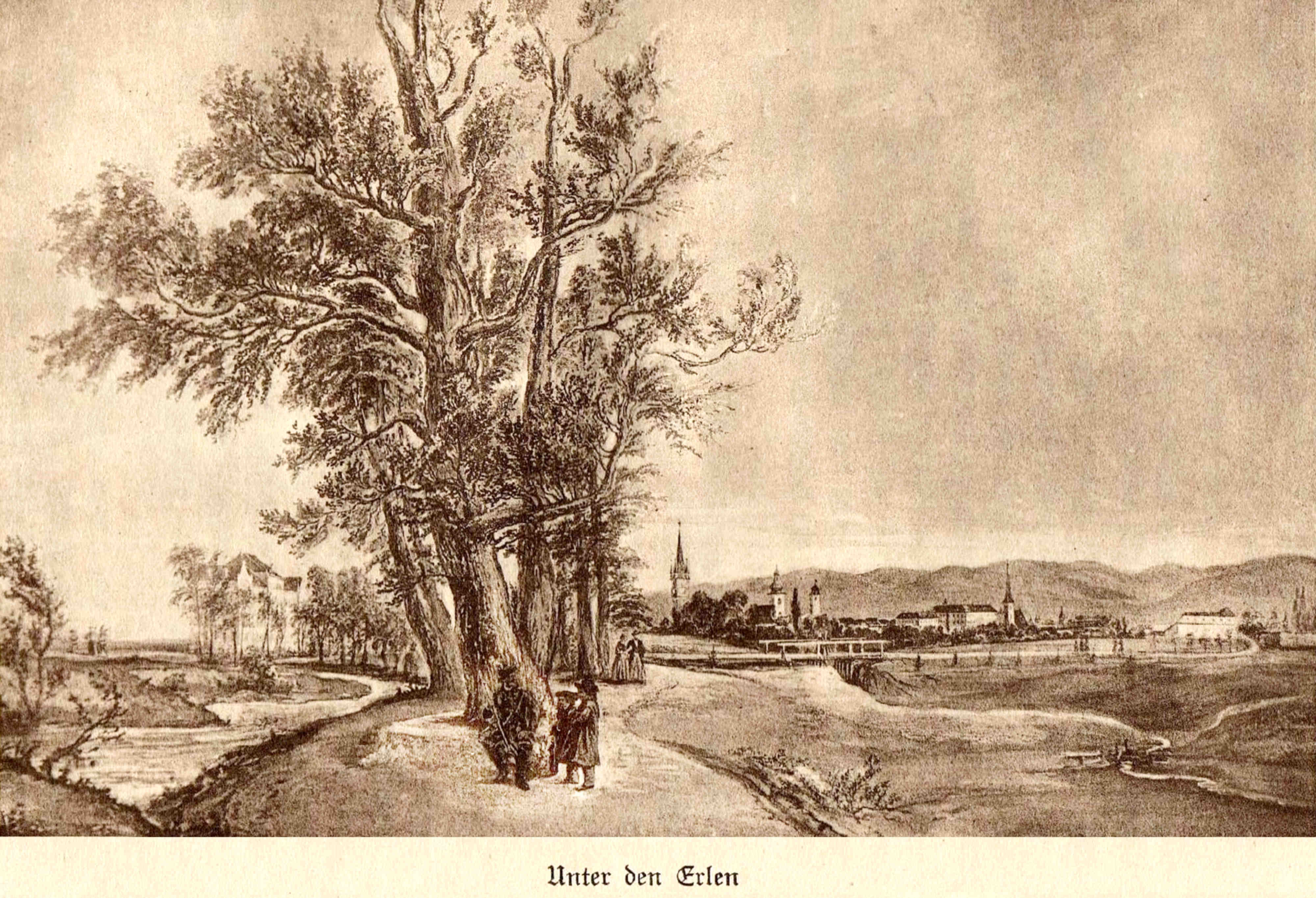 Der Musikpavillon unter den Erlen wurde im Jahre 1898 nach den Plänen des Architekten Eder ausgeführt und ist in den folgenden Jahren zu Konzerten der Militärkapelle fleißig benützt worden, so daß dieser Teil des Erlenparkes auch infolge der Errichtung einer Erfrischungsstelle (Konditorei Frentz) im Hause bei den Glashäusern, und später durch die Aufstellung des elektrischen Farbenspringbrunnens immer mehr der Mittelpunkt der Anlage wurde. In der Nähe prangten die stolzen Blüten des Rosenhügels und glühte die herrliche Farbenpracht des Teppichbeetes. In einem Miniaturteich spreizten sich gravitätisch die Wasserrosen. Es war ein hoher Genuß damals durch die Anlagen zu schreiten, und wir können feststellen und erkennen, daß ein Höhepunkt in der Entwicklung des Vereins erreicht war. – In einer Zuschrift des Stadtmagistrates wurde im Jahre 1898 um Übernahme sämtlicher Anlagen in der Stadt in die Pflege und Besorgung des Verschönerungsvereins und um die Bepflanzung mehrerer Straßenzüge angesucht. Diesem Ansuchen entsprach der Verein, revidierte die alten Baumbestände in unseren Gassen und Plätzen und führte die Neubepflanzung der Hallerwiese, der Schewis-, Josef-, Schul- und Ranichergasse, des Viehmarkt- und Konradplatzes durch.