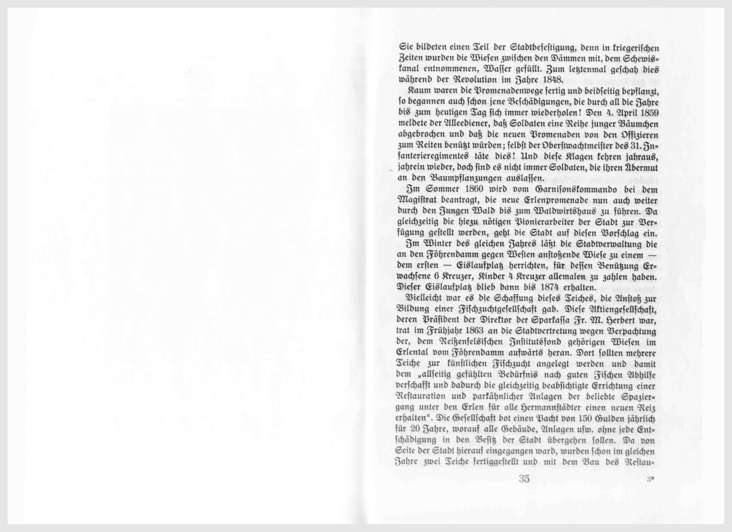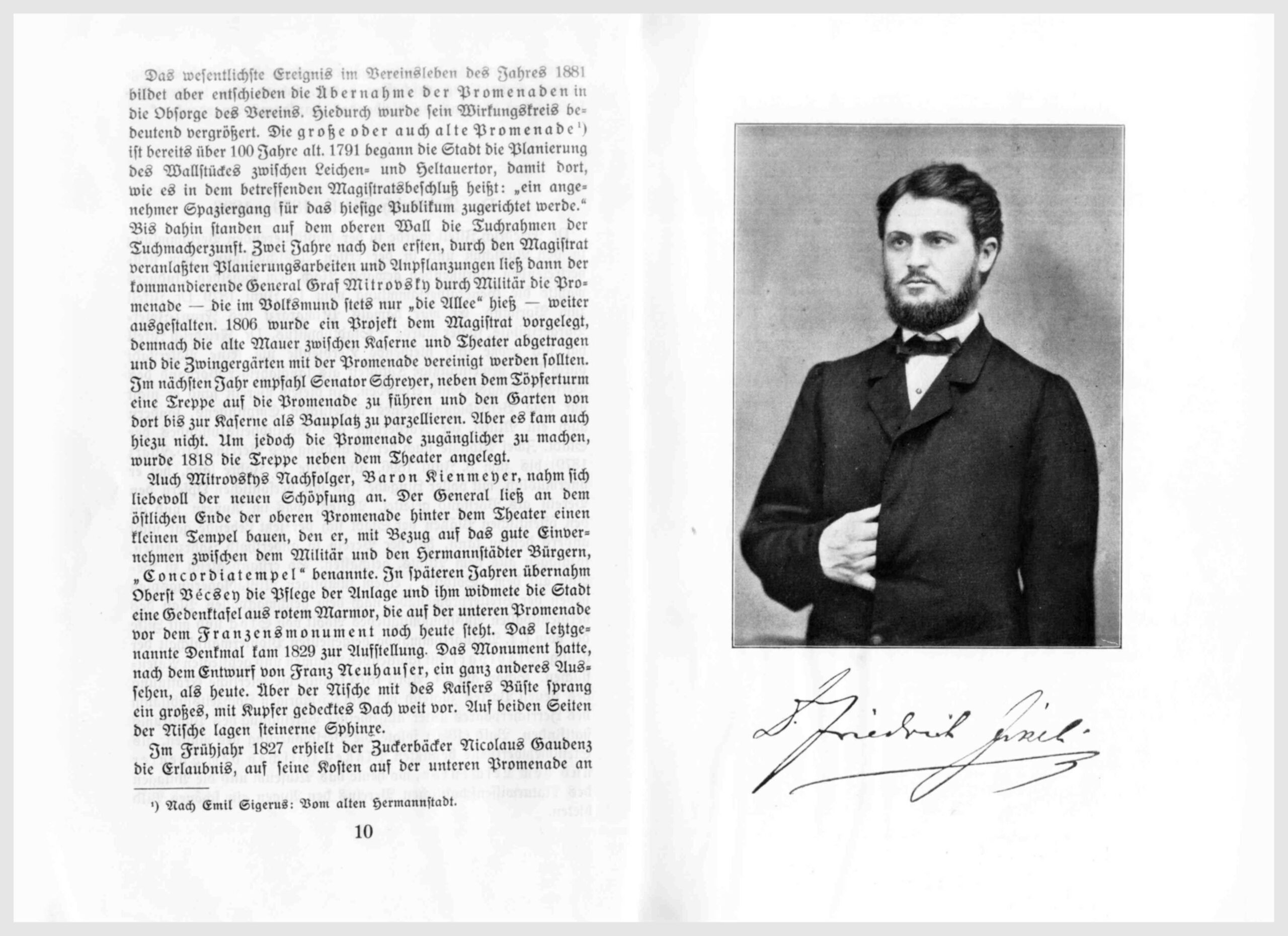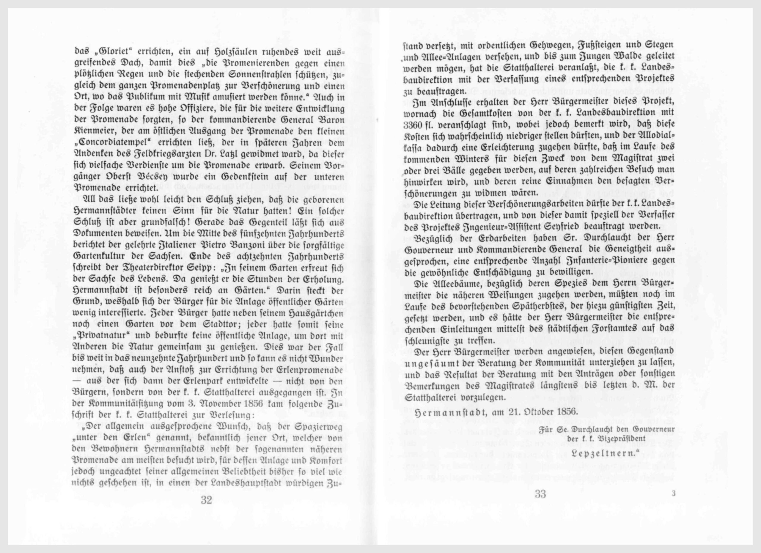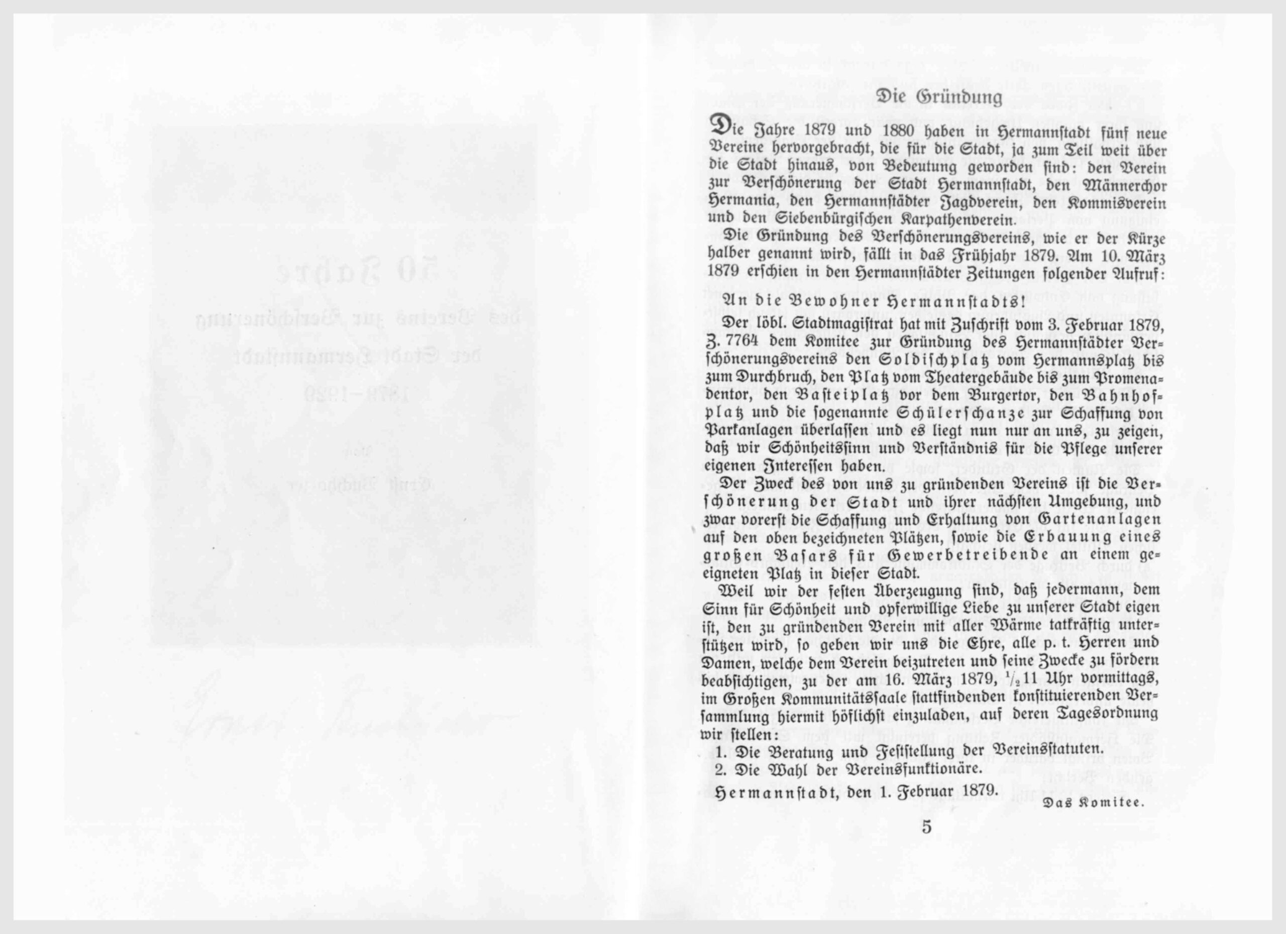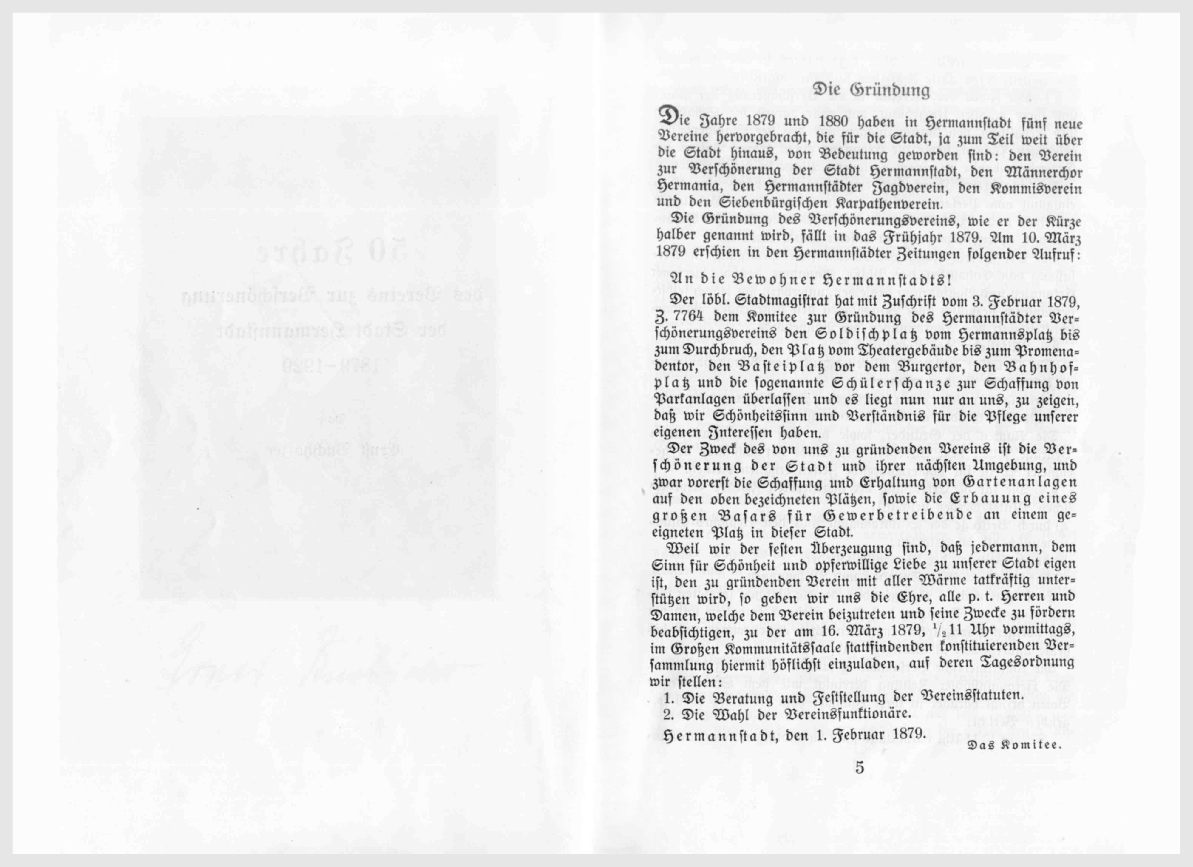 Der löbl. [löblich] Stadtmagistrat hat mit Zuschrift vom 3. Februar 1879, Z. 7764 dem Komitee zur Gründung des Hermannstädter Verschönerungsvereins den Soldischplatz vom Hermannsplatz bis zum Durchbruch, den Platz vom Theatergebäude bis zum Promenadentor, den Basteiplatz vor dem Burgertor, den Bahnhofplatz und die sogenannte Schülerschanze zur Schaffung von Parkanlagen überlassen und es liegt nun an uns, zu zeigen, daß wir Schönheitssinn und Verständnis für die Pflege unserer eigenen Interessen haben.