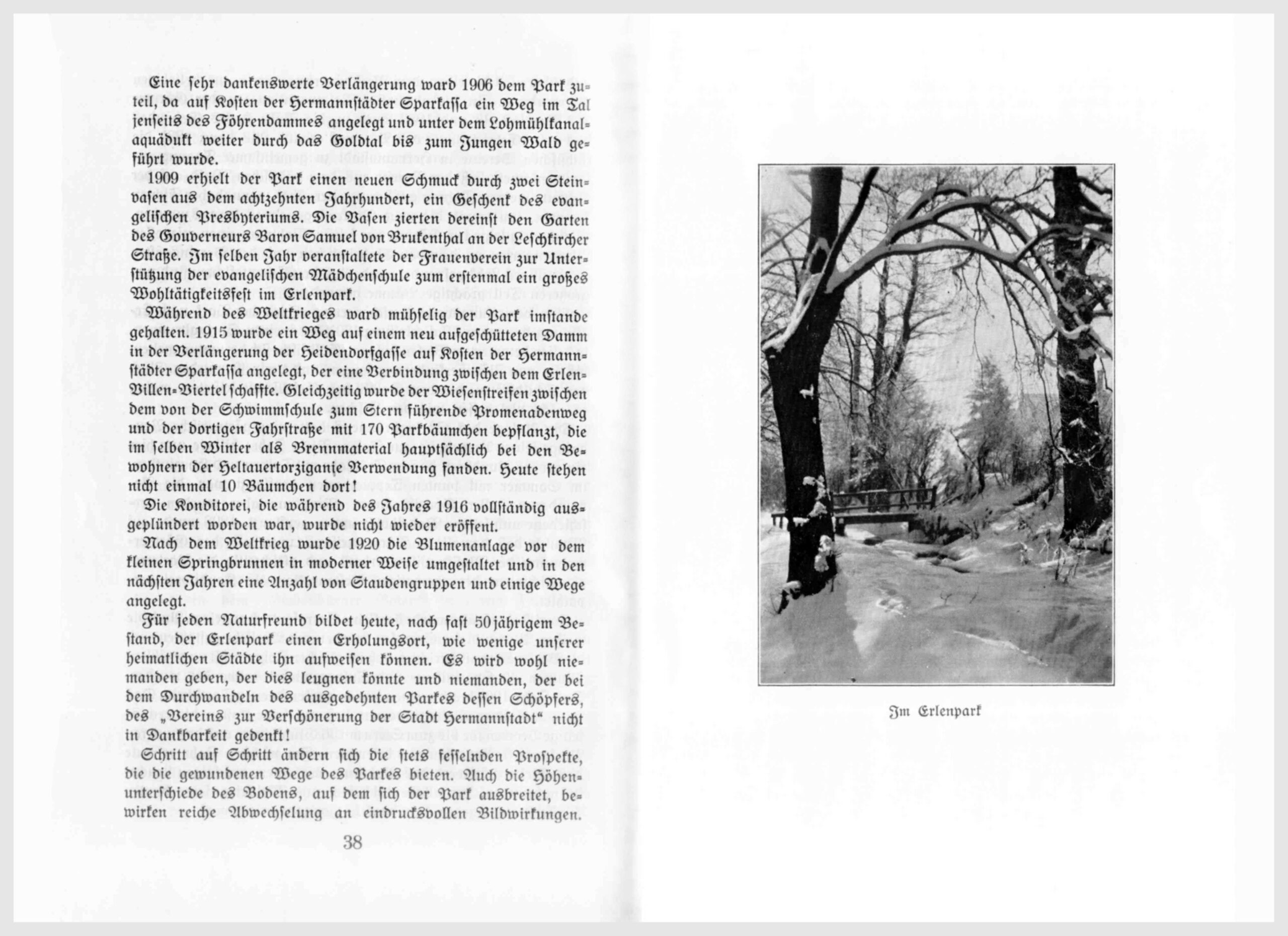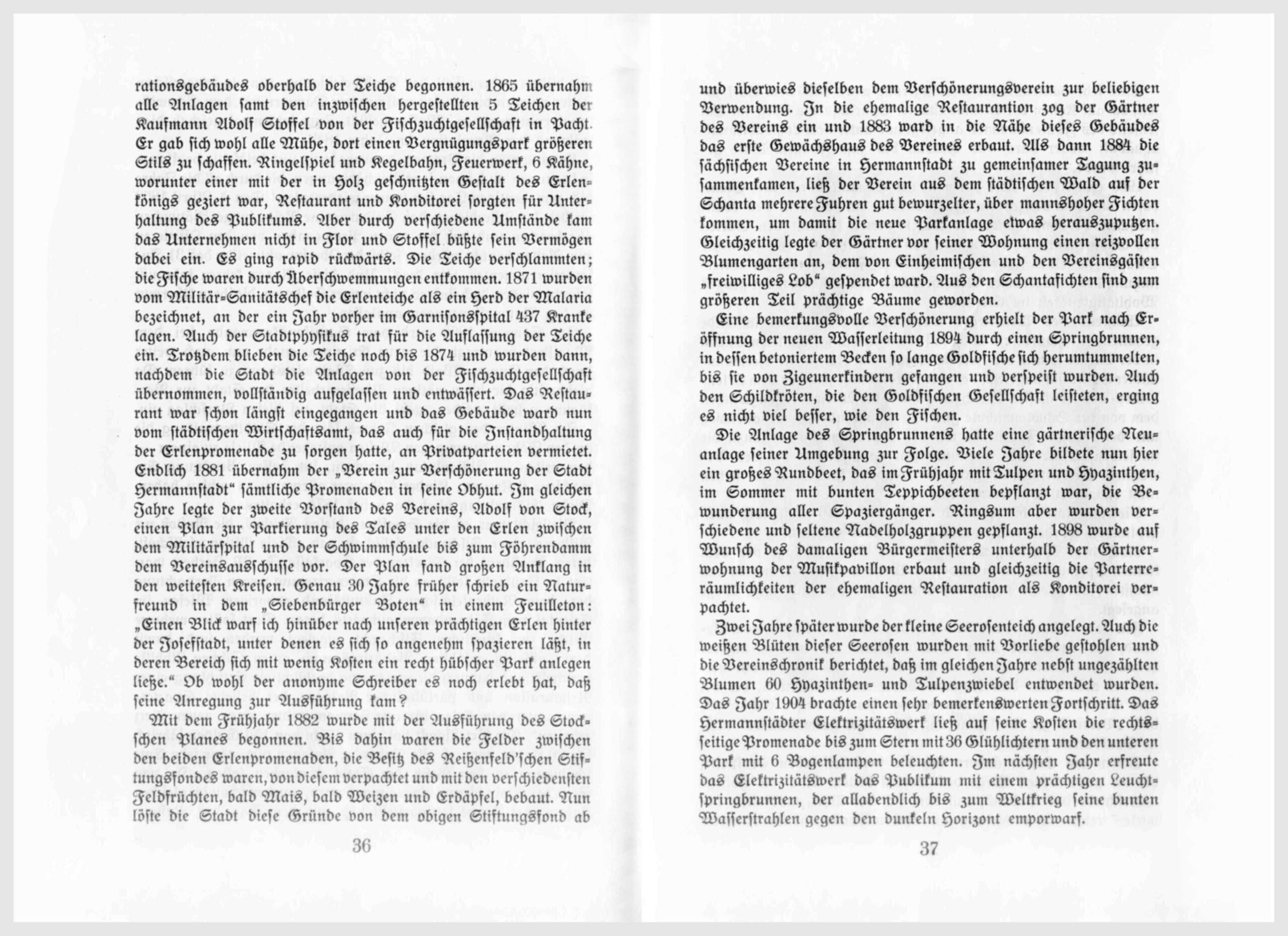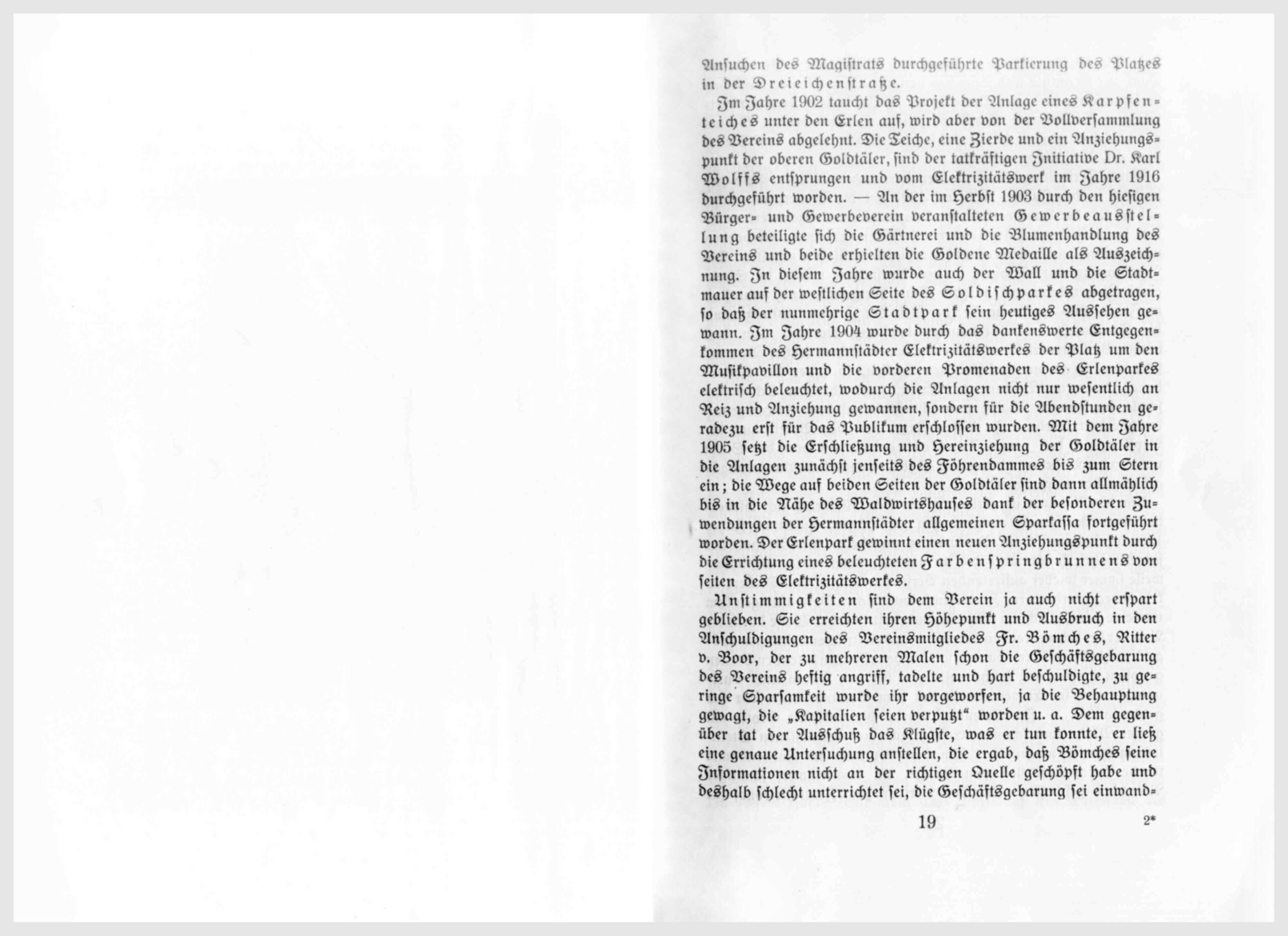 Im Jahre 1902 taucht das Projekt der Anlage eines Karpfenteiches unter den Erlen auf, wird aber von der Vollversammlung des Vereins abgelehnt. Die Teiche, eine Zierde und ein Anziehungspunkt der oberen Goldtäler, sind der tatkräftigen Initiative Dr. Karl Wolffs entsprungen und vom Elektrizitätswerk im Jahre 1916 durchgeführt worden. – An der im Herbst 1903 durch den hiesigen Bürger- und Gewerbeverein veranstalteten Gewerbeausstellung beteiligte sich die Gärtnerei und die Blumenhandlung des Vereins und beide erhielten die Goldene Medaille als Auszeichnung. In diesem Jahre wurde auch der Wall und die Stadtmauer auf der westlichen Seite des Soldischparkes abgetragen, so daß der nunmehrige Stadtpark sein heutiges Aussehen gewann. Im Jahre1904 wurde durch das dankenswerte Entgegenkommen des Hermannstädter Elektrizitätswerkes der Platz um den Musikpavillon und die vorderen Promenaden des Erlenparkes elektrisch beleuchtet, wodurch die Anlagen nicht nur wesentlich an Reiz und Anziehung gewannen, sondern für die Abendstunden geradezu erst für das Publikum erschlossen wurden. Mit dem Jahre 1905 setzt die Erschließung und Hereinziehung der Goldtäler in die Anlagen zunächst jenseits des Föhrendammes bis zum Stern ein; die Wege auf beiden Seiten der Goldtäler sind dann allmählich bis in die Nähe Waldwirtshauses dank der besonderen Zuwendungen der Hermannstädter allgemeinen Sparkassa fortgeführt worden. Der Erlenpark gewinnt einen neuen Anziehungspunkt durch die Errichtung eines beleuchteten Farbenspringbrunnens von seiten der Elektrizitätswerkes.