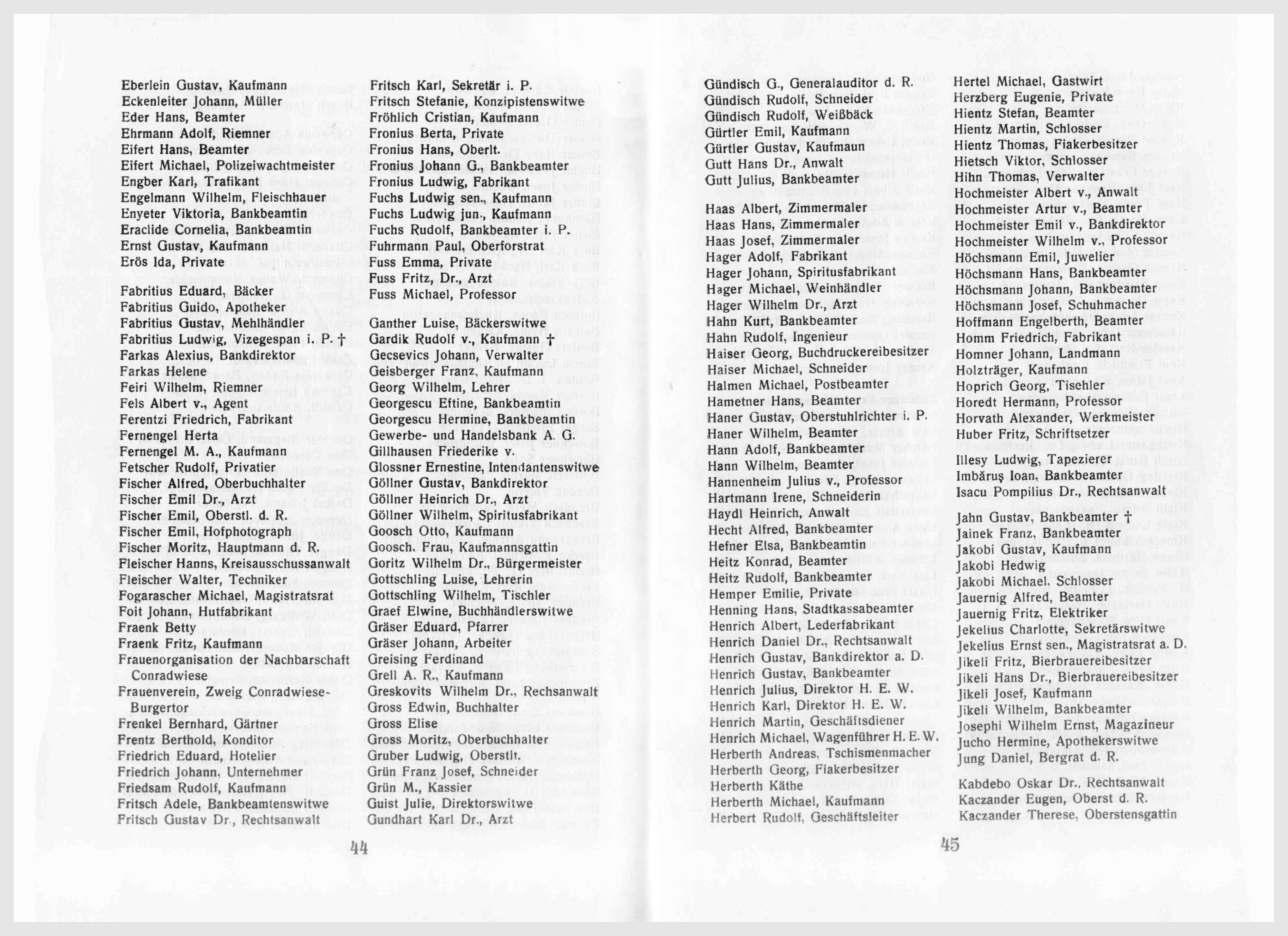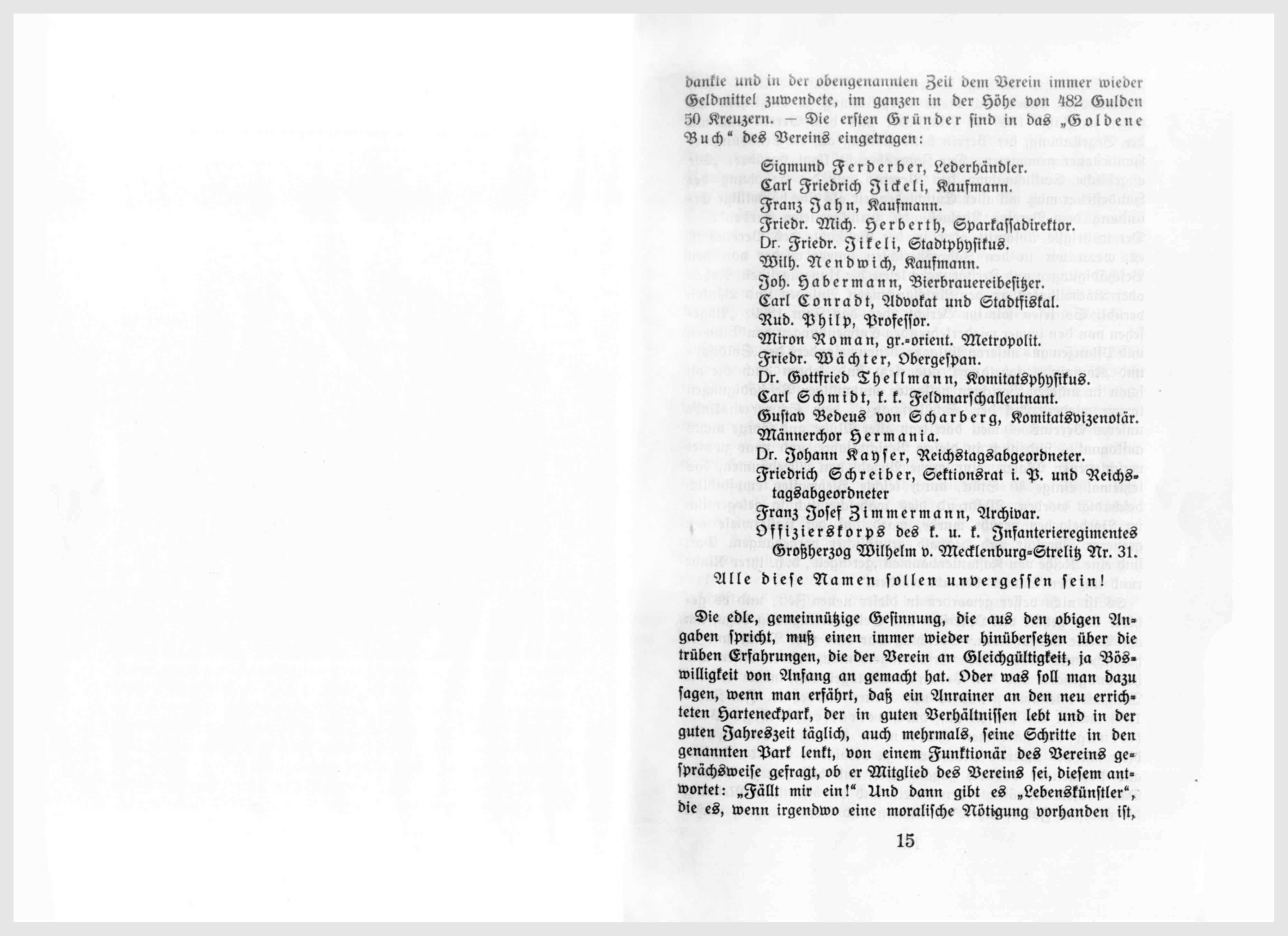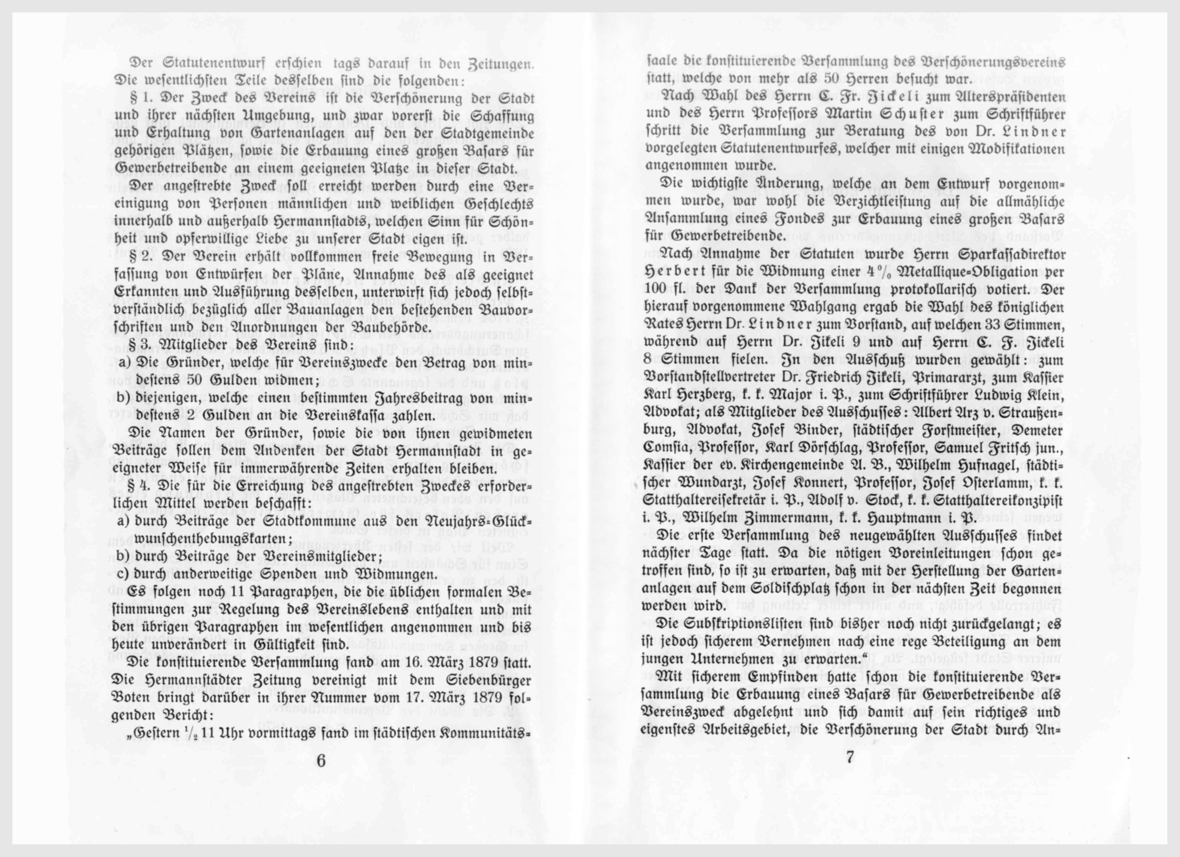 Nach Annahme der Statuten wurde Herrn Sparkassadirektor Herbert für die Widmung einer 4% Metallique-Obligation per 100 fl. der Dank der Versammlung protokollarisch notiert. Der hierauf vorgenommene Wahlgang ergab die Wahl des königlichen Rates Herrn Dr. Lindner zum Vorstand, auf welchen 33 Stimme, während auf Herrn Dr. Jikeli 9 und auf Herrn C. F. Jickeli 8 Stimmen fielen. In den Ausschuß wurden gewählt: zum Vorstandstellvertreter D. Friedrich Jikeli, Primararzt, zum Kassier Karl Herzberg, k.k. Major i. P., zum Schriftführer Ludwig Klein, Advokat; als Mitglieder des Ausschusses: Albert Arz v. Straußenburg, Advokat, Josef Binder, städtischer Forstmeister, Demeter Comsia, Professor, Karl Dörschlag, Professor, Samuel Fritsch, städtischer Wundarzt, Josef Konnert, Professor, Josef Osterlamm, k. k. Statthaltereisekretär i. P., Adolf v. Stock, k. k. Statthaltereikonzipist i, P., Wilhelm Zimmermann, k. k. Hauptmann i. P.
