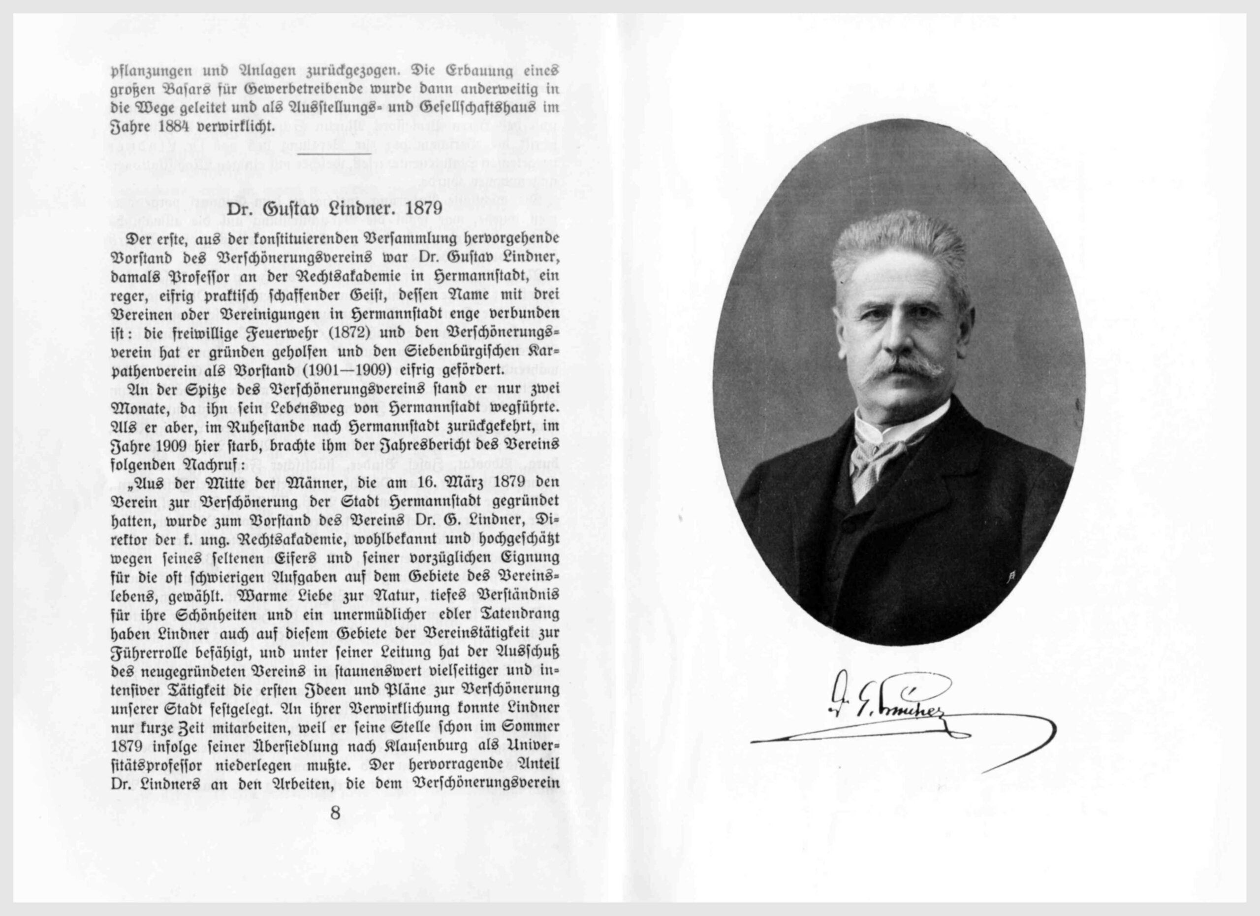 „Aus der Mitte der Männer, die am 16. März 1879 den Verein zur Verschönerung der Stadt Hermannstadt gegründet hatten, wurde zum Vorstand des Vereins Dr. G. Lindner, Direktor de k. ung. Rechtsakademie, wohlbekannt und hochgeschätzt wegen seines seltenen Eifers und seiner vorzüglichen Eignung für die oft schwierigen Aufgaben auf dem Gebiete des Vereinslebens, gewählt. Warme Liebe zur Natur, tiefes Verständnis für ihre Schönheit und ein unermüdlicher edler Tatendrang haben Lindner auch auf diesem Gebiete der Vereinstätigkeit zur Führerrolle befähigt, und unter seiner Leitung hat der Ausschuß des neugegründeten Vereins in staunenswert vielseitiger und intensiver Tätigkeit die ersten Ideen und Pläne zur Verschönerung unserer Stadt festgelegt. An ihrer Verwirklichung konnte Lindner nur kurze Zeit mitarbeiten, weil er seine Stelle schon im Sommer 1879 infolge seiner Übersiedlung nach Klausenburg als Universitätsprofessor niederlegen mußte. Der hervorragende Anteil Dr. Lindners an den Arbeiten, die dem Verschönerungsverein die feste Grundlage zu seiner späteren ersprießlichen und umfangreichen Entwicklung geschaffen haben, sichern ihm in der Geschichte des Vereins ein bleibendes, dankbares Andenken.“~~~o~~~