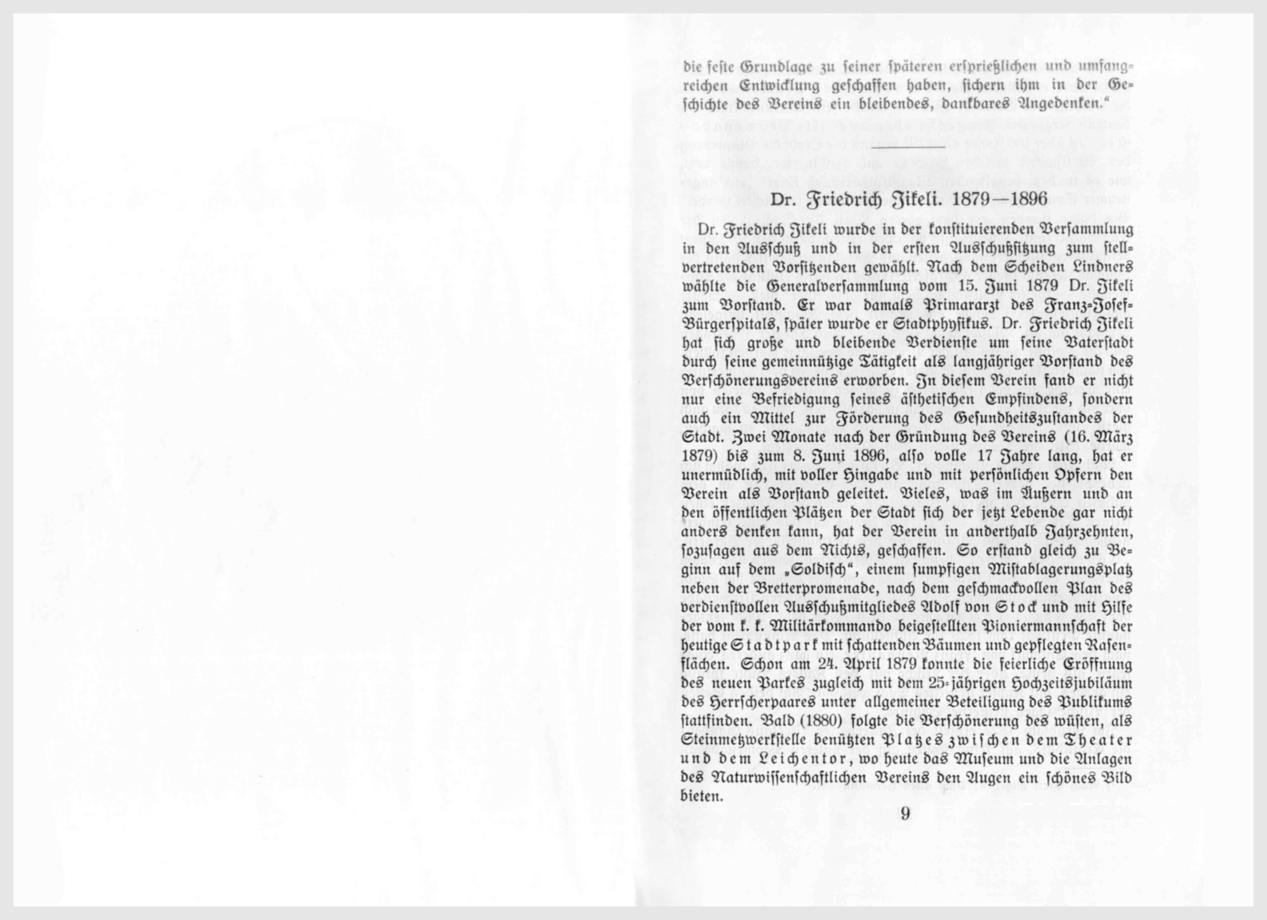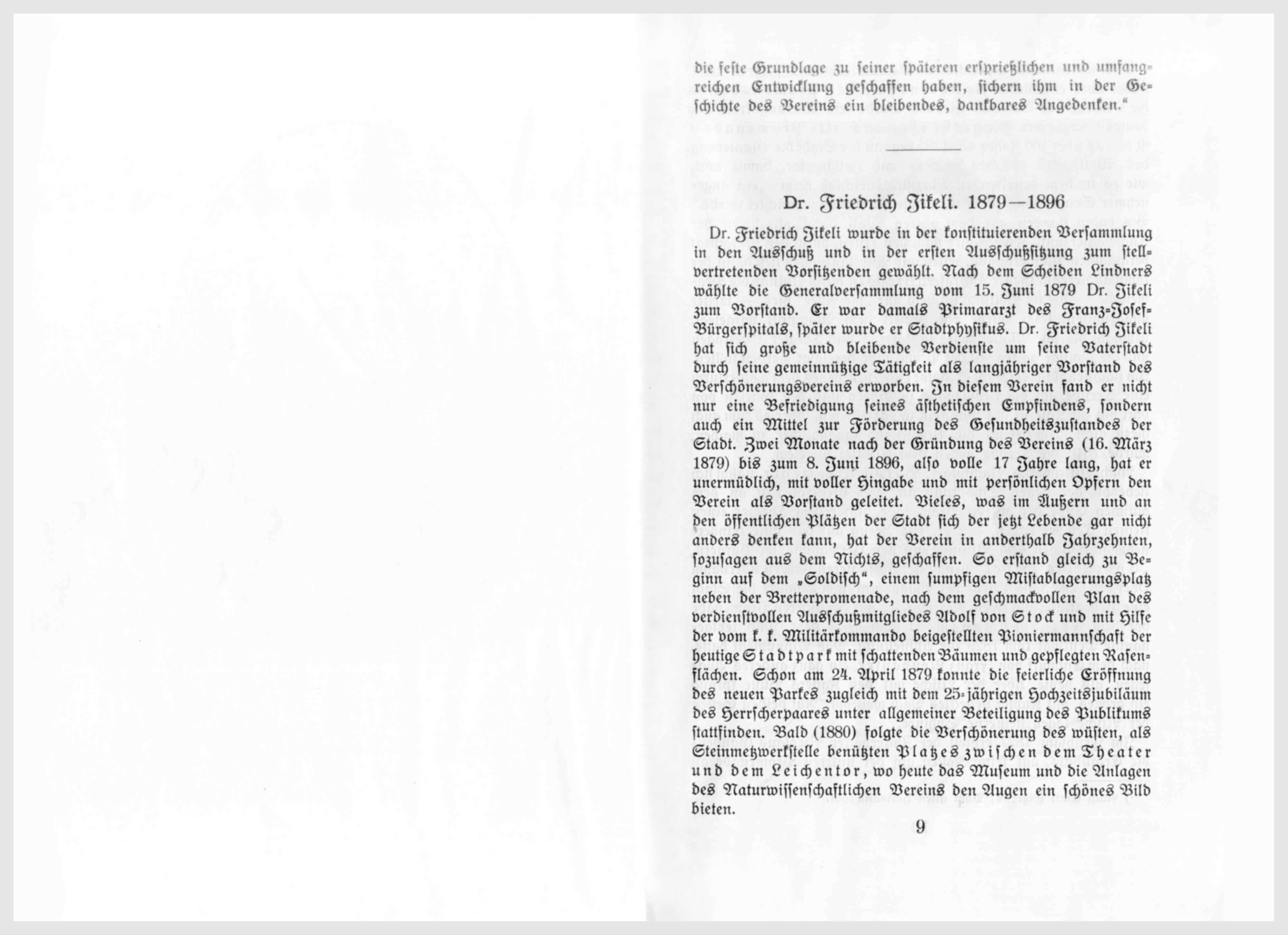 Dr. Friedrich Jikeli wurde in der konstituirenden Versammlung in den Ausschuß und in der ersten Ausschußsitzung zum stellvertretenden Vorsitzenden gewählt. Nach dem Scheiden Lindners wählte die Generalversammlung vom 15. Juni 1879 Dr. Jikeli zum Vorstand. Er war damals Primararzt des Franz-Josef-Bürgerspitals, später wurde er Stadtphysikus. Dr. Friedrich Jikeli hat sich große und bleibende Verdienste um seine Vaterstadt durch seine gemeinnützige Tätigkeit als langjähriger Vorstand des Verschönerunsvereins erworben. In diesem Verein fand er nicht nur eine Befriedigung seines ästhetischen Empfindens, sonder auch ein Mittel zur Förderung des Gesundheitszustandes der Stadt. Zwei Monate nach der Gründung des Vereins (16. März 1879) bis zum 8. Juni 1896, also volle 17 Jahre lang, hat er unermüdlich, mit voller Hingabe und mit persönlichen Opfern den Verein als Vorstand geleitet. Vieles, was im Äußern und an den öffentlichen Plätzen der Stadt sich der jetzt Lebende gar nicht anders denken kann, hat der Verein in anderhalb Jahrzehnten, sozusagen aus dem Nichts, geschaffen. So entstand gleich zu Beginn auf dem „Soldisch”, einem sumpfigen Mistablagerungsplatz neben der Bretterpromenade, nach dem geschmackvollen Plan des verdienstvollen Ausschußmitgliedes Adolf von Stock und mit Hilfe vom k. k. Militärkommando beigestellten Pioniermanschaft der heutige Stadtpark mit schattenden Bäumen und gepflegte Rasenflächen. Schon am 24. April 1879 konnte die feierliche Eröffnung des neuen Parkes zugleich mit dem 25-jährigen Hochzeitsjubiläum des Herrscherpaares unter allgemeiner Beteiligung des Publikums stattfinden. Bald (1880) folgte die Verschönerung des wüsten, als Steinmetzwerkstelle benützten Platzes zwischen dem Theater und dem Leichentor, wo heute das Museum und die Anlagen des Naturwissenschaflichen Vereins den Augen ein schönes Bild bieten.