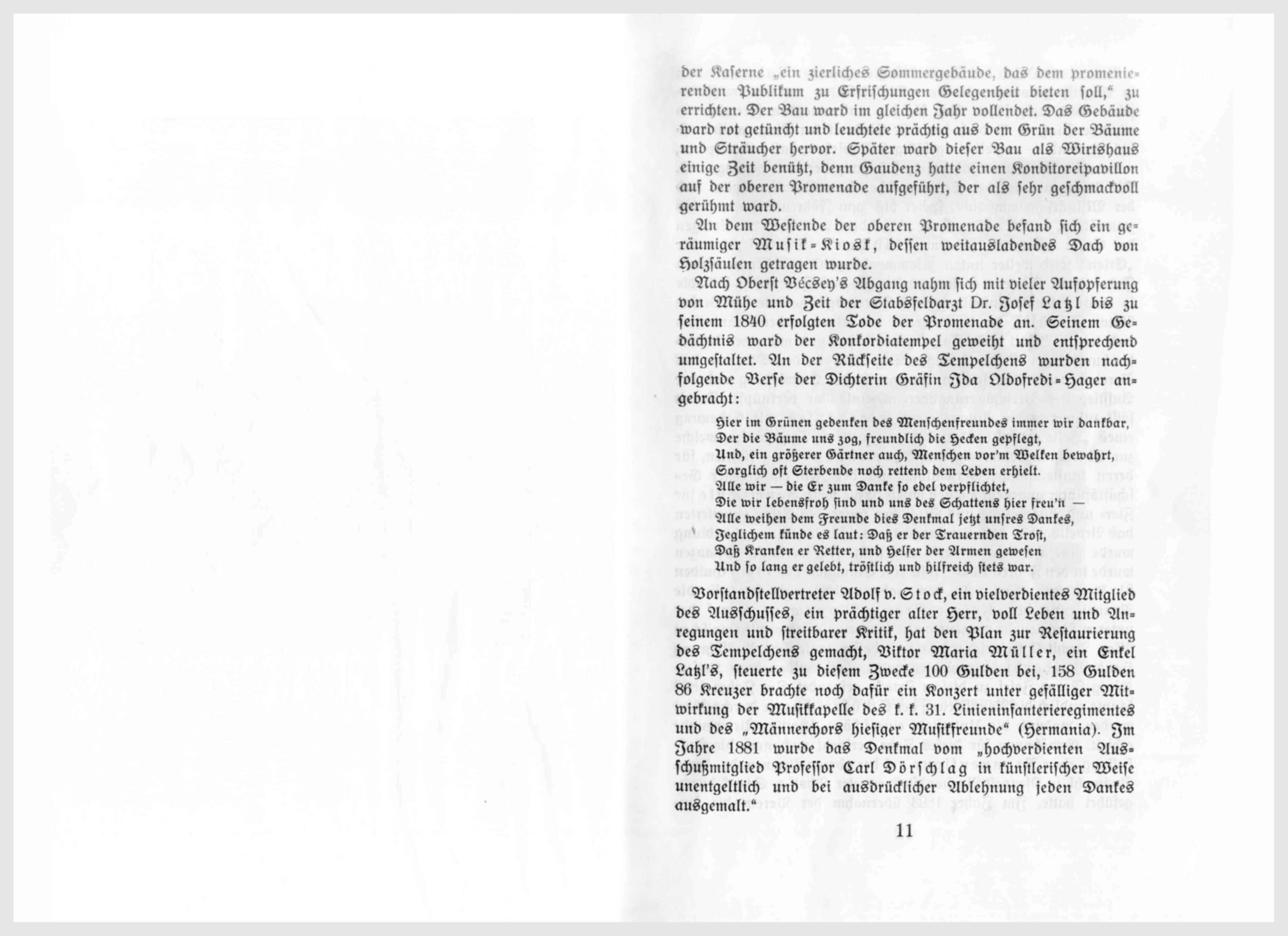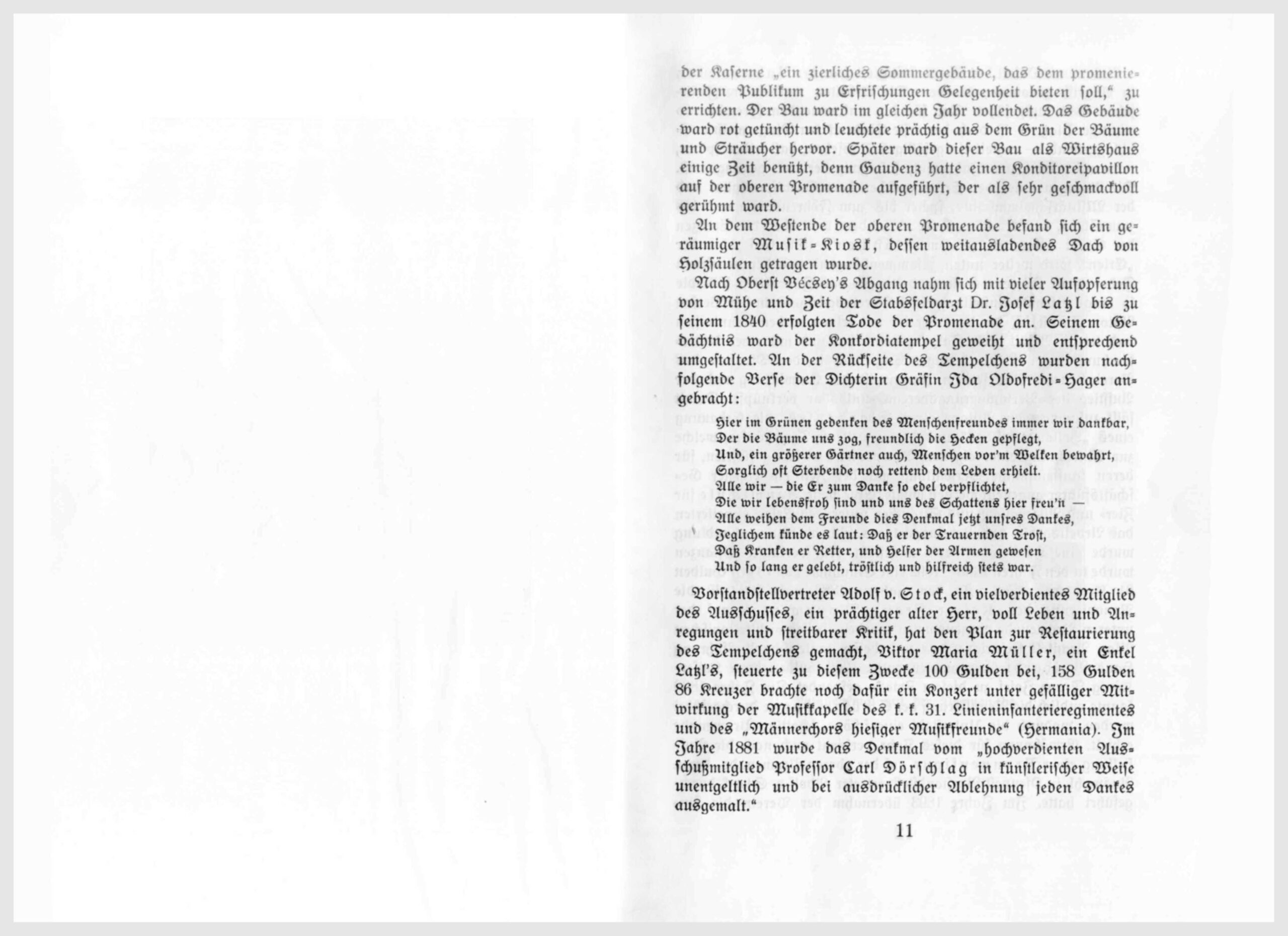 Nach Oberst Bécsey’s Abgang nahm sich mit vieler Aufopferung von Mühe und Zeit der Stabsfeldarzt Dr. Josef Latzl bis zu seinem 1840 erfolgten Tode der Promenade an. Seinem Gedächtnis ward der Konkordiatempel geweiht und entsprechend umgestaltet. An der Rückseite des Tempelchens wurde nachfolgende Verse der Dichterin Ida Oldofredi-Hager angebracht: