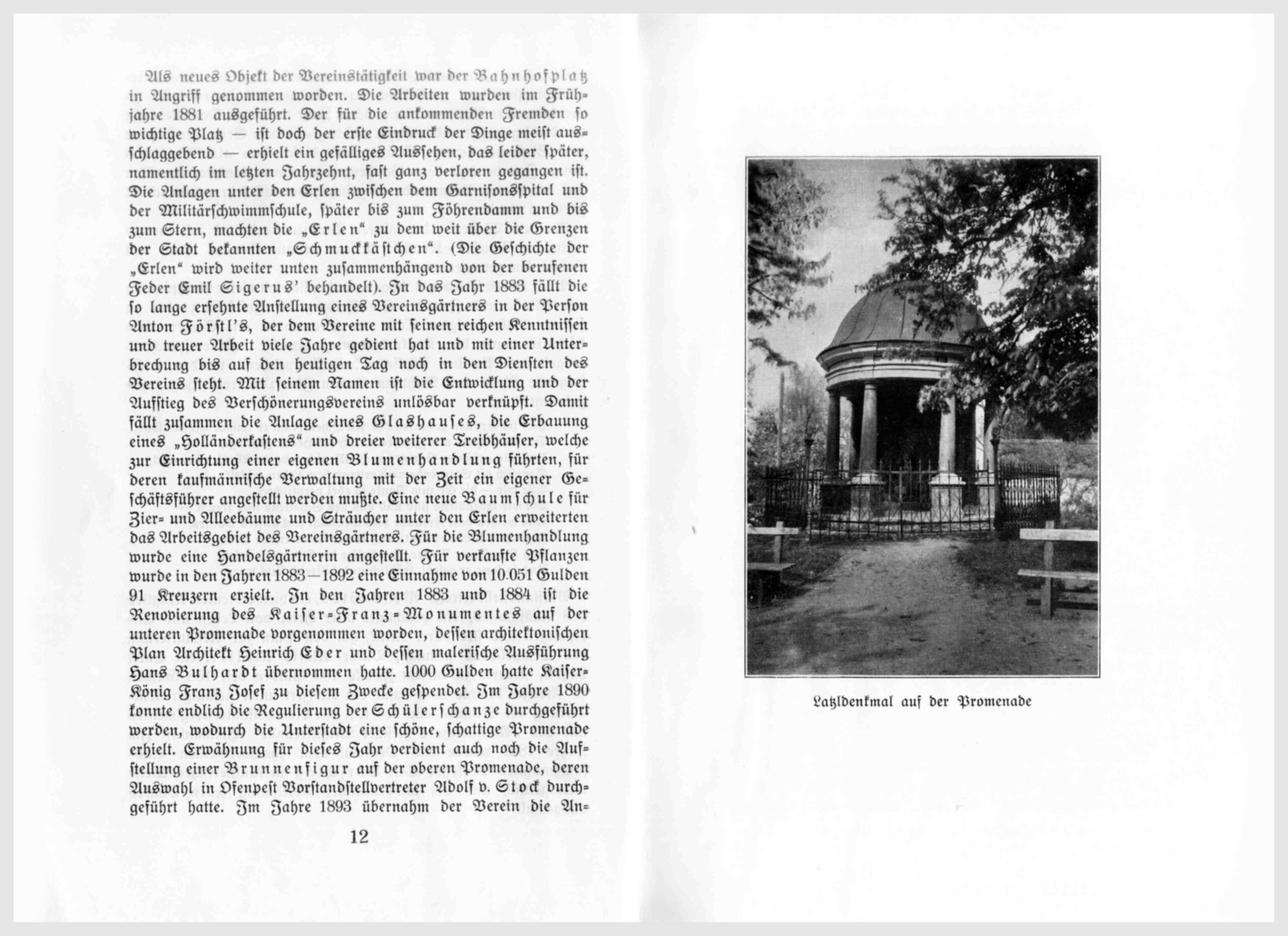 Als neues Objekt der Vereinstätigkeit war der Bahnhofplatz in Angriff genommen worden. Die Arbeiten wurden im Frühjahr 1881 ausgeführt. Der für die ankommenden Fremden so wichtige Platz – ist doch der erste Eindruck der Dinge meist ausschlaggebend – erhielt ein gefälliges Aussehen, das leider später, namentlich im letzten Jahrzehnt, fast ganz verloren gegangen ist.Die Anlagen unter den Erlen zwischen dem Garnisonsspital und der Militärschwimmschule, später bis zum Föhrendamm und bis zum Stern, machten die „Erlen“ zu dem weit über die Grenzen der Stadt bekannten „Schmuckkästchen“. (Die Geschichte der „Erlen“ wird weiter unten zusammenhängend von der berufenen Feder Emil Sigeru’s behandelt). In das Jahr 1883 fällt die so lange ersehnte Anstellung eines Vereinsgärtners in der Person Anton Förstl’s, der dem Vereine mit seinen reichen Kenntnissen und treuer Arbeit viele Jahre gedient hat und mit einer Unterbrechung bis auf den heutigen Tag [1929] noch in den Diensten des Vereins steht. Mit seinem Namen ist die Entwicklung und der Aufstieg des Verschönerungsvereins unlösbar verknüpft. Damit fällt zusammen die Anlage eines Glashauses, die Erbauung eines „Holländerkastens“ und dreier weiterer Treibhäuser, welche zur Einrichtung einer eigenen Blumenhandlung führten, für deren kaufmännische Verwaltung mit der Zeit ein eigener Geschäftsführer angestellt werden mußte. Eine neue Baumschule für Zier- und Alleebäume und Sträucher unter den Erlen erweiterten das Arbeitsgebiet des Vereinsgärtners. Für die Blumenhandlung wurde eine Handelsgärtnerin angestellt. Für verkaufte Pflanzen wurde in den Jahren 1883-1892 eine Einnahme von 10.052 Gulden 91 Kreuzer erzielt. In den Jahren 1883 und 1884 ist die Renovierung des Kaiser-Franz-Monuments auf der unteren Promenade vorgenommen worden, dessen architektonischen Plan Architekt Heinrich Eder und dessen malerische Ausführung Hans Bulhardt übernommen hatte. 1000 Gulden hatte Kaiser-König Franz Josef zu diesem Zwecke gespendet. Im Jahre 1890 konnte endlich die Regulierung der Schülerschanze durchgeführt werden, wodurch die Unterstadt eine schöne, schattige Promenade erhielt. Erwähnung für dieses Jahr verdient auch noch die Aufstellung einer Brunnenfigur auf der oberen Promenade, deren Auswahl in Oberpest Vorstandstellvertreter Adolf v. Stock durchgeführt hatte. Im Jahre 1893 übernahm der Verein die Anpflanzung des Plateaus, auf dem der Gedenkstein an den Korpskommandanten Anton Freiherr v. Szveteney steht. Als im Jahre 1894 Vorstandstellvertreter Adolf v. Stock mit Rücksicht auf sein hohes Alter seine Stellung niederlegte, sagte ihm der Jahresbericht nach: „Er war es, der seit der Gründung unseres Vereins mit Rat und Tat immer bereit war, – er, dem es zu danken ist, daß all die schönen und viel bewunderten Anlagen geschaffen wurden.“