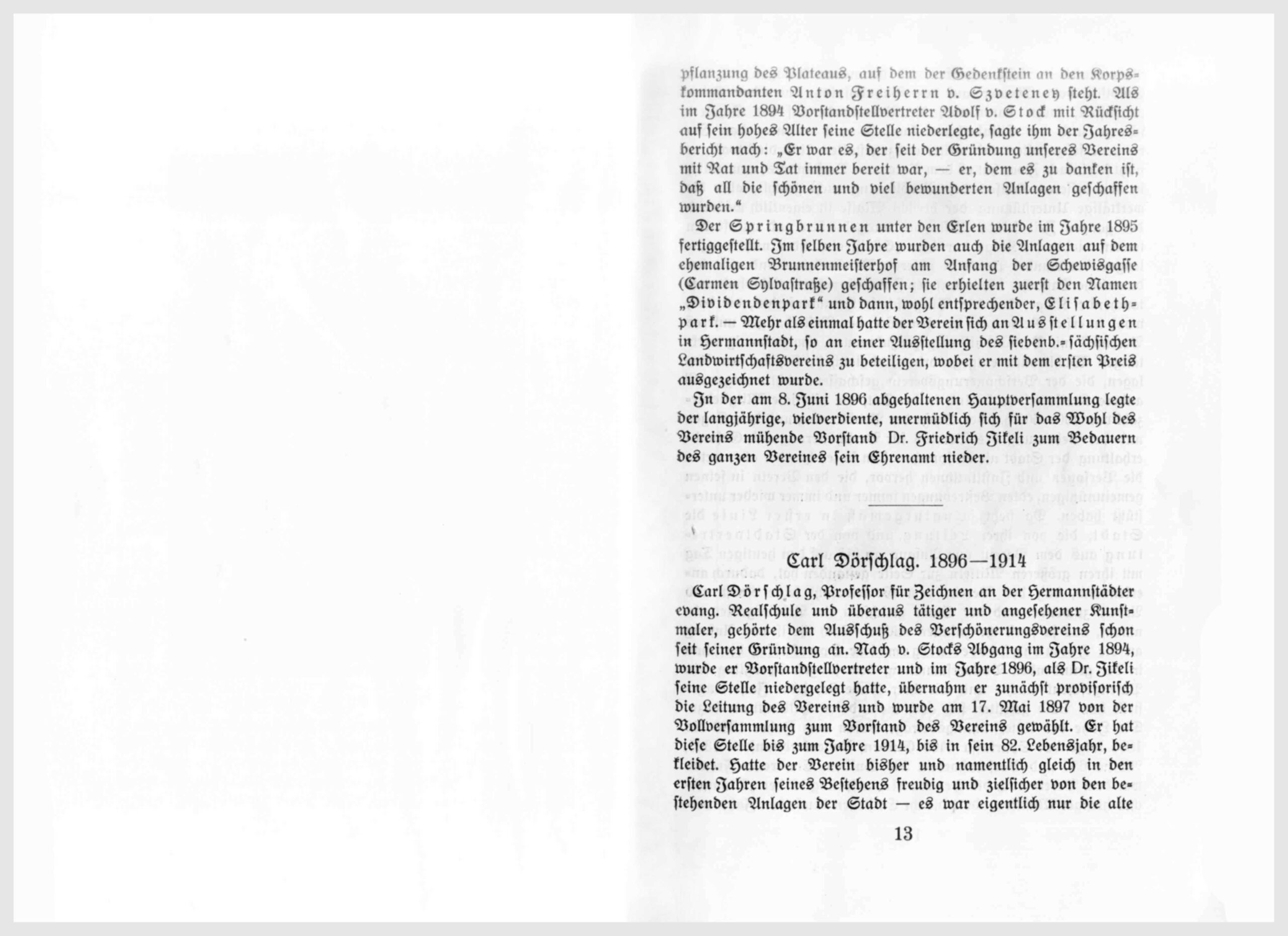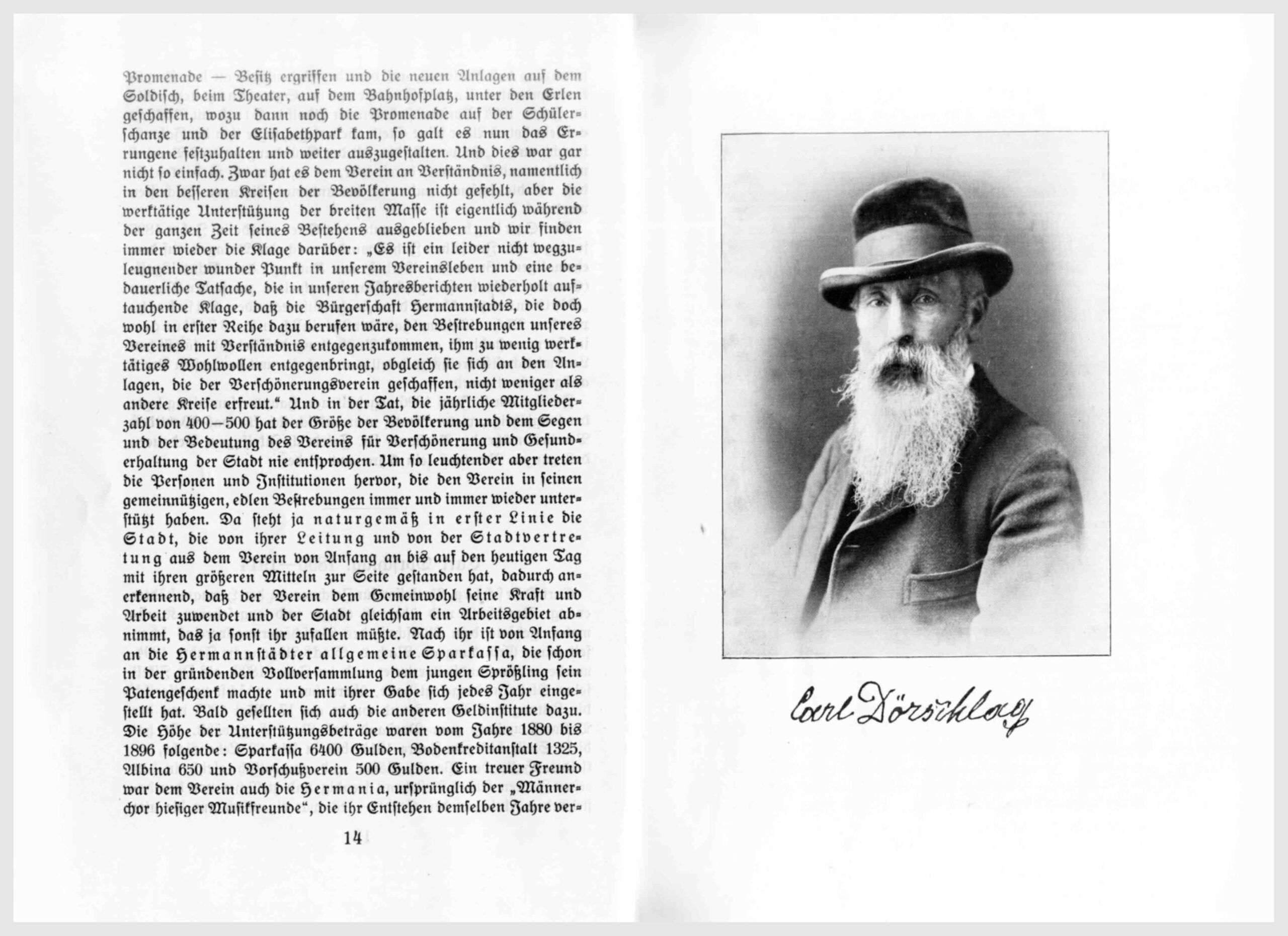 Carl Dörschlag, Professor für Zeichnen an der Hermannstädter evang. Realschule und überaus tätiger und angesehener Kunstmaler, gehörte dem Ausschuß des Verschönerungsvereins schon seit seiner Gründung an. Nach v. Stocks Abgang im Jahre 1894, wurde er Vorstandstellvertreter und im Jahre 1896, als Dr. Jikeli seine Stelle niedergelegt hatte, übernahm er zunächst provisorisch die Leitung des Vereins und wurde am 17. Mai 1897 von der Vollversammlung zum Vorstand des Vereins gewählt. Er hat diese Stelle bis zum Jahre 1914, bis in sein 82. Lebensjahr, bekleidet. Hatte der Verein bisher und namentlich gleich in den ersten Jahren seines Bestehens freudig und zielsicher von den bestehenden Anlagen de Stadt – es war eigentlich nur die alte Promenade – Besitz ergriffen und die neuen Anlagen auf dem Soldisch, beim Theater, auf dem Bahnhofplatz, unter den Erlen geschaffen, wozu dann noch die Promenade auf der Schülerschanze und der Elisabethpark kam, so galt es nun das Errungene festzuhalten und weiter auszugestalten. Und dies war gar nicht so einfach. Zwar hat es dem Verein an Verständnis, namentlich in den besseren Kreisen der Bevölkerung nicht gefehlt, aber die werktätige Unterstützung der breiten Masse ist eigentlich während der ganzen Zeit seines Bestehens ausgeblieben und wir finden immer wieder die Klage darüber: „Es ist ein leider nicht wegzuleugnender wunder Punkt in unserem Vereinsleben und eine bedauerliche Tatsache, die in unseren Jahresberichten wiederholt auftauchende Klage, daß die Bürgerschaft Hermannstadt, die doch wohl in erster Reihe dazu berufen wäre, den Bestrebungen unseres Vereins mit Verständnis entgegenzukommen, ihm zu wenig werktätiges Wohlwollen entgegenbringt, obgleich sie sich an den Anlagen, die der Verschönerungsverein geschaffen, nicht weniger als andere Kreise erfreut.“ Und in der Tat, die jährliche Mitgliederzahl von 400-500 hat der Größe der Bevölkerung und dem Segen und der Bedeutung des Vereins für Verschönerung und Gesunderhaltung der Stadt nie entsprochen. Um so leuchtender aber treten die Personen und Institutionen hervor, die den Verein in seinen gemeinnützigen, edlen Bestrebungen immer und immer wieder unterstützt haben. Da steht ja naturgemäß in erster Linie die Stadt, die von ihrer Leitung und von der Stadtverwaltung aus dem Verein von Anfang an bis auf den heutigen Tag mit ihren größeren Mitteln zur Seite gestanden hat, dadurch anerkennend, daß der Verein dem Gemeinwohl seine Kraft und Arbeit zuwendet und der Stadt gleichsam ein Arbeitsgebiet abnimmt, daß ja sonst ihr zufallen müßte. Nach ihr ist von Anfang an die Hermannstädter allgemeine Sparkasse, die schon in der gründenden Vollversammlung dem jungen Sprößling sein Patengeschenk machte und mit ihrer Gnade sich jedes Jahr eingestellt hat. Bald gesellten sich auch die anderen Geldinstitute dazu. Die Höhe der Unterstützungsbeiträge waren vom Jahre 1880 bis 1896 folgende: Sparkassa 6400 Gulden, Bodenkreditanstalt 1325, Albina 650 und Vorschußverein 500 Gulden. Ein treuer Freund war dem Verein auch die Hermania, ursprünglich der „Männerchor hiesiger Musikfreunde“, die ihr Entstehen demselben Jahre verdankte und in der obengenannten Zeit dem Verein immer wieder Geldmittel zuwendete, im ganzen in der Höhe von 482 Gulden 50 Kreuzer. – Die ersten Gründer sind in das „Goldene Buch“ des Vereins eingetragen: