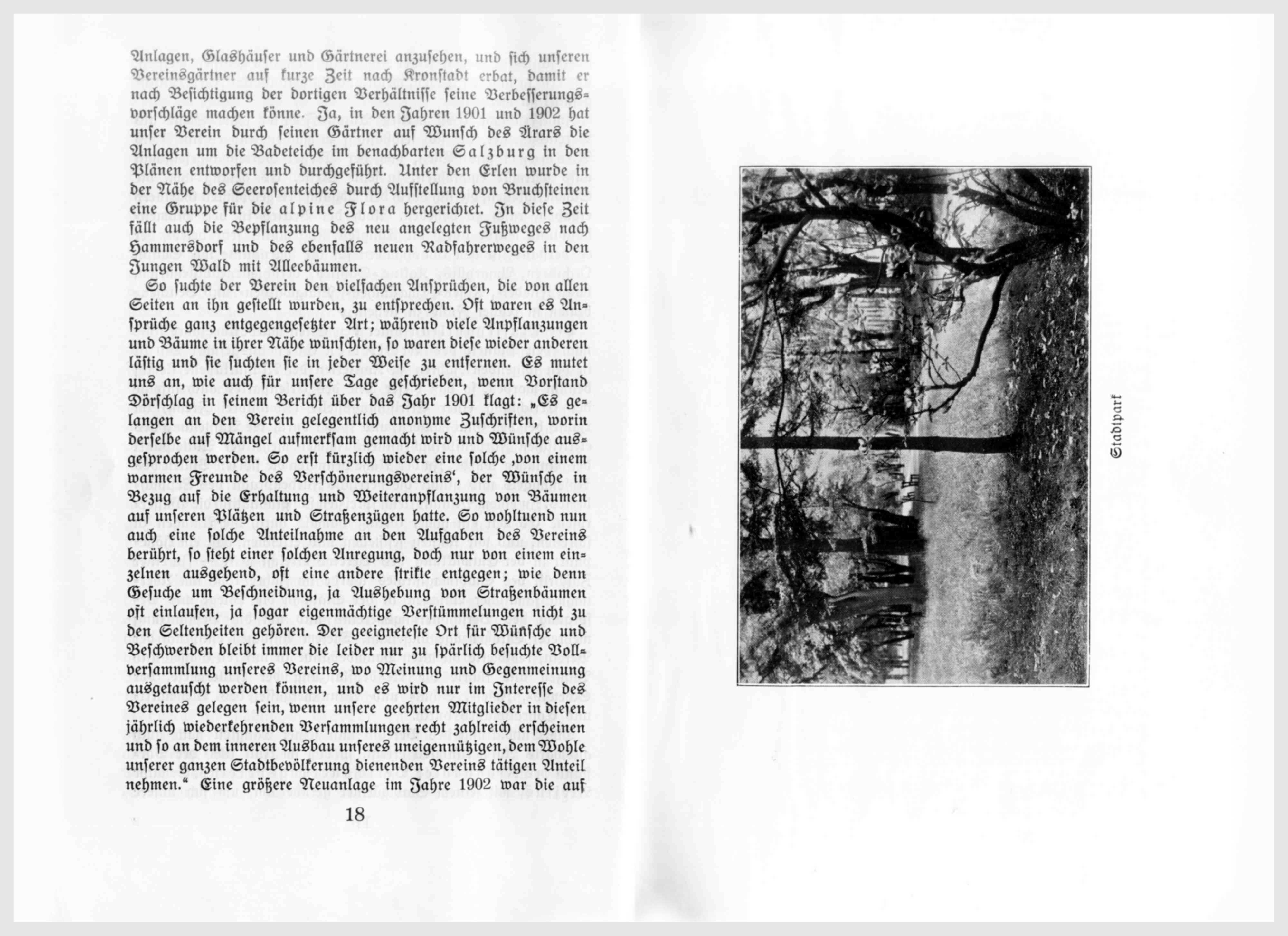Die Entwicklung des Vereins und seiner Tätigkeit hatte auch auswärts Aufmerksamkeit erregt, so daß im Juli 1900 der Vorstand des Kronstädter Verschönerungsvereins, Senator Alesius, mit seinem Stadtgärtner herüberkam, um sich unsere Anlagen, Glashäuser und Gärtnerei anzusehen, und sich unseren Vereinsgärtner auf kurze Zeit nach Kronstadt erbat, damit er nach Besichtigung der dortigen Verhältnisse seine Verbesserungsvorschläge machen können. Ja, in den Jahren 1901 und 1902 hat unser Verein durch seinen Gärtner auf Wunsch des Ärars die Anlagen um die Badeteiche im benachbarten Salzburg in den Plänen entworfen und durchgeführt. Unter den Erlen wurde in den Nähe des Seerosenteiches durch Aufstellung von Bruchsteinen eine Gruppe für die alpine Flora hergerichtet. In diese Zeit fällt auch die Bepflanzung des neu angelegten Fußweges nach Hammersdorf und des ebenfalls neuen Radweges in den Jungen Wald mit Alleebäumen.
