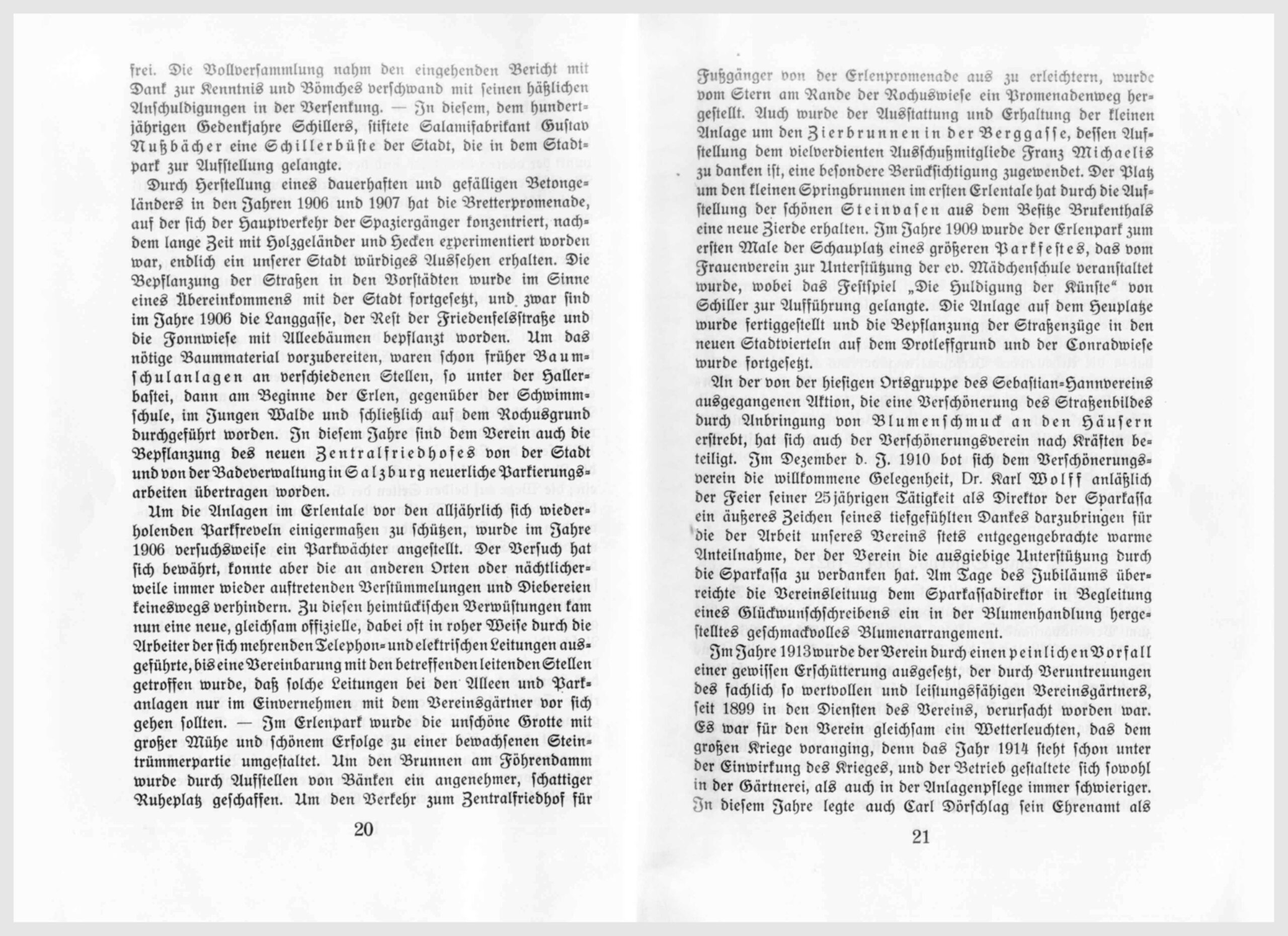 Um die Anlagen im Erlentale vor den alljährlich sich wiederholenden Parkfreveln einigermaßen zu schützen, wurde im Jahre 1906 versuchsweise ein Parkwächter angestellt. Der Versuch hat sich bewährt, konnte aber die an anderen Orten oder nächtlicherweile immer wieder auftretenden Verstümmelungen und Diebereien keineswegs verhindern. Zu diesen heimtückischen Verwüstungen kam nun eine neue, gleichsam offizielle, dabei oft in roher Weise durch die Arbeiter der sich mehrenden Telephon- und elektrischen Leitungen ausgeführte, bis eine Vereinbarung mit den betreffenden leitenden Stellen getroffen wurde, daß solche Leitungen bei den Alleen und Parkanlagen nur im Einvernehmen mit dem Vereinsgärtner vor sich gehen sollen. – Im Erlenpark wurde die unschöne Grotte mit großer Mühe und schönem Erfolge zu einer bewachsenen Steintrümmerpartie umgestaltet. Um den Brunnen am Föhrendamm wurde durch Aufstellen von Bänken ein angenehmer, schattiger Ruheplatz geschaffen. Um den Verkehr zum Zentralfriedhof für Fußgänger von der Erlenpromenade aus zu erleichtern, wurde vom Stern am Rande der Rochuswiese ein Promenadenweg hergestellt. Auch wurde der Ausstattung und Erhaltung der Kleinen Anlage um den Zierbrunnen in der Berggasse, dessen Aufstellung dem vielverdienten Ausschußmitgliede Franz Michaelis zu danken ist, eine besondere Berücksichtigung zugewendet. Der Platz um den kleinen Springbrunnen im ersten Erlentale hat durch die Aufstellung der schönen Steinvasen aus dem Besitz Brukenthals eine neue Zierde erhalten. Im Jahre 1909 wurde der Erlenpark zum ersten Male der Schauplatz eines größeren Parkfestes, das vom Frauenverein zur Unterstützung der ev. Mädchenschule veranstaltet wurde, wobei das Festspiel „Die Huldigung der Künste“ von Schiller zur Aufführung gelangte. Die Anlage auf dem Heuplatze wurde fertiggestellt und die Bepflanzung der Straßenzüge in den neuen Stadtvierteln auf dem Drotleffgrund und der Conradwiese wurde fortgesetzt.