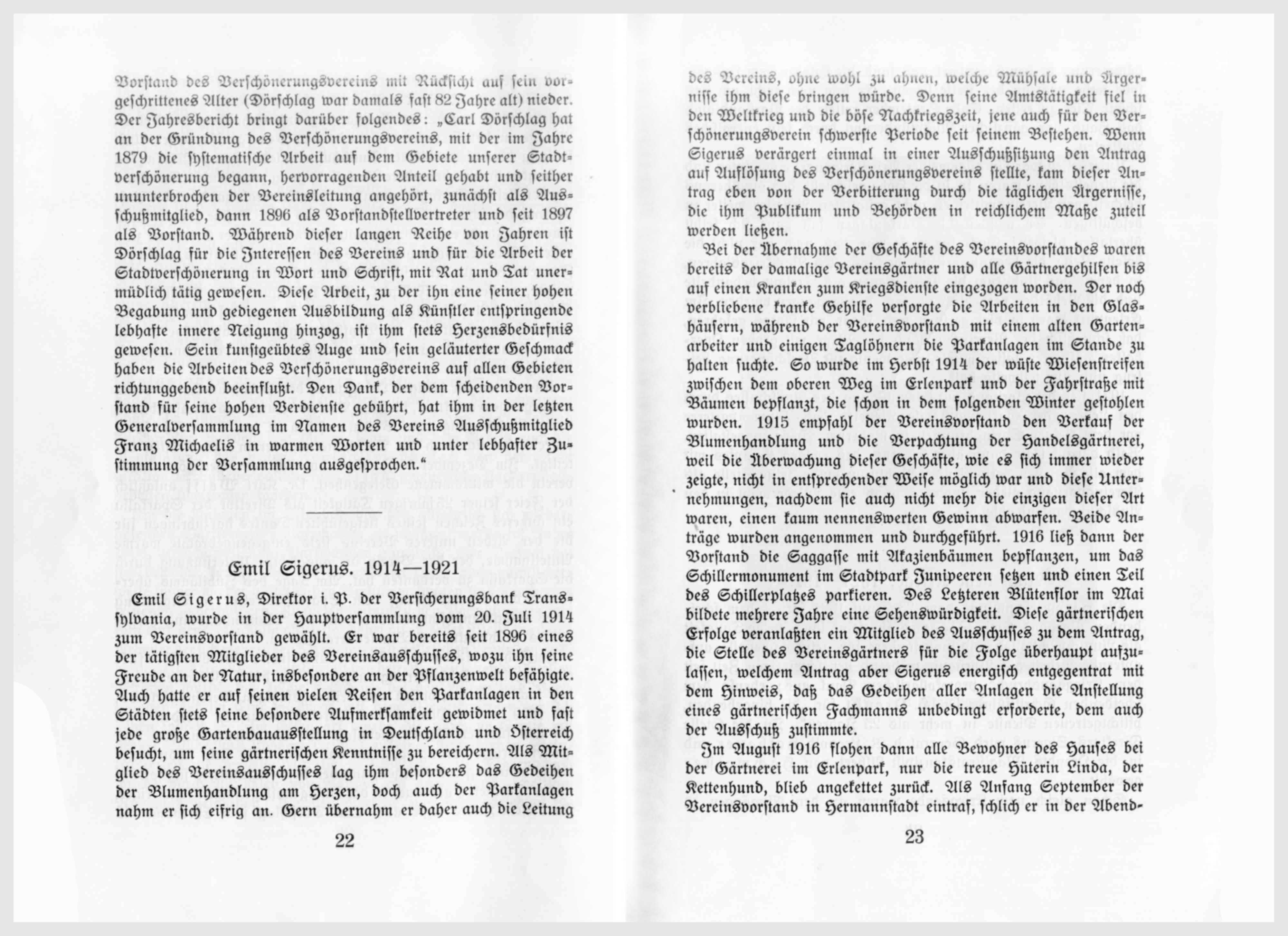 Emil Sigerus, Direktor i. P. der Versicherungsbank Transsylvanien, wurde in der Hauptversammlung vom 20. Juli 1914 zum Vereinsvorstand gewählt. Er war bereits seit 1896 eines der tätigsten Mitglieder des Vereinsausschusses, wozu ihn seine Freude an der Natur, insbesondere an der Pflanzenwelt befähigte. Auch hatte er auf seinen vielen Reisen den Parkanlagen in den Städten stets seine besondere Aufmerksamkeit gewidmet und fast jede große Gartenbauausstellung in Deutschland und Österreich besucht, um seine gärtnerischen Kenntnisse zu bereichern. Als Mitglied des Vereinsausschusses lag ihm besonders das Gedeihen der Blumenhandlung am Herzen, doch auch der Parkanlagen nahm er sich eifrig an. Gern übernahm er daher auch die Leitung des Vereins, ohne wohl zu ahnen, welche Mühsale und Ärgernisse ihm diese bringen würden. Denn seine Amtstätigkeit fiel in den Weltkrieg und die böse Nachkriegszeit, jene auch für den Verschönerungsvereins schwerste Periode seit seinem Bestehen. Wenn Sigerus verärgert einmal in einer Ausschußsitzung den Antrag auf Auflösung des Verschönerungsvereins stellte, kam dieser Antrag eben von der Verbitterung durch die täglichen Ärgernisse, die ihm Publikum und Behörden in reichlichem Maße zuteil werden ließen.