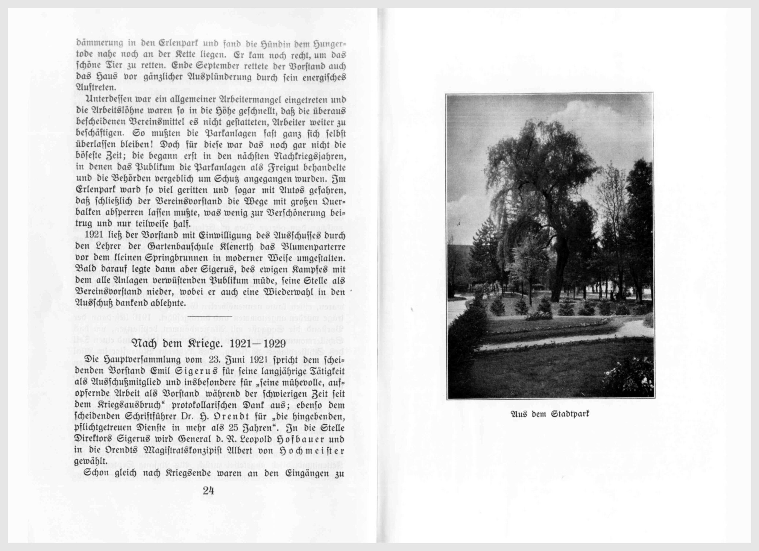 1921 ließ der Vorstand mit Einwilligung des Ausschusses durch den Lehrer der Gartenbauschule Klenerth das Blumenparterre vor dem kleinen Springbrunnen in moderner Weise umgestalten. Bald darauf legte dann aber Sigerus, des ewigen Kampfes mit dem alle Anlagen verwüsteten Publikum müde, seine Stelle als Vereinsvorstand nieder, wobei er auch eine Wiederwahl in den Ausschuß dankend ablehnte.