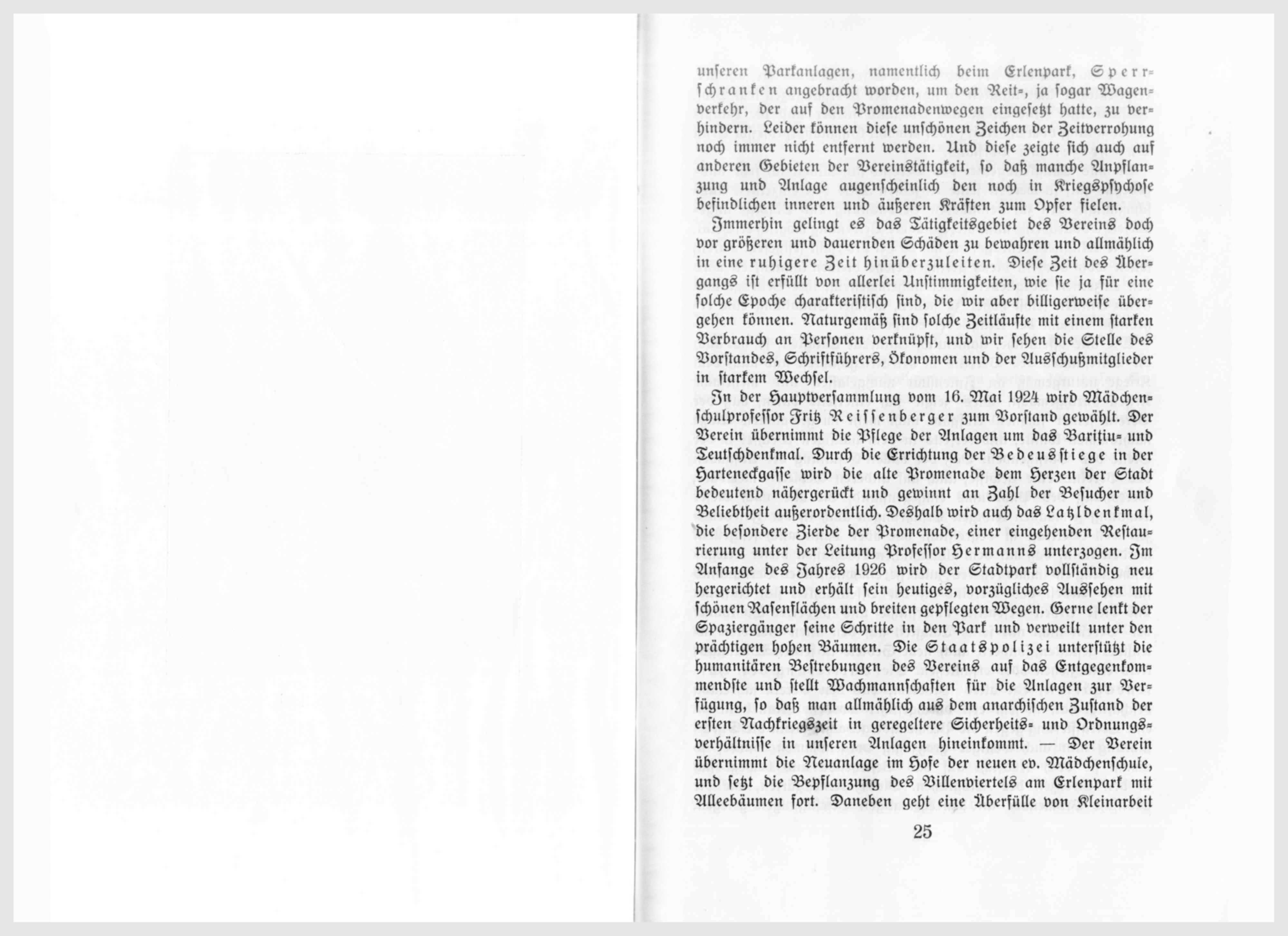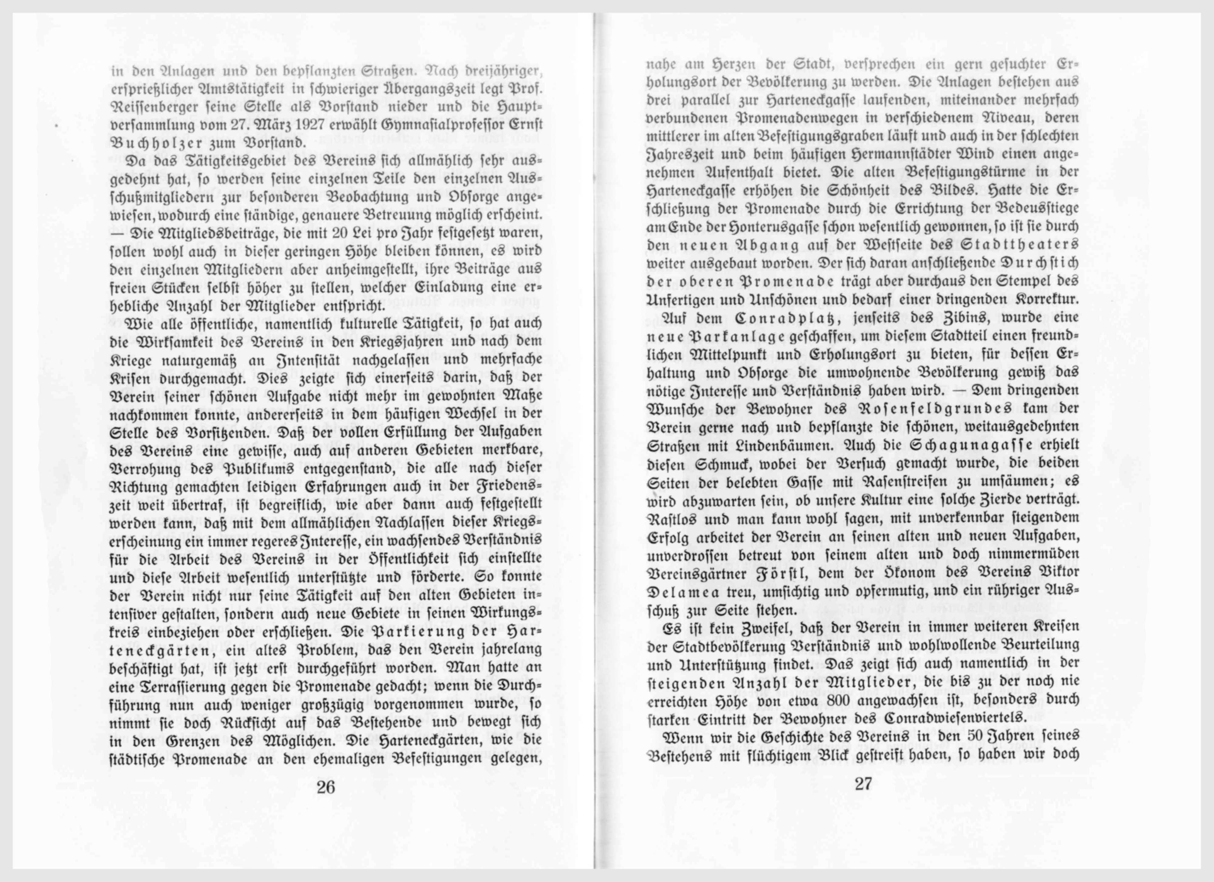 In der Hauptversammlung vom 16. Mai 1924 wird Mädchenschulprofessor Fritz Reissenberger zu Vorstand gewählt. Der Verein übernimmt die Pflege der Anlagen um das Barițiu- und Teutschdenkmal. Durch die Errichtung der Bedeusstiege in der Harteneckgasse wird die alte Promenade dem Herzen der Stadt bedeutend nähergerückt und gewinnt an Zahl der Besucher und Beliebtheit außerordentlich. Deshalb wird auch das Latzldenkmal, die besondere Zierde der Promenade, einer eingehenden Restaurierung unter Leitung Professor Hermanns unterzogen. Im Anfang des Jahres 1926 wird der Stadtpark vollständig neu hergerichtet und erhält sein heutiges, vorzügliches Aussehen mit schönen Rasenflächen und breiten gepflegten Wegen. Gerne lenkt der Spaziergänger seine Schritte in den Park und verweilt unter den prächtigen hohen Bäumen. Die Stadtpolizei unterstützt die humanitären Bestrebungen des Vereins auf das Entgegenkommendste und stellt Wachmannschaften für die Anlagen zur Verfügung, so daß man allmählich aus dem anarchischen Zustand der ersten Nachkriegszeit in geregeltere Sicherheits- und Ordnungsverhältnisse in unseren Anlagen hineinkommt. – Der Verein übernimmt die Neuanlage im Hofe der neuen ev. Mädchenschule, und setzt die Bepflanzung des Villenviertels am Erlenpark mit Alleebäumen fort. Daneben geht eine Überfülle von Kleinarbeit in den Anlagen und den bepflanzten Straßen. Nach dreijähriger, erprießlicher Amtstätigkeit in schwieriger Übergangszeit legt Prof. Reissenberger seine Stelle als Vorstand nieder und die Hauptversammlung vom 27. März 1927 erwählt Gymnasialprofessor Ernst Buchholzer zum Vorstand.