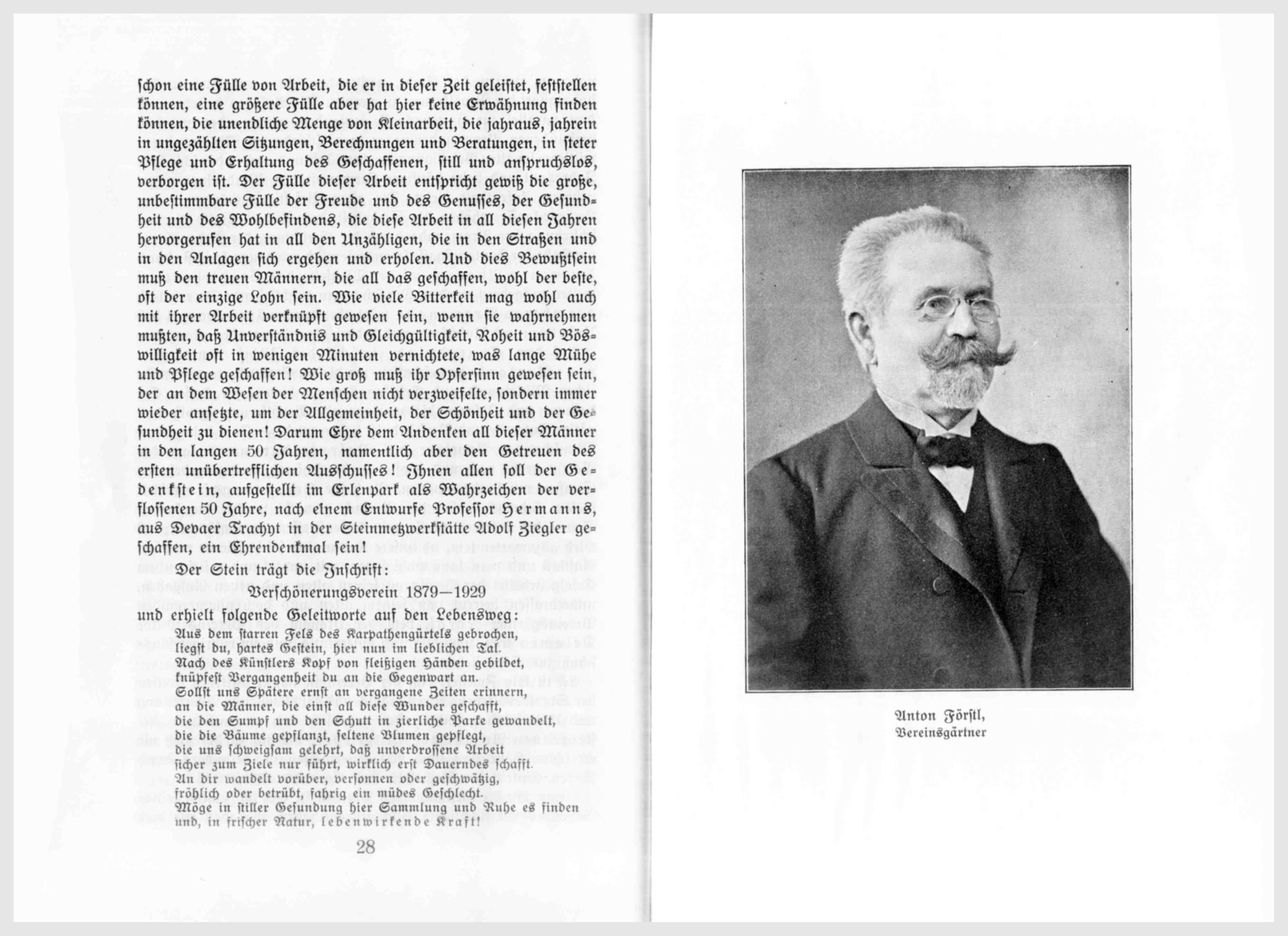 Wenn wir die Geschichte des Vereins in den 50 Jahren seines Bestehens mit flüchtigem Blick gestreift haben, so haben wir doch schon eine Fülle von Arbeit, die er in dieser Zeit geleistet, feststellen können, eine größere Fülle aber hat hier keine Erwähnung finden können, die unendliche Menge an Kleinarbeit, die jahraus, jahrein in ungezählten Sitzungen, Berechnungen und Beratungen, in steter Pflege und Erhaltung des Geschaffenen, still und anspruchslos, verborgen ist. Der Fülle dieser Arbeit entspricht gewiß die große, unbestimmbare Fülle der Freude und des Genusses, der Gesundheit und des Wohlbefindens, die diese Arbeit in all diesen Jahren hervorgerufen hat in all den Unzähligen, die in den Straßen und in den Anlagen sich ergeben und erholen. Und dies Bewußtsein muß den treuen Männern, die all das geschaffen, wohl der beste, oft der einzige Lohn sei. Wie viele Bitterkeit mag wohl auch mit ihrer Arbeit verknüpft gewesen sein, wenn sie wahrnehmen mußten, daß Unverständnis und Gleichgültigkeit, Rohheit und Böswilligkeit oft in wenigen Minuten vernichteten, was lange Mühe und Pflege geschaffen! Wie groß muß ihr Opfersinn gewesen sein, der an dem Wesen der Menschen nicht verzweifelte, sondern immer wieder ansetzte, um der Allgemeinheit, der Schönheit und der Gesundheit zu dienen! Darum ehre dem Andenkenall diesen Männern in den langen 50 Jahren, namentlich aber den Getreuen des ersten unübertrefflichen Ausschusses! Ihnen allen soll der Gedenkstein, aufgestellt im Erlenpark als Wahrzeichen der verflossenen 50 Jahre, nach einem Entwurf Professor Hermanns, Devaer Trachyt in der Steinmetzwerkstätte Adolf Ziegler geschaffen, ein Ehrendenkmal sein!