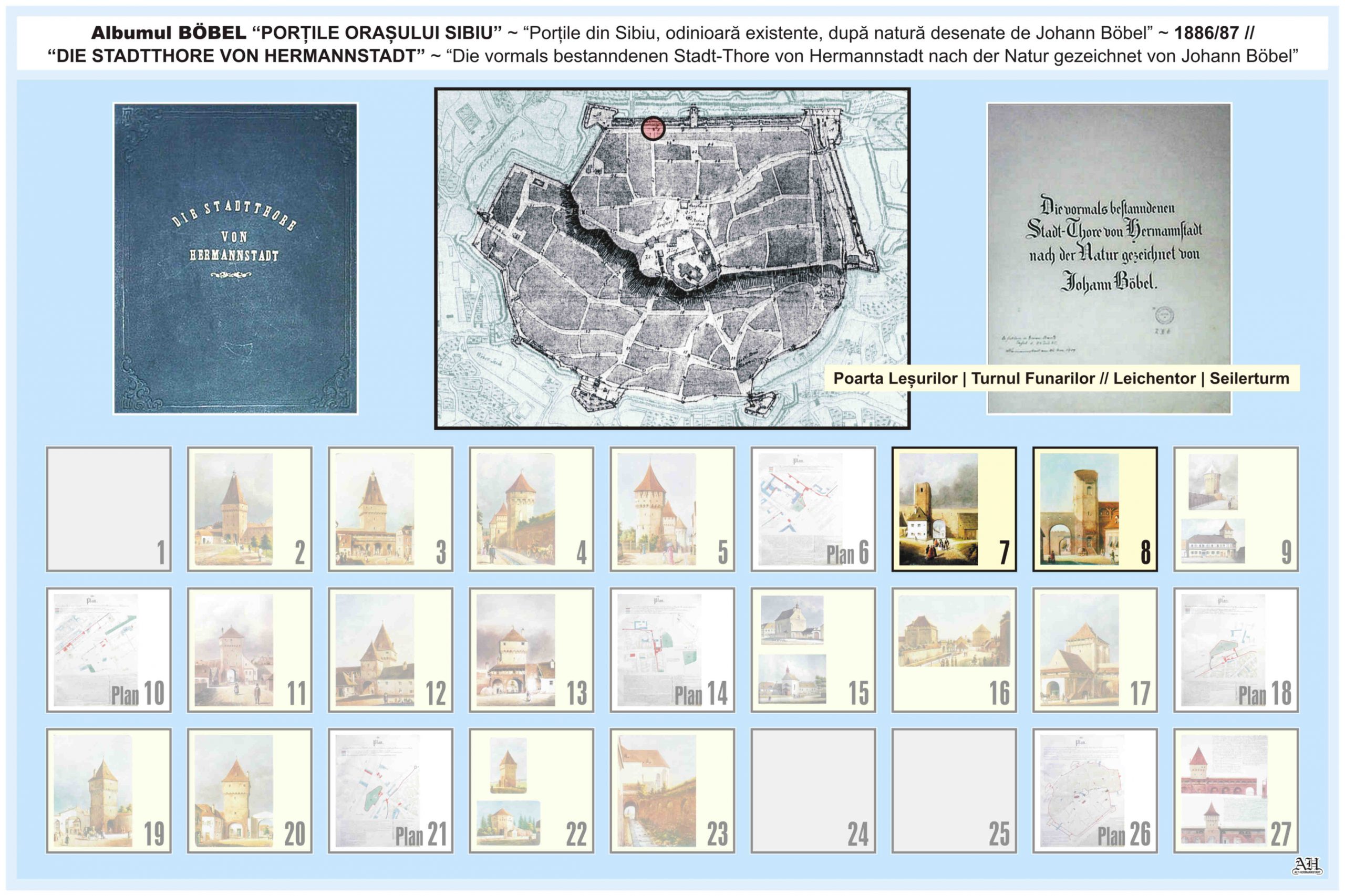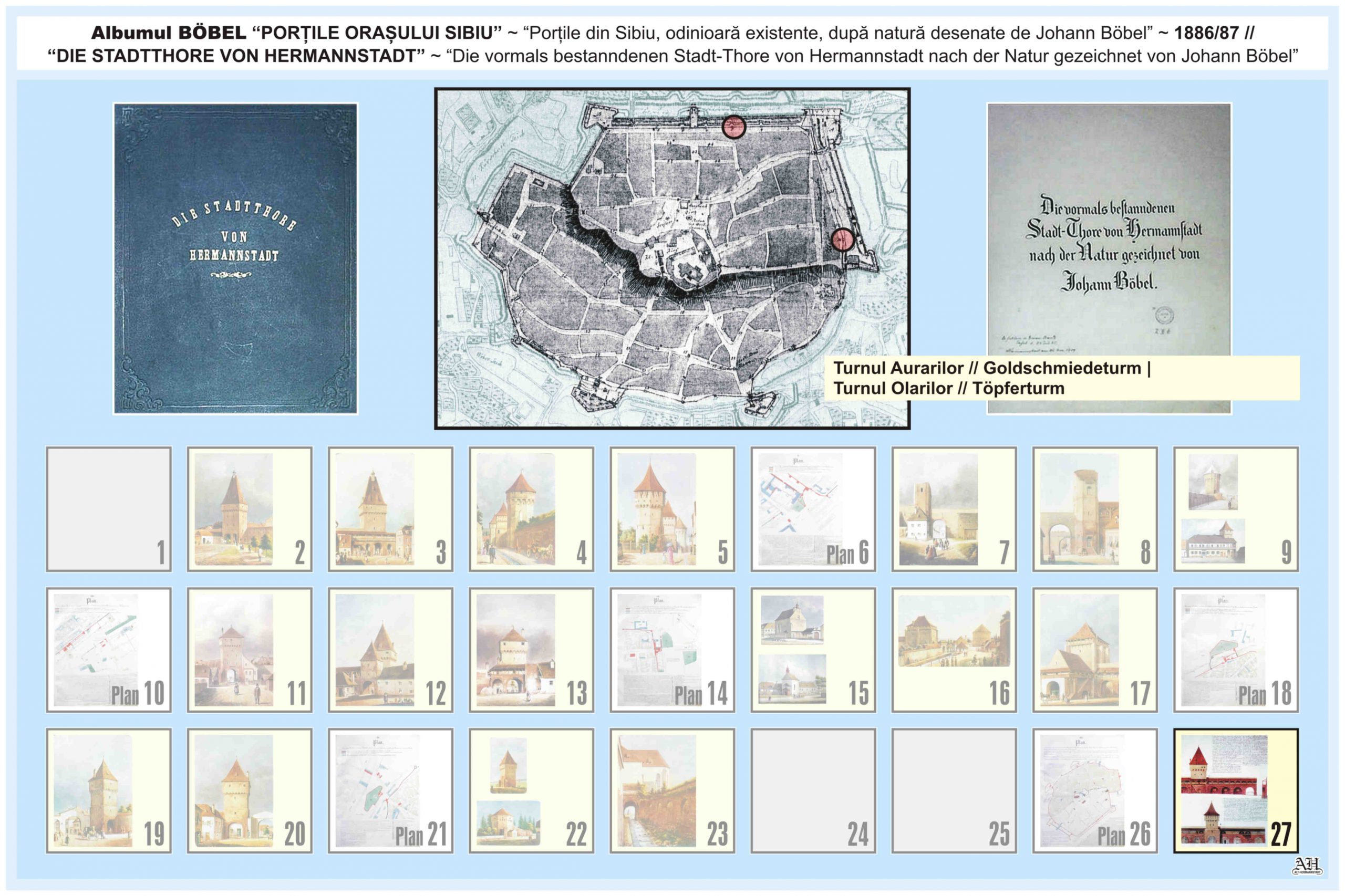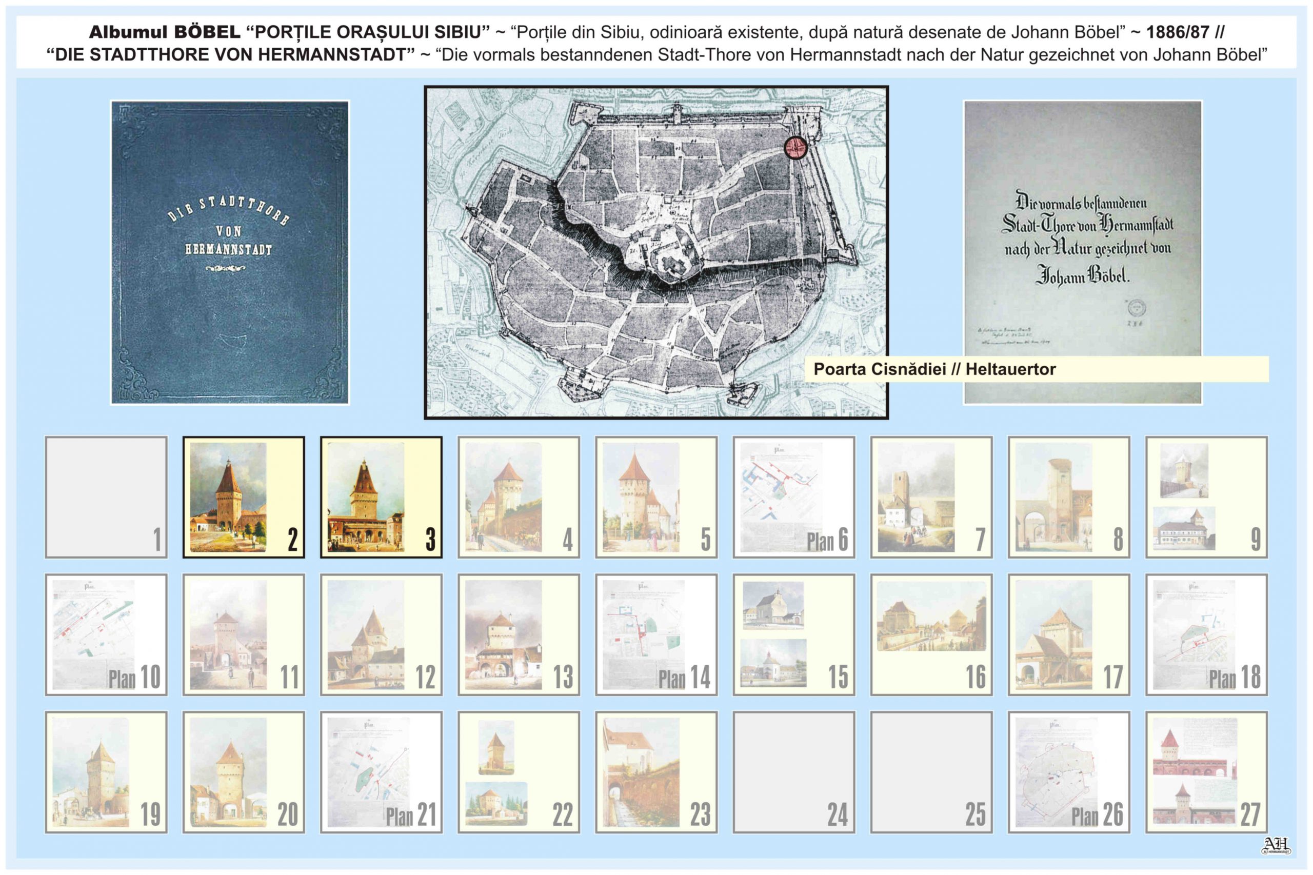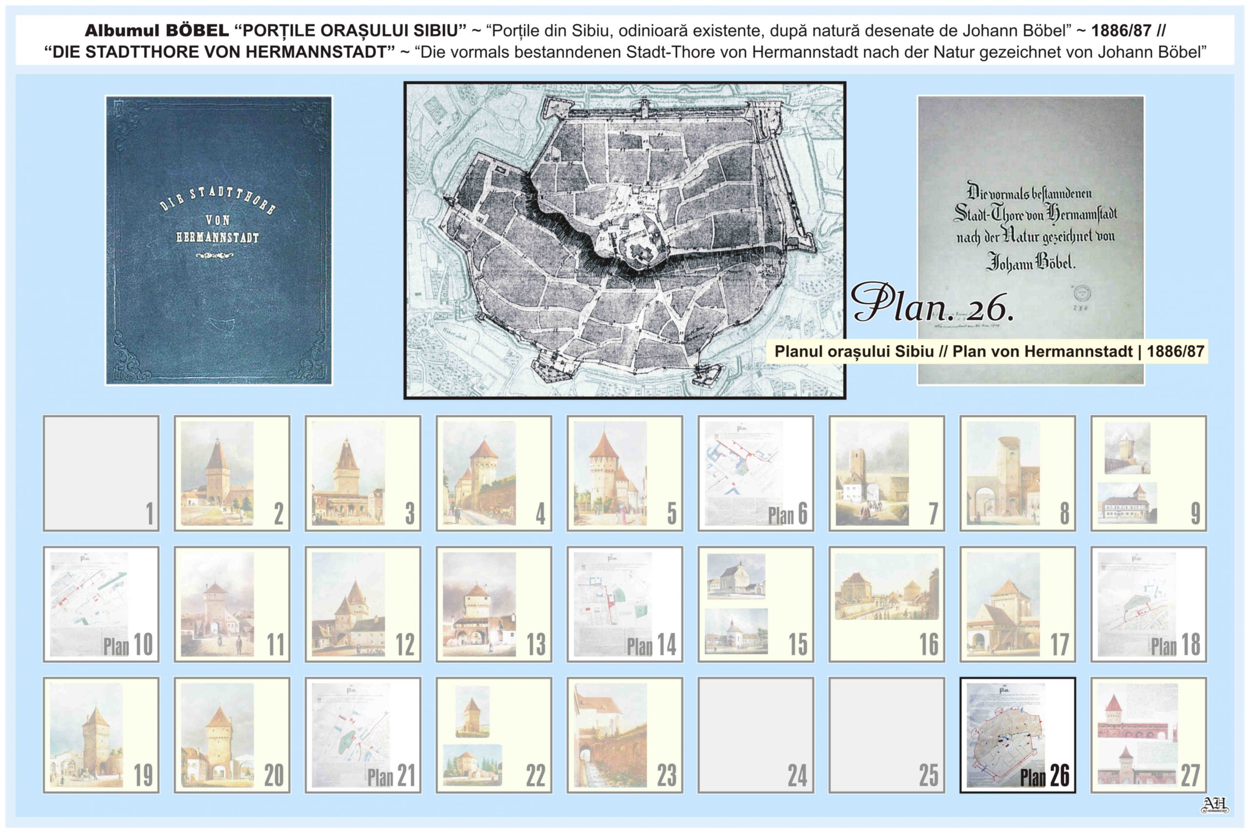 Renumitul album realizat de Johann Böbel poartă titlul: „Die vormals bestanndenen Stadt-Thore von Hermannstadt nach der Natur gezeichnet” // „Porțile din Sibiu odinioară existente după natură desenate” (traducere mot-a-mot „Porțile odinioară existente ale Sibiului după natură desenate”). Albumul a fost descoperit după moartea artistului, survenită în luna aprilie 1887, vezi necrologul lui Johann Böbel(*). Existența albumului este atestată și într-un articol apărut în Korrespondenzblatt des Vereins für Siebenbürgische Landeskunde din 27 august 1887.