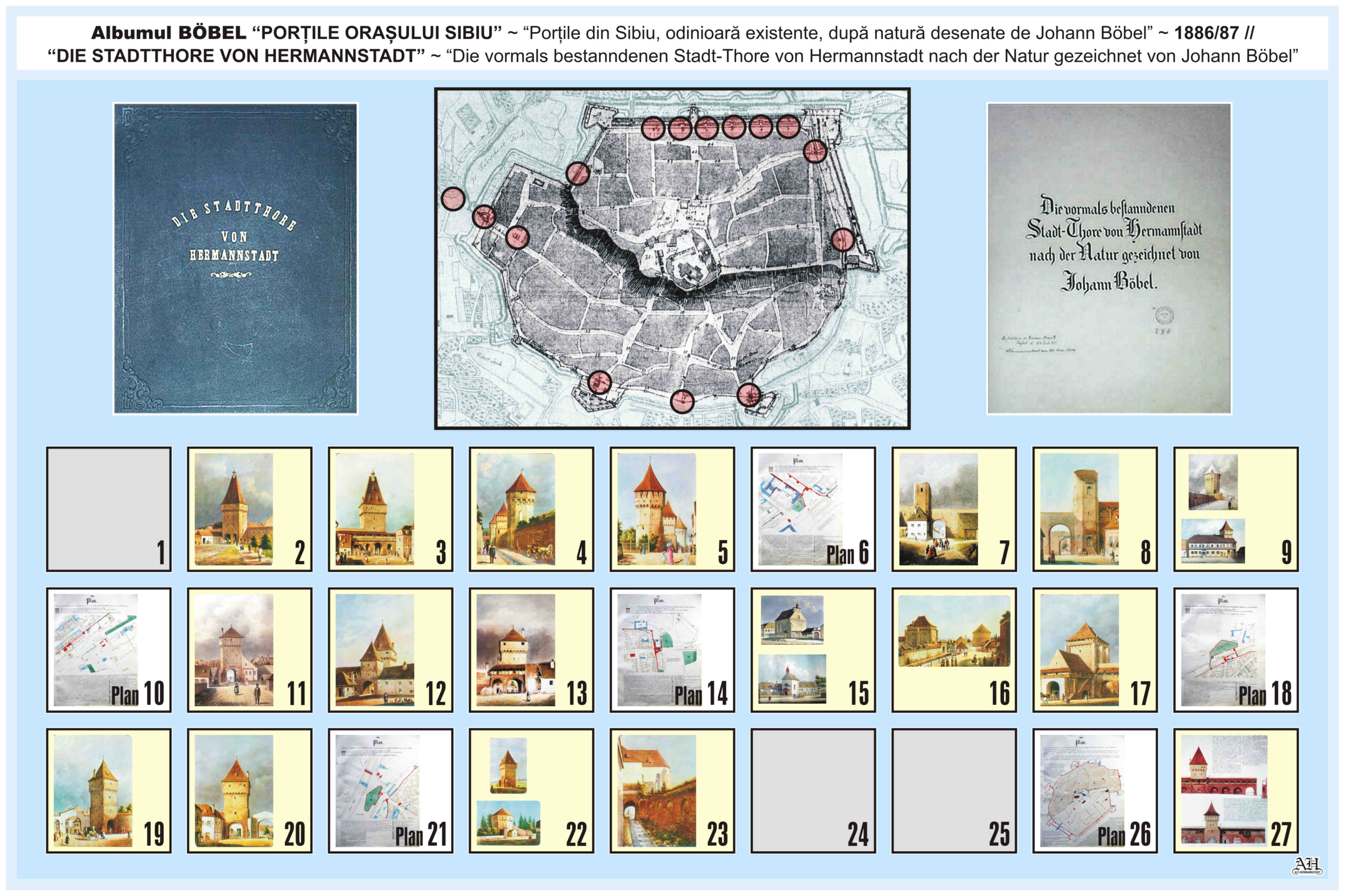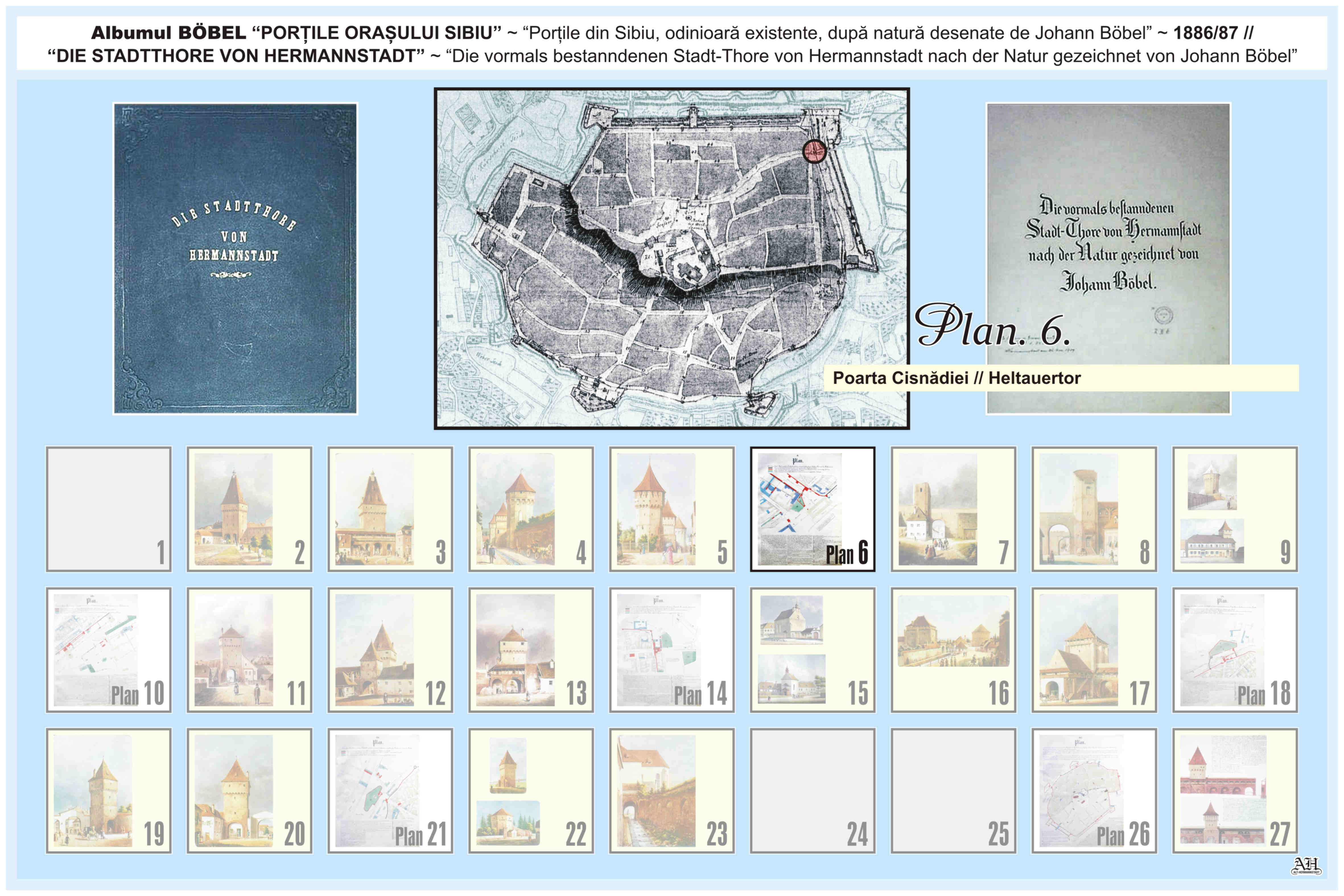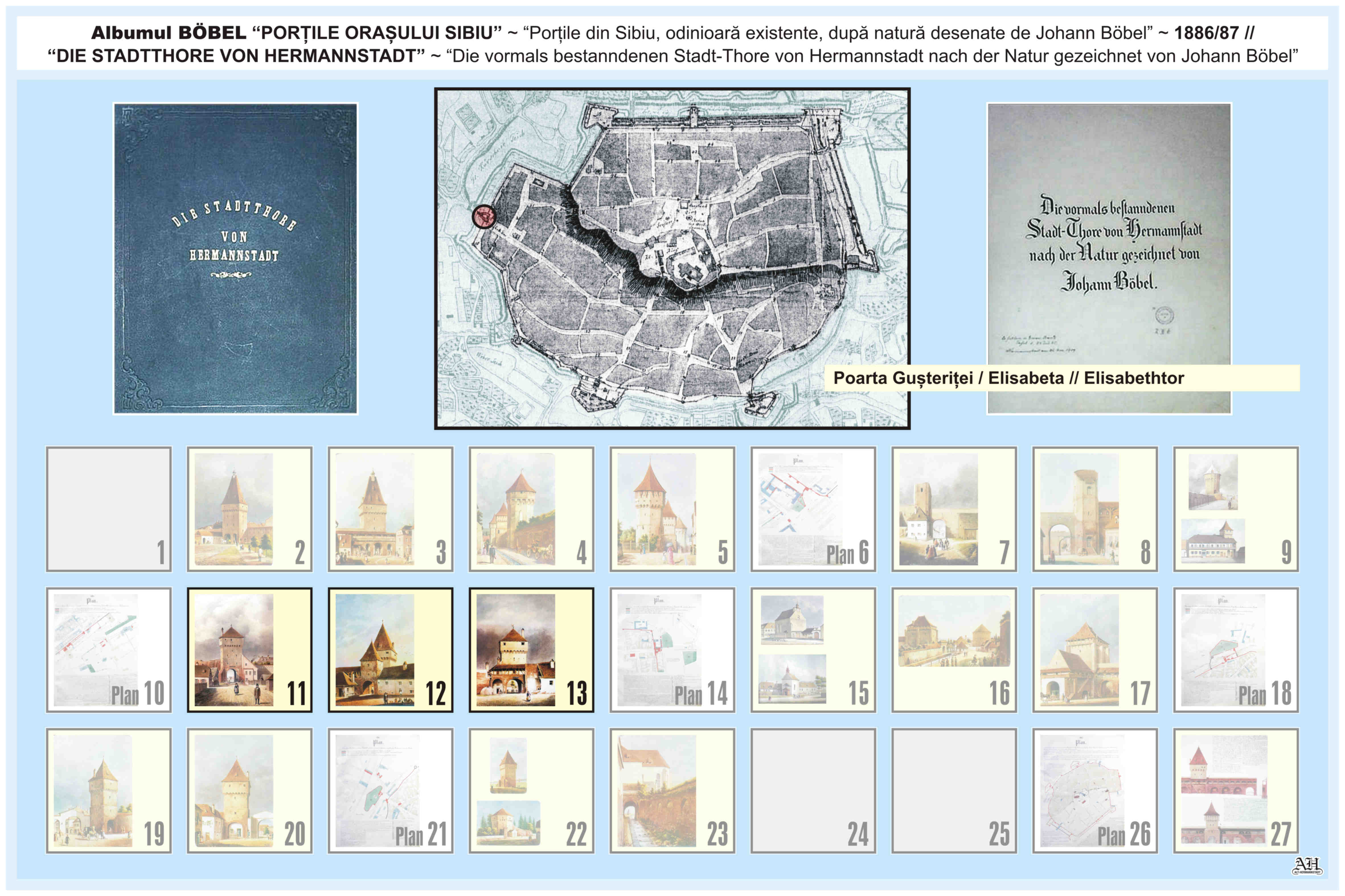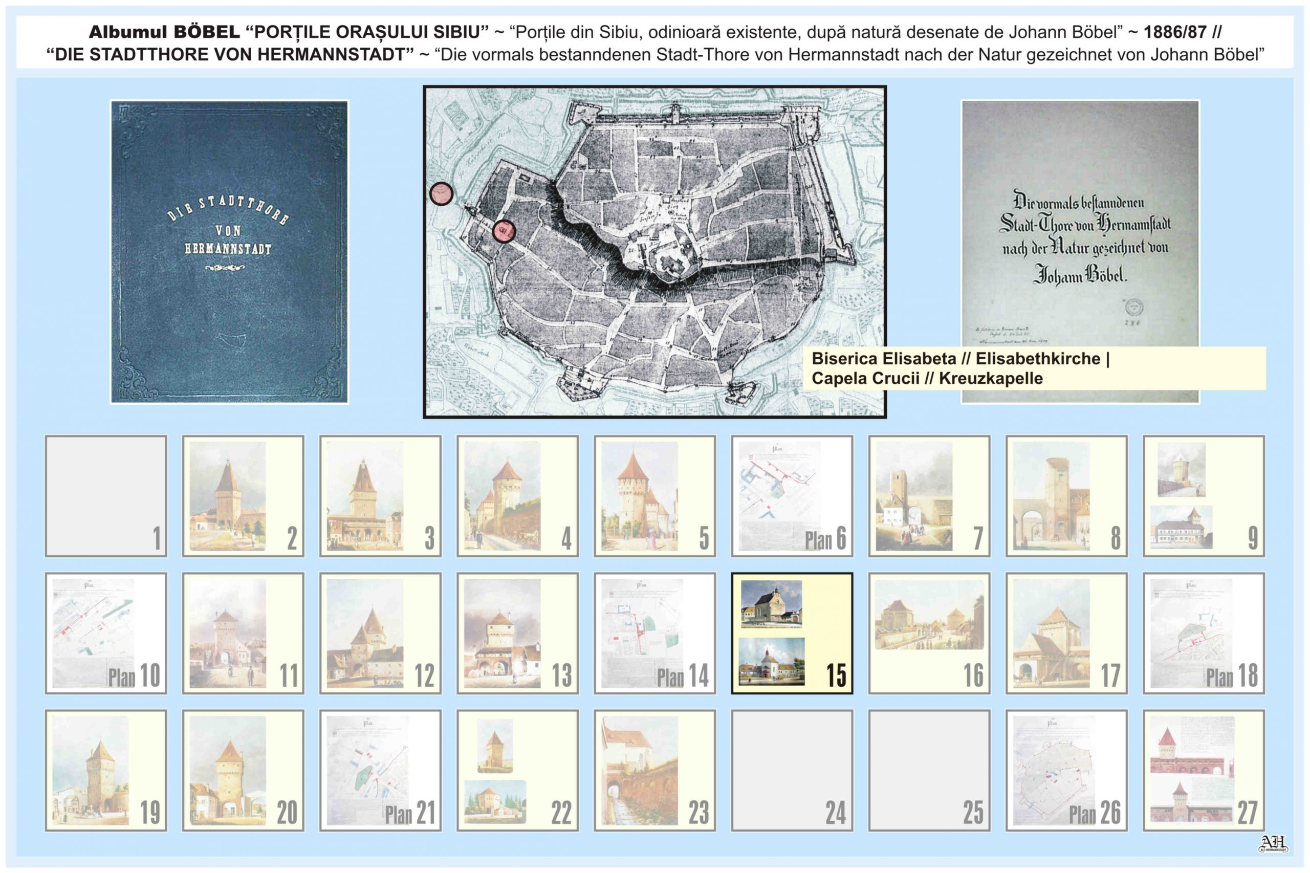 Renumitul album realizat de Johann Böbel poartă titlul: „Die vormals bestanndenen Stadt-Thore von Hermannstadt nach der Natur gezeichnet” // „Porțile din Sibiu odinioară existente după natură desenate” (traducere mot-a-mot „Porțile odinioară existente ale Sibiului după natură desenate”). Albumul a fost descoperit după moartea artistului, survenită în luna aprilie 1887, vezi necrologul lui Johann Böbel(*). Existența albumului este atestată și într-un articol apărut în Korrespondenzblatt des Vereins für Siebenbürgische Landeskunde din 27 august 1887.
