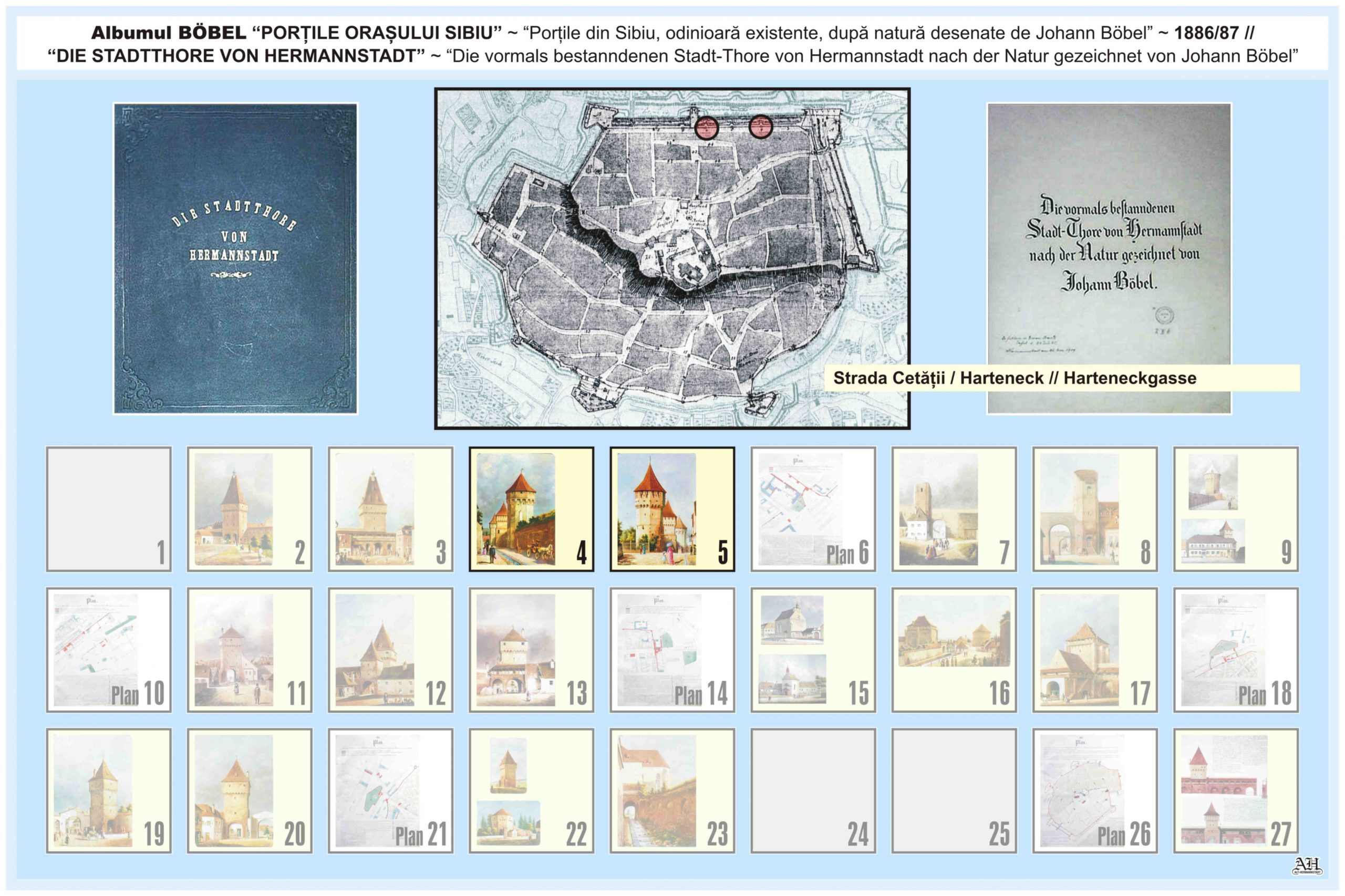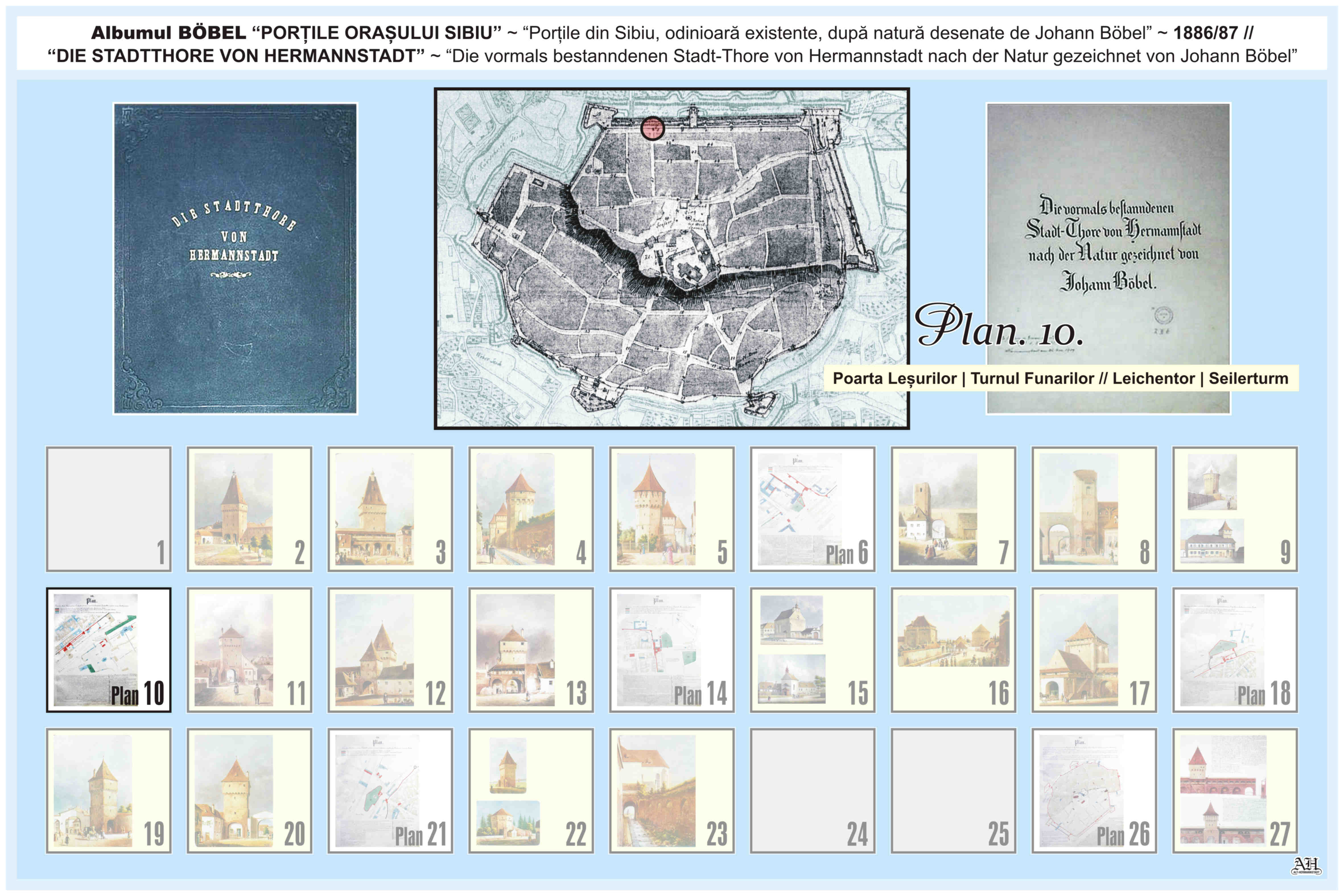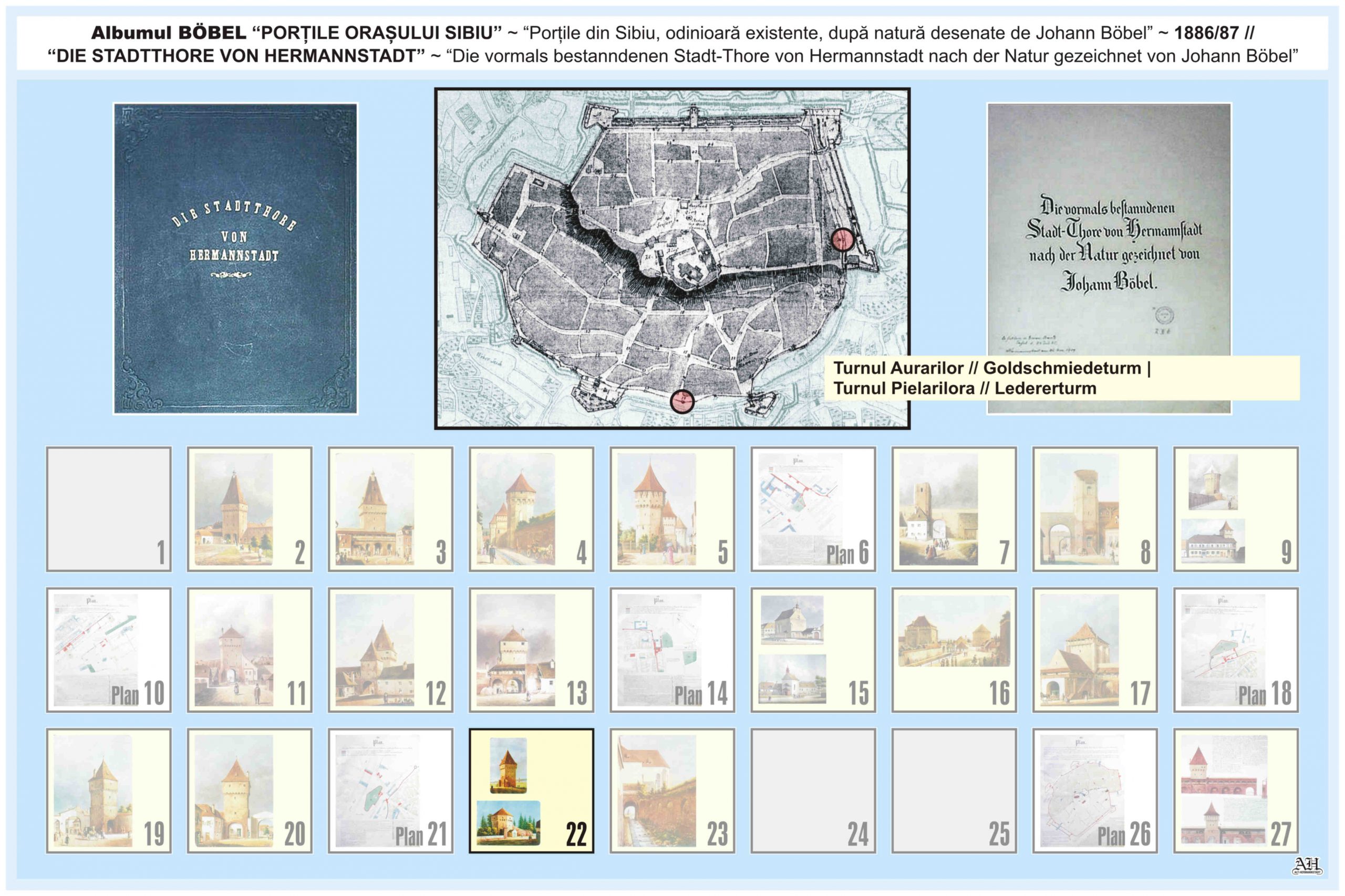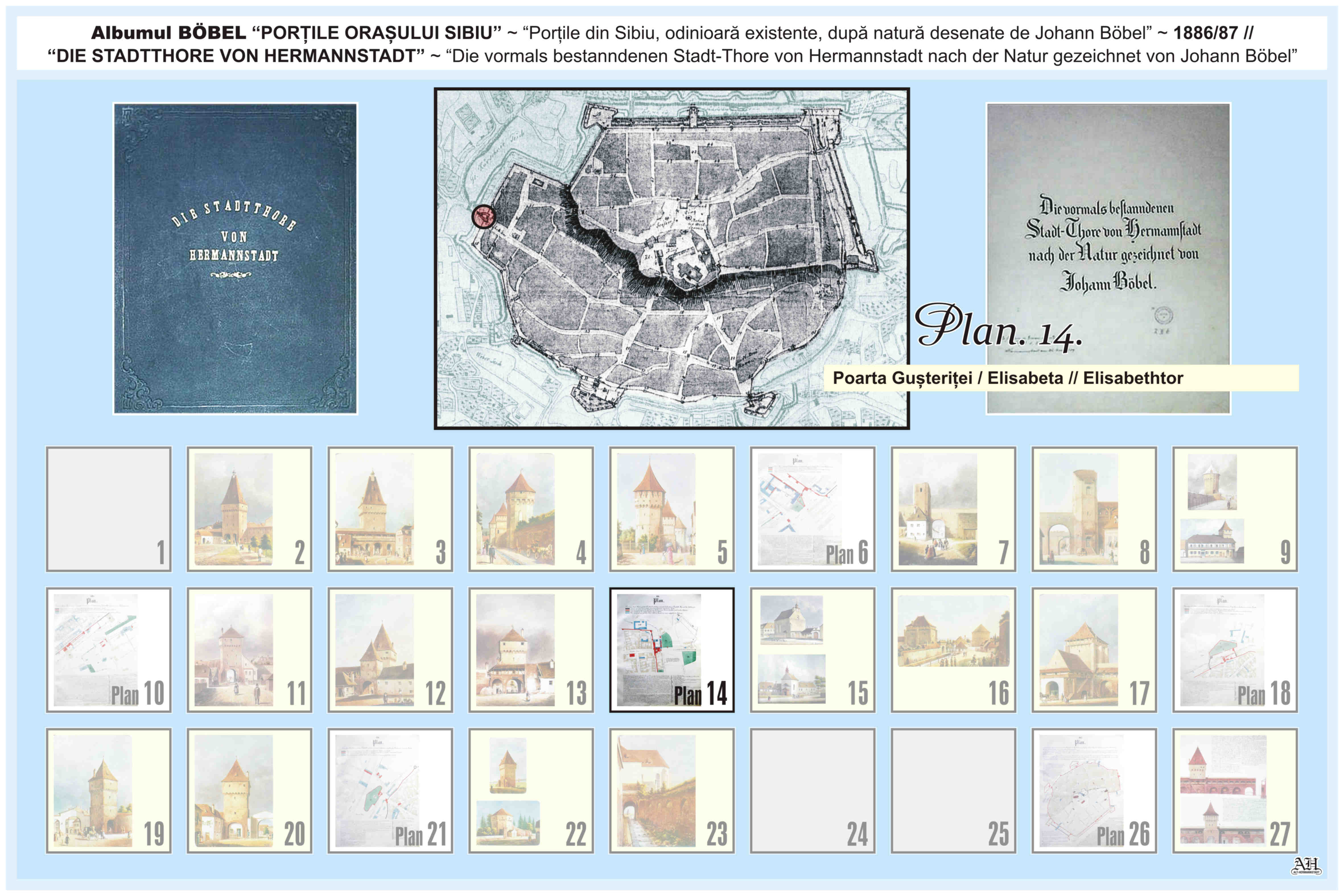 Renumitul album realizat de Johann Böbel poartă titlul: „Die vormals bestanndenen Stadt-Thore von Hermannstadt nach der Natur gezeichnet” // „Porțile din Sibiu odinioară existente după natură desenate” (traducere mot-a-mot „Porțile odinioară existente ale Sibiului după natură desenate”). Albumul a fost descoperit după moartea artistului, survenită în luna aprilie 1887, vezi necrologul lui Johann Böbel(*). Existența albumului este atestată și într-un articol apărut în Korrespondenzblatt des Vereins für Siebenbürgische Landeskunde din 27 august 1887.