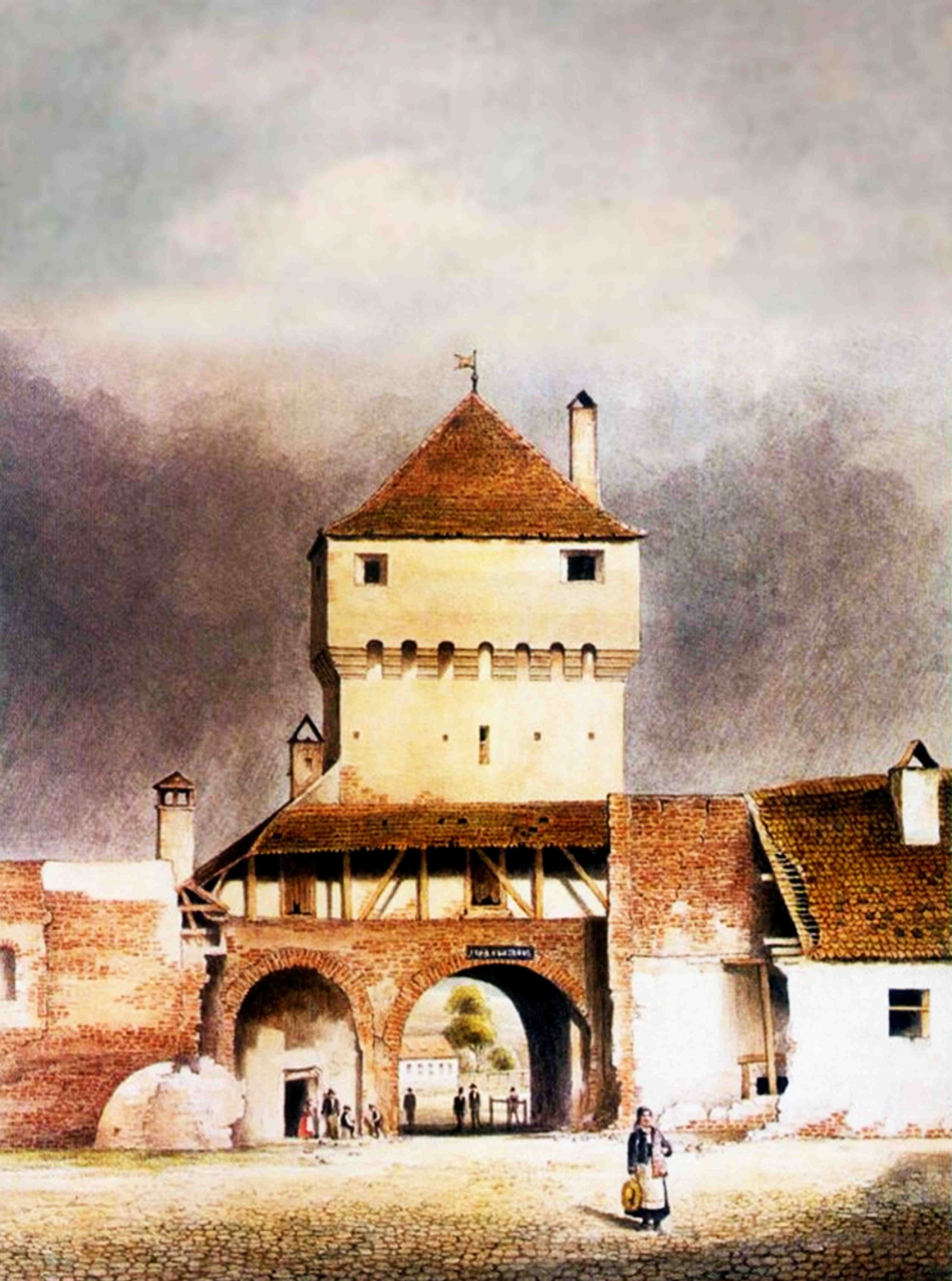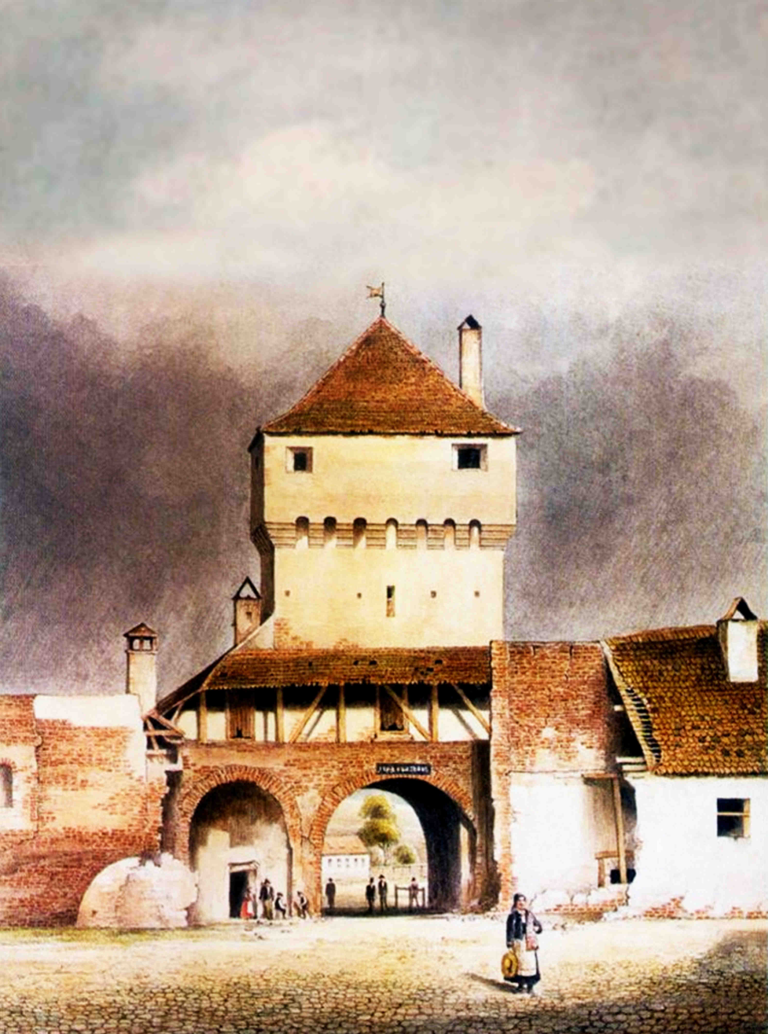 „Sagtor und Sagturm von außen gesehen” // „Poarta și Turnul Sag văzute din exterior” ~ Johann Böbel 1858