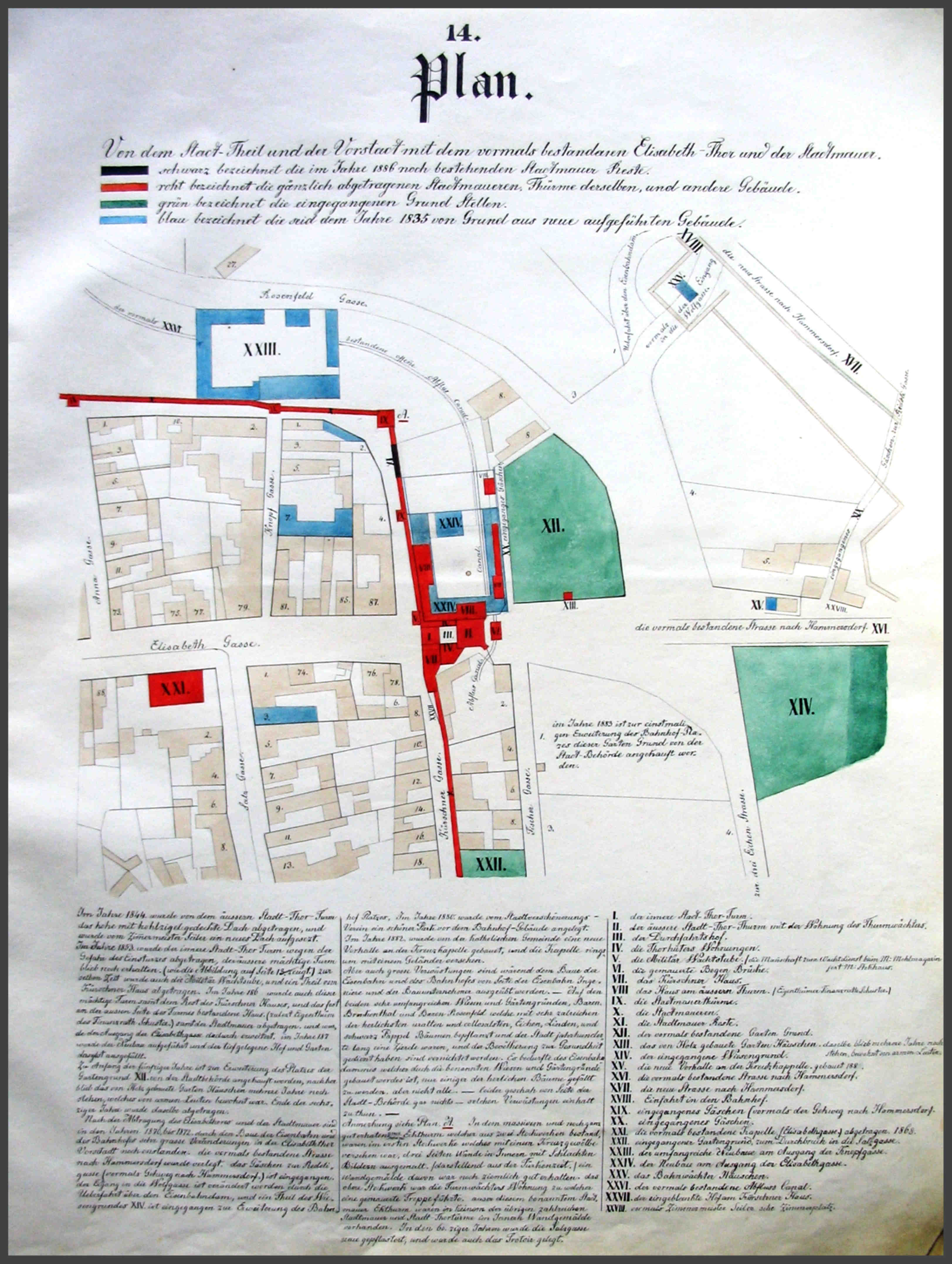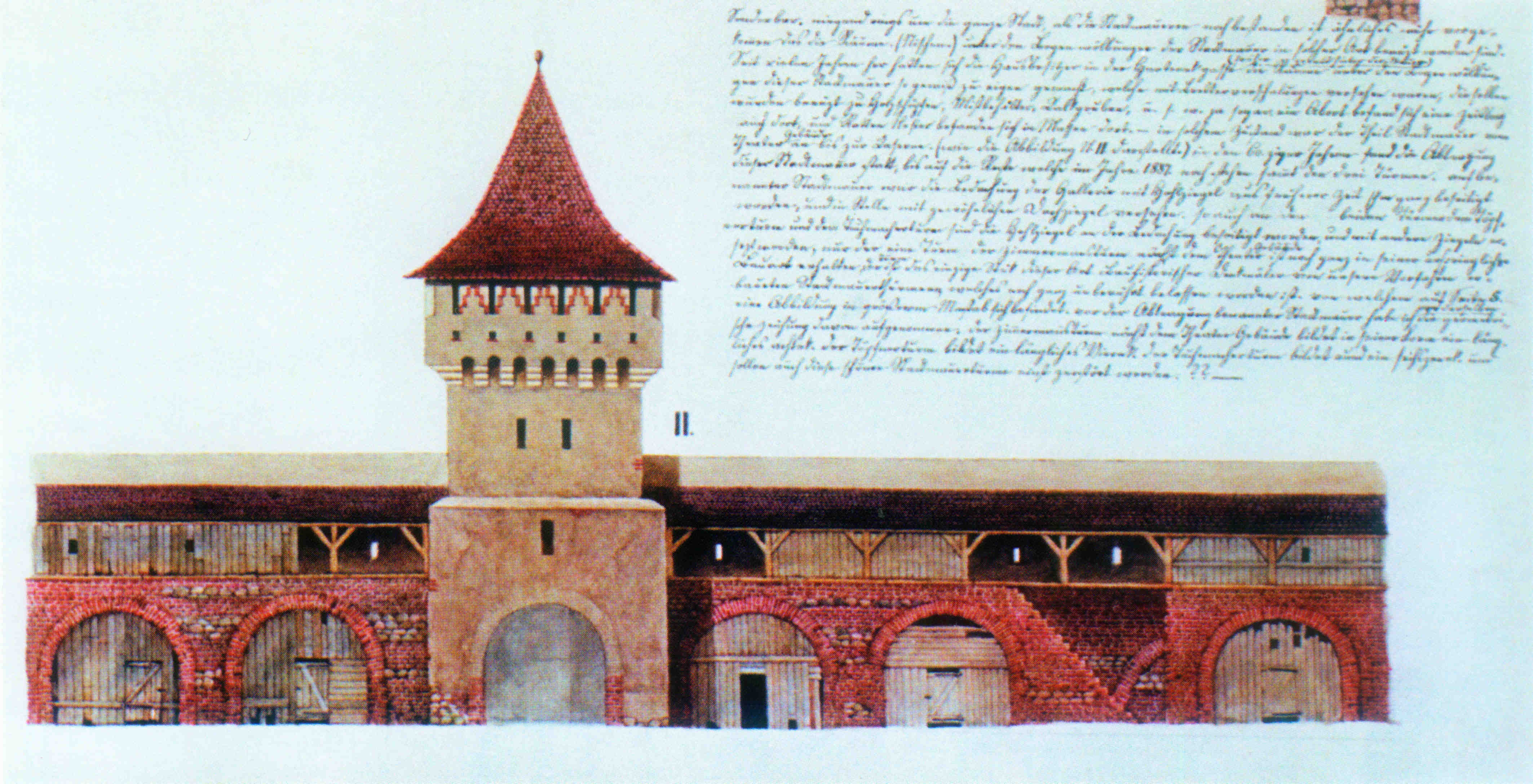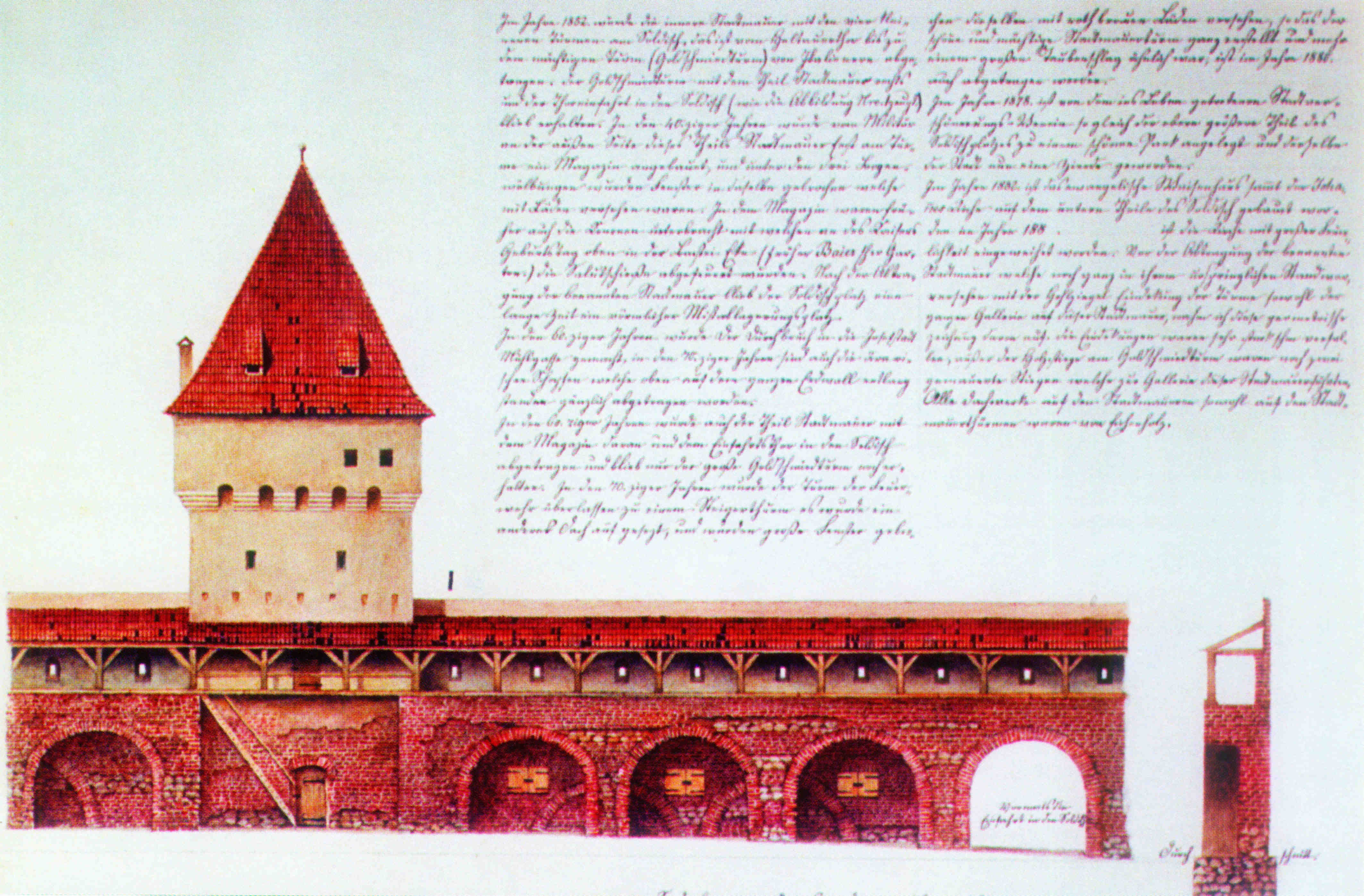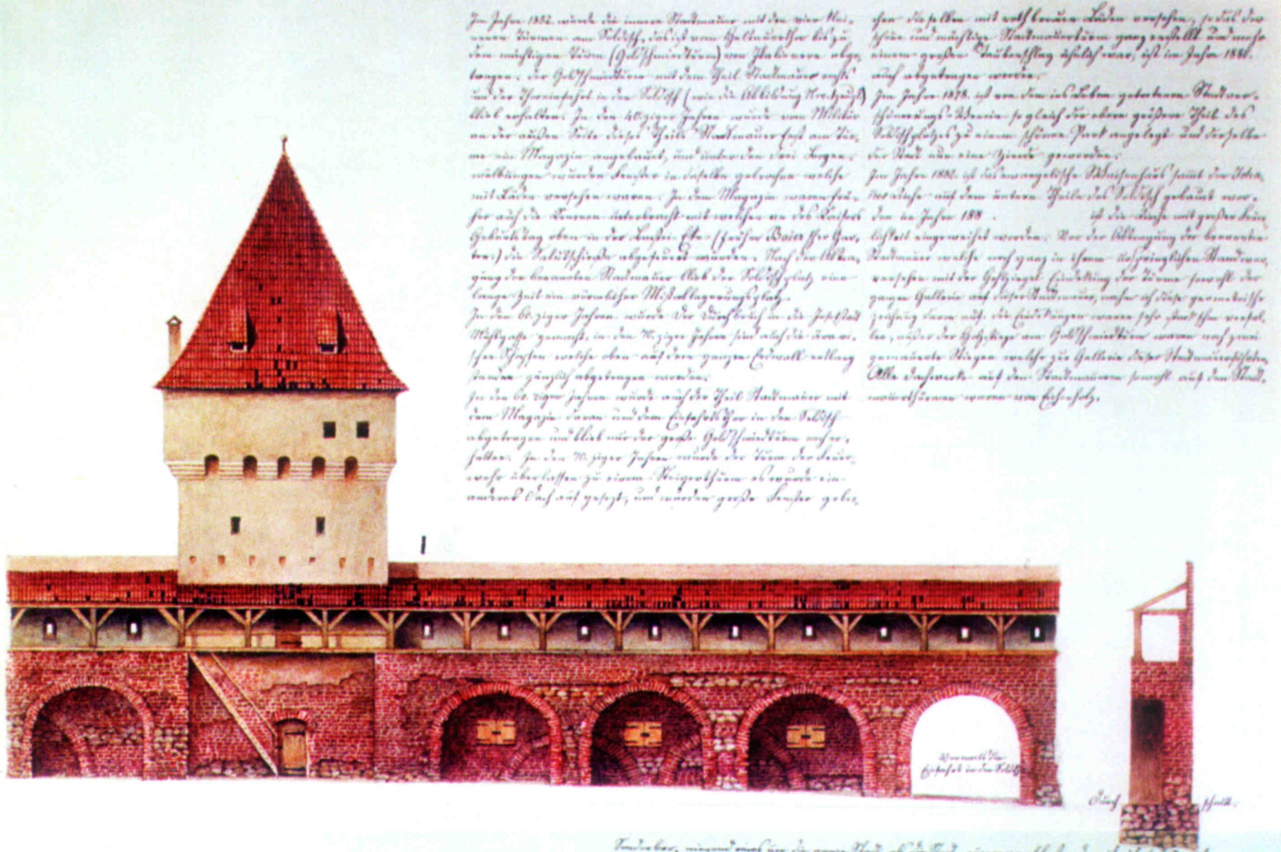 „Zu Anfang der 60ziger Jahre wurde die Stadtmauer vom Elisabethor bis zum vormal bestandenen Burgerthor, Sagthor und bis zur Zeughof Kaserne (früher Militair Spital) sammt den auf dieser Strecke bestandenen Stadtmauer Thürmen abgetragen. 10 Schuh Höhe der Mauer blieb noch erhalten und der massive 8 eckige Thurm (Militair Magazin) am Ausgang der Mariagasse und der vormalige Pulver Thurm stehen noch 1883.“…