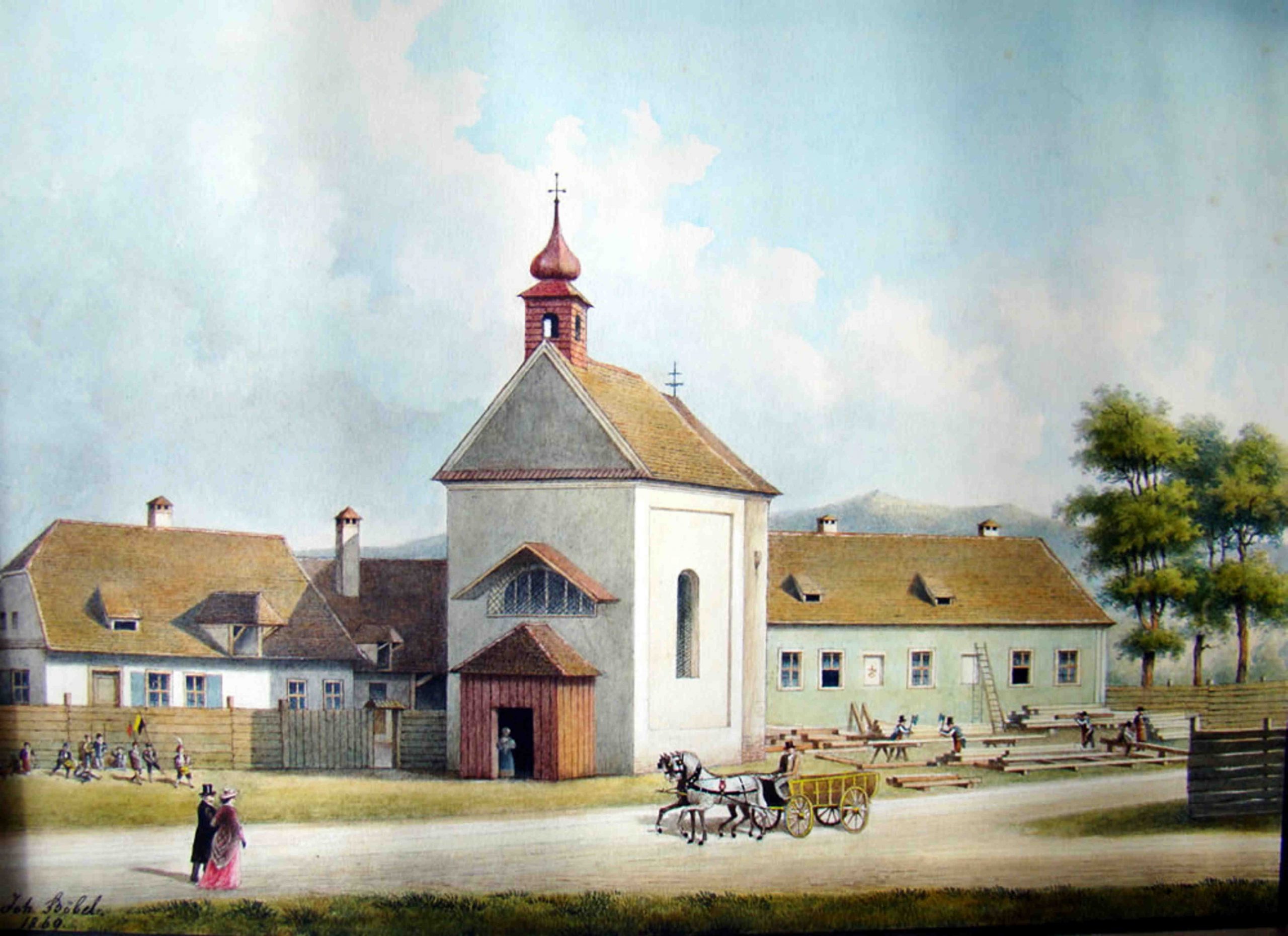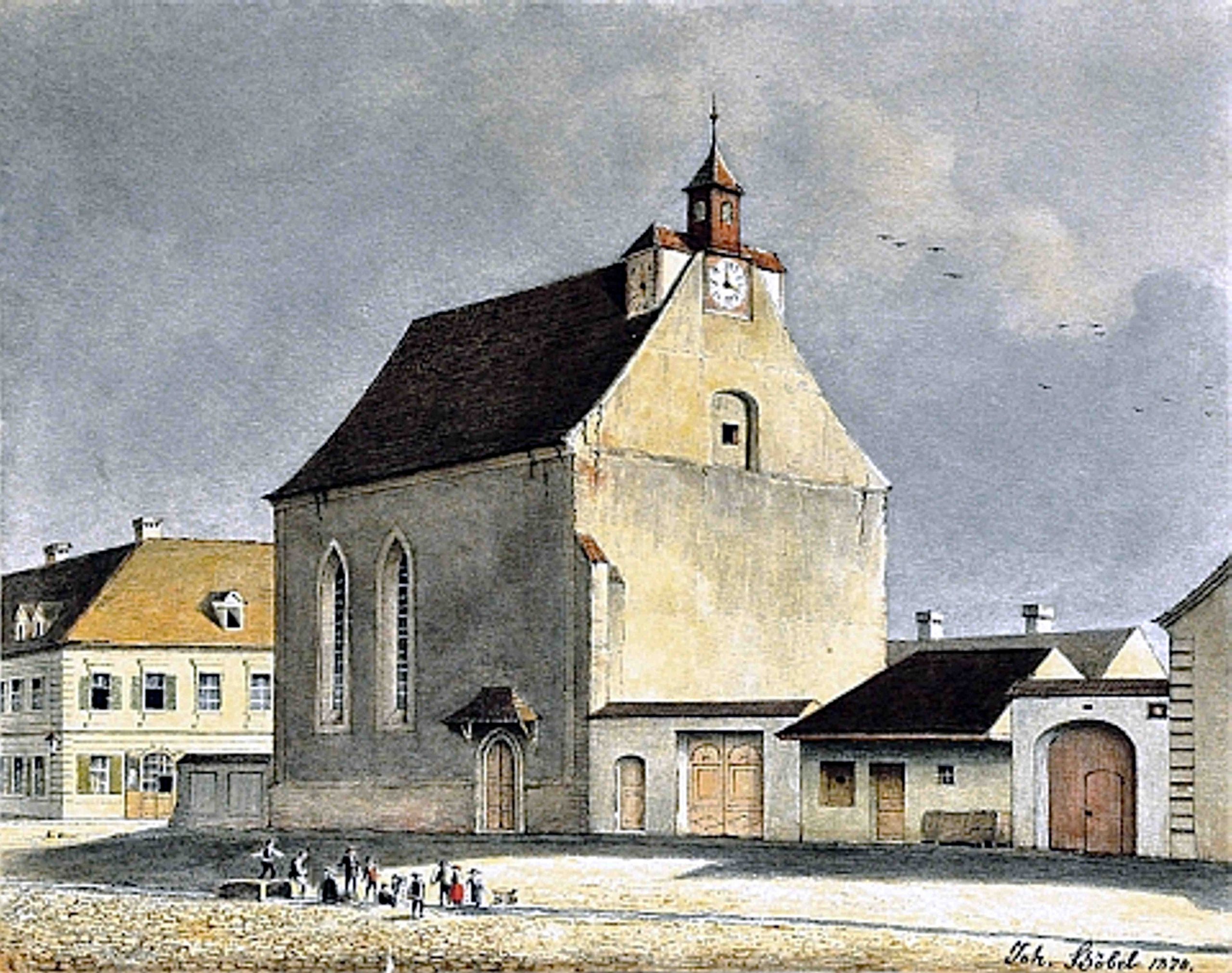 Alai de nuntași în fața portalului sudic al Bisericii Evanghelice din Piața Huet. În prim plan o mulțime de spectatori îmbrăcați în vestimentația epocii. Interesant este faptul că unii spectatori au apărut împreună cu câinii lor. În partea stângă se vede o parte din capela demolată 1898. Acuarelă realizată de Johann Böbel între 1883-1885. (sursa ilustrației: K. Klein)