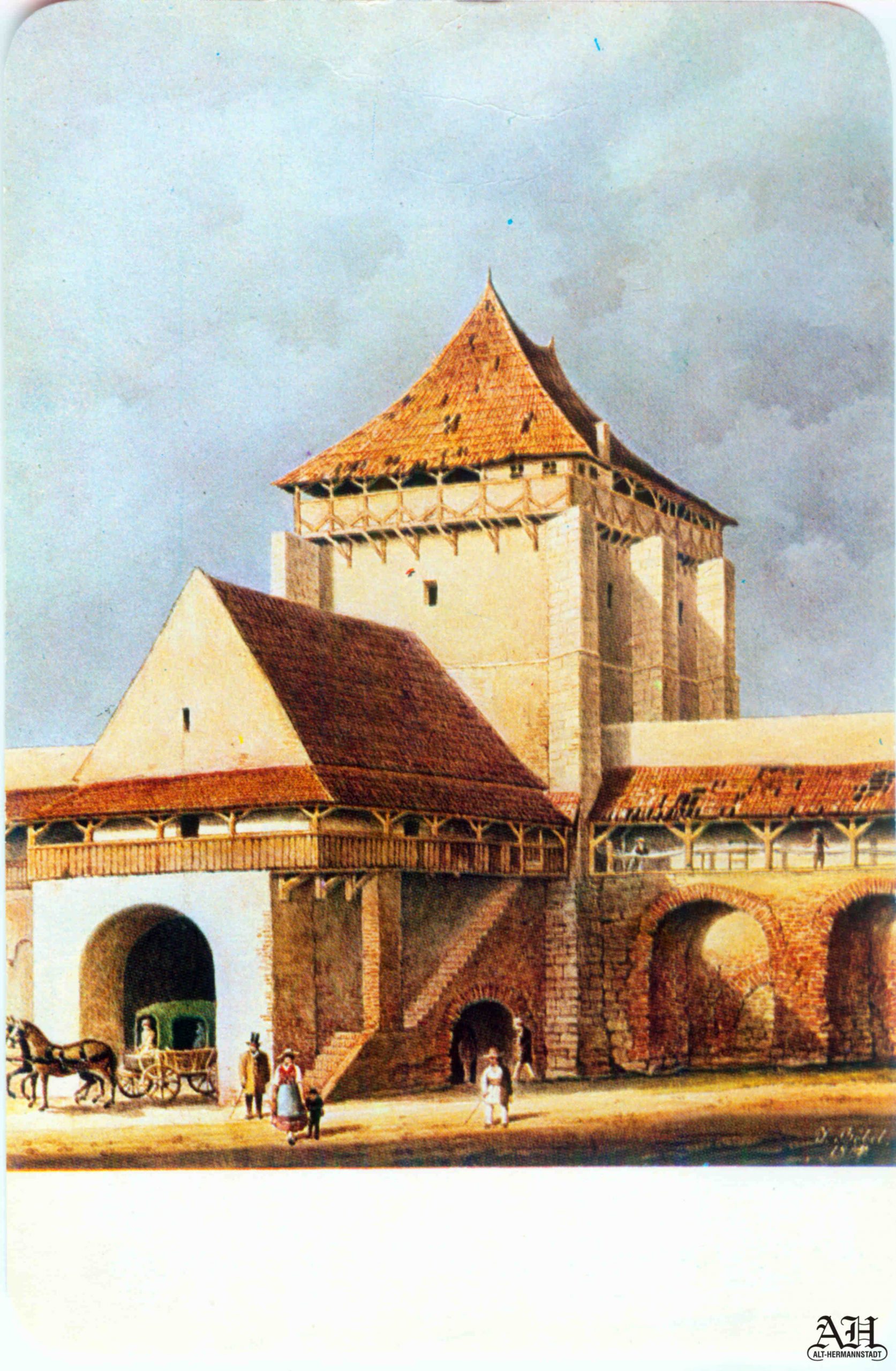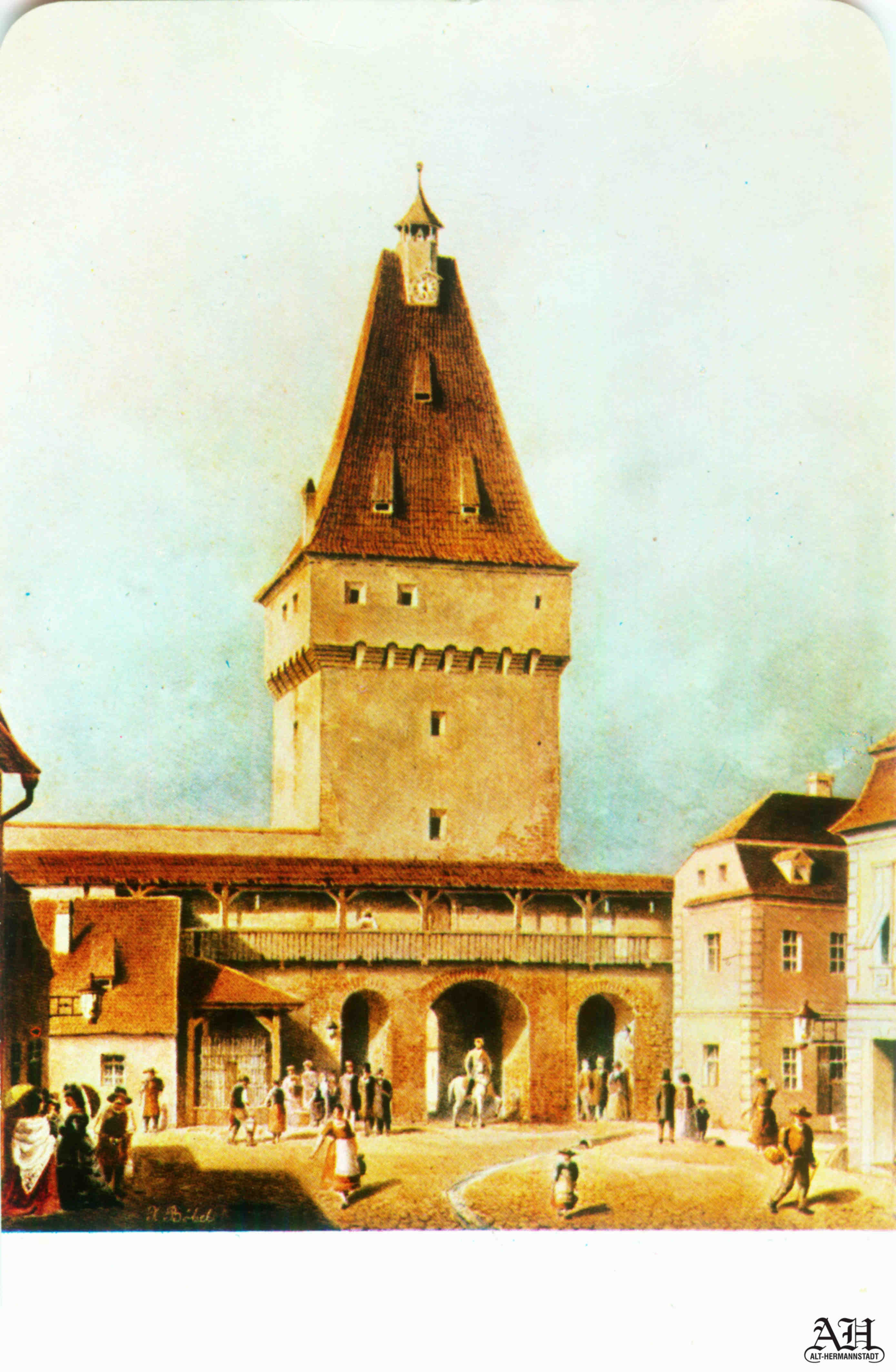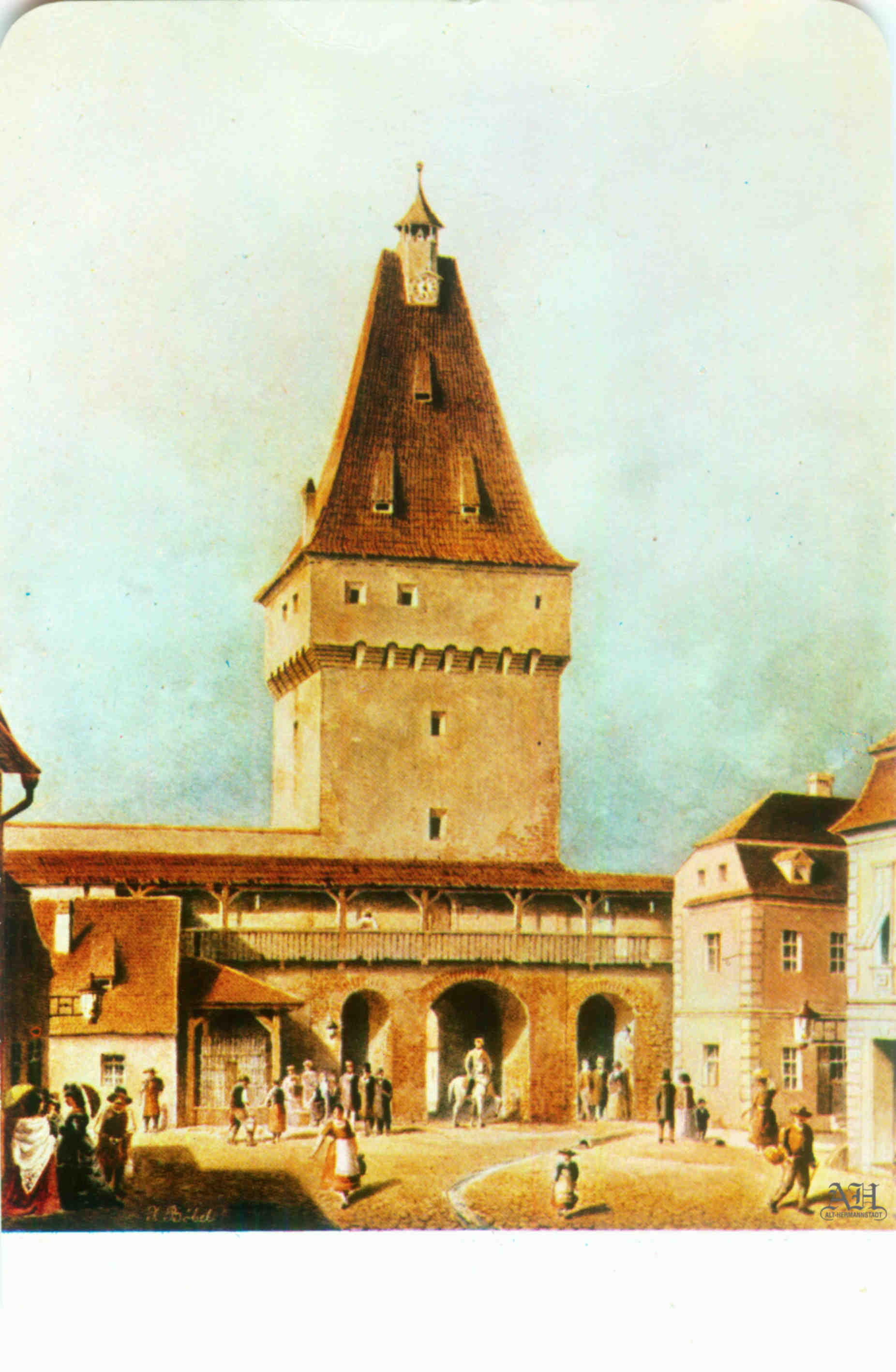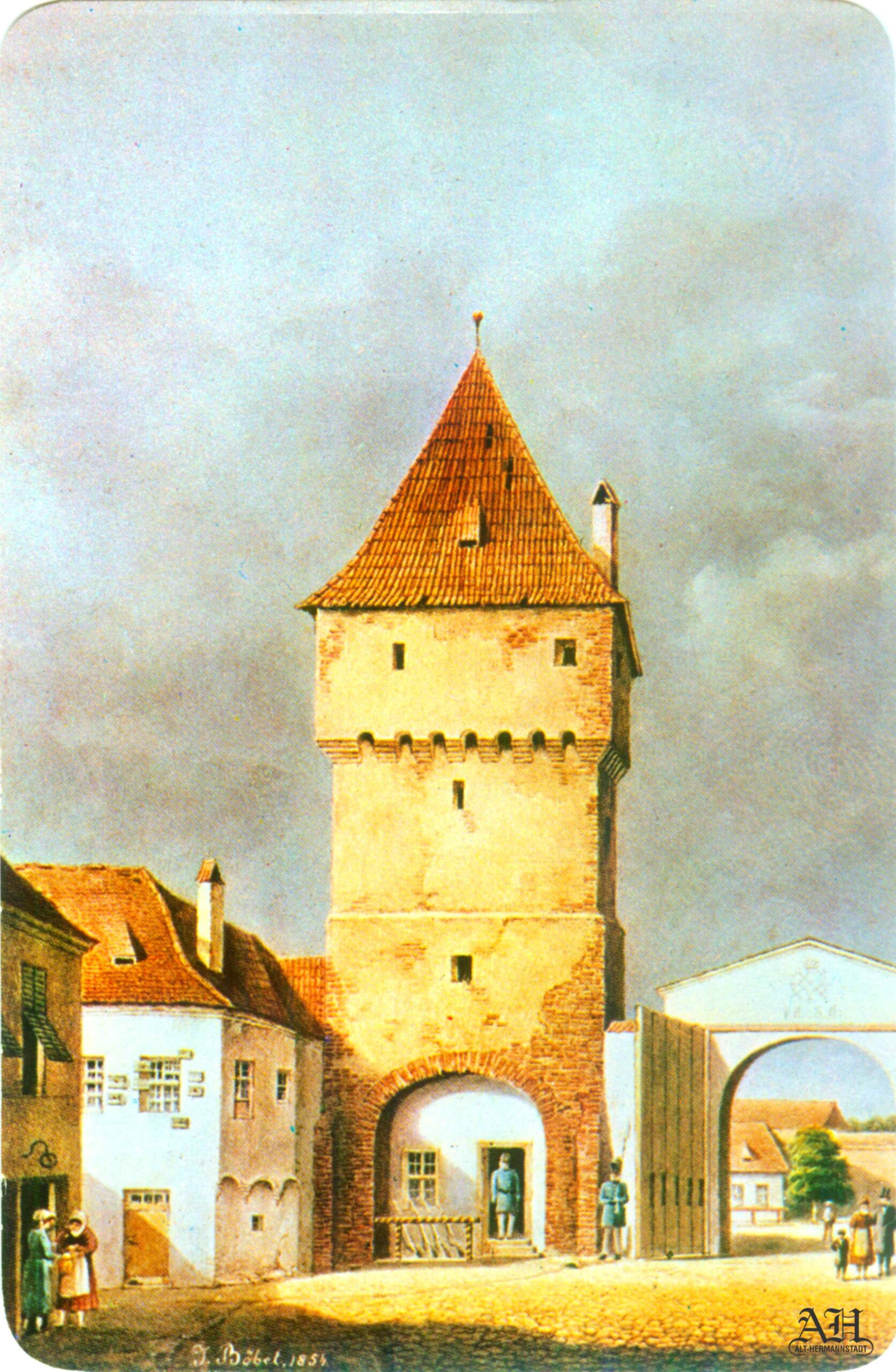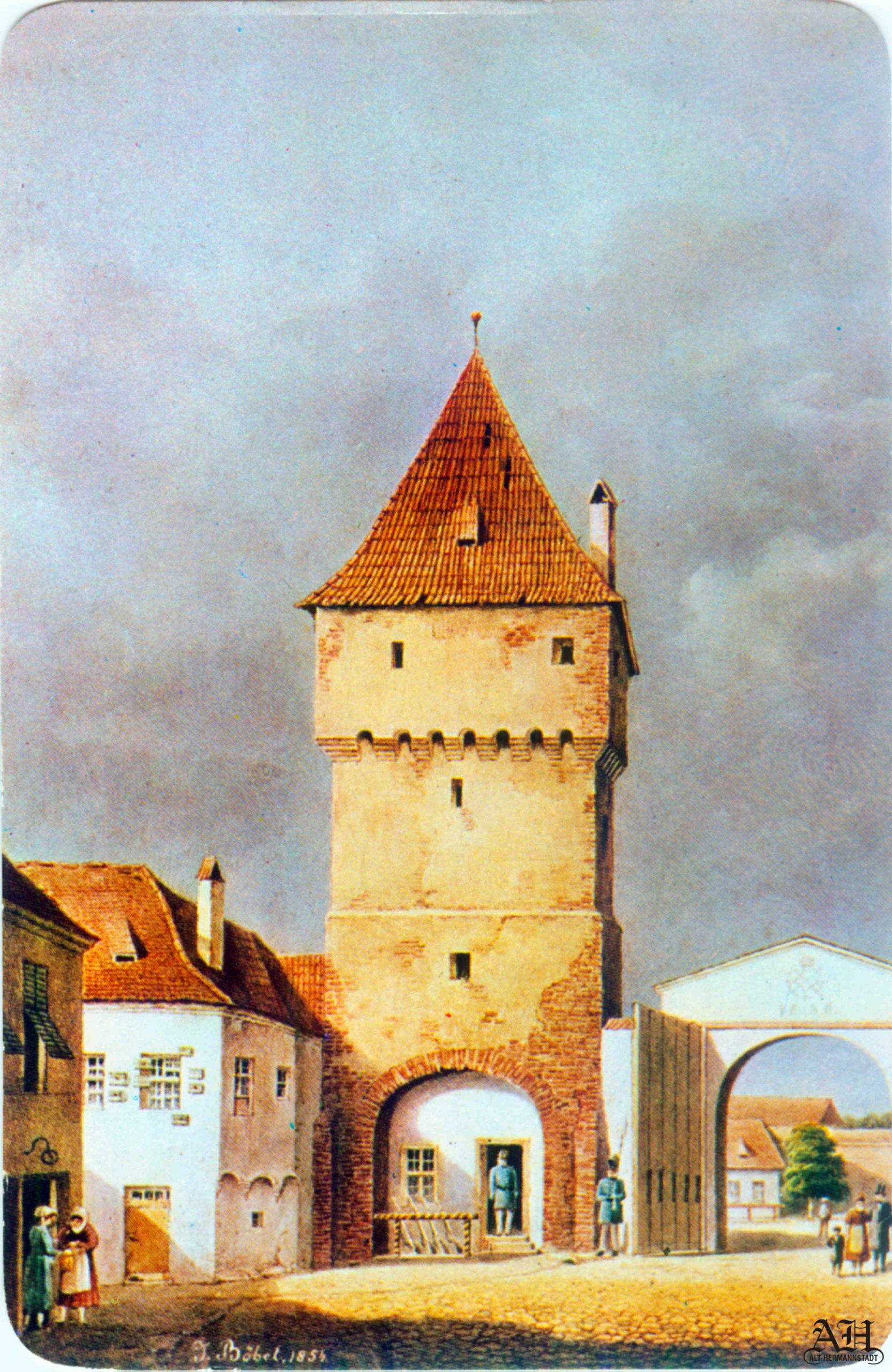 „Johann Böbel – Poarta Burger din Sibiu, vedere din exterior (demolată în 1856?)“ // „Das Hermannstädter Burgertor, Aussenansicht (abgetragen 1856?)“ – Carte Poștală, dintr-un set cu picturi executate de Johann Böbel, tipărite la Intreprinderea Poligrafică Sibiu.