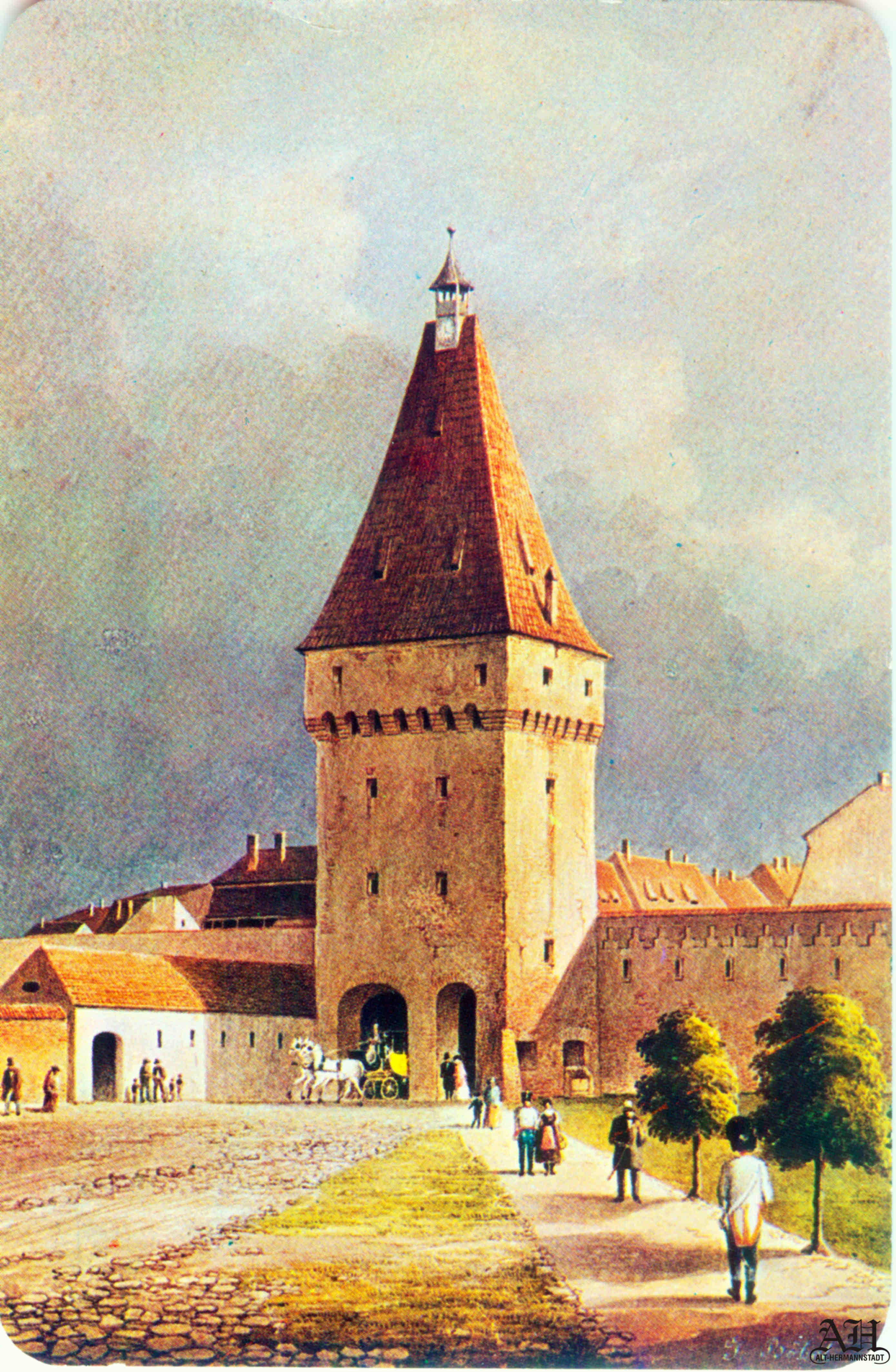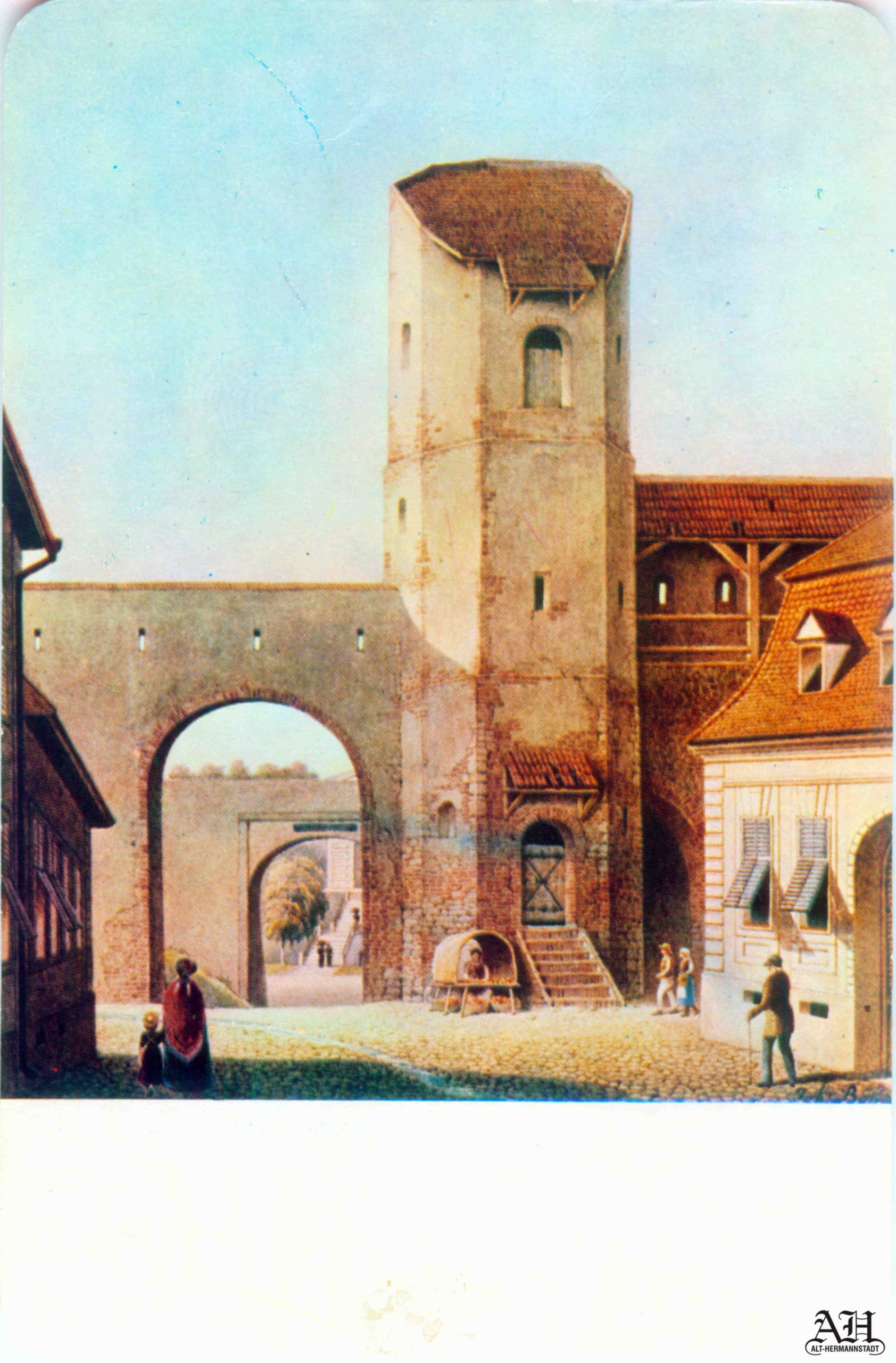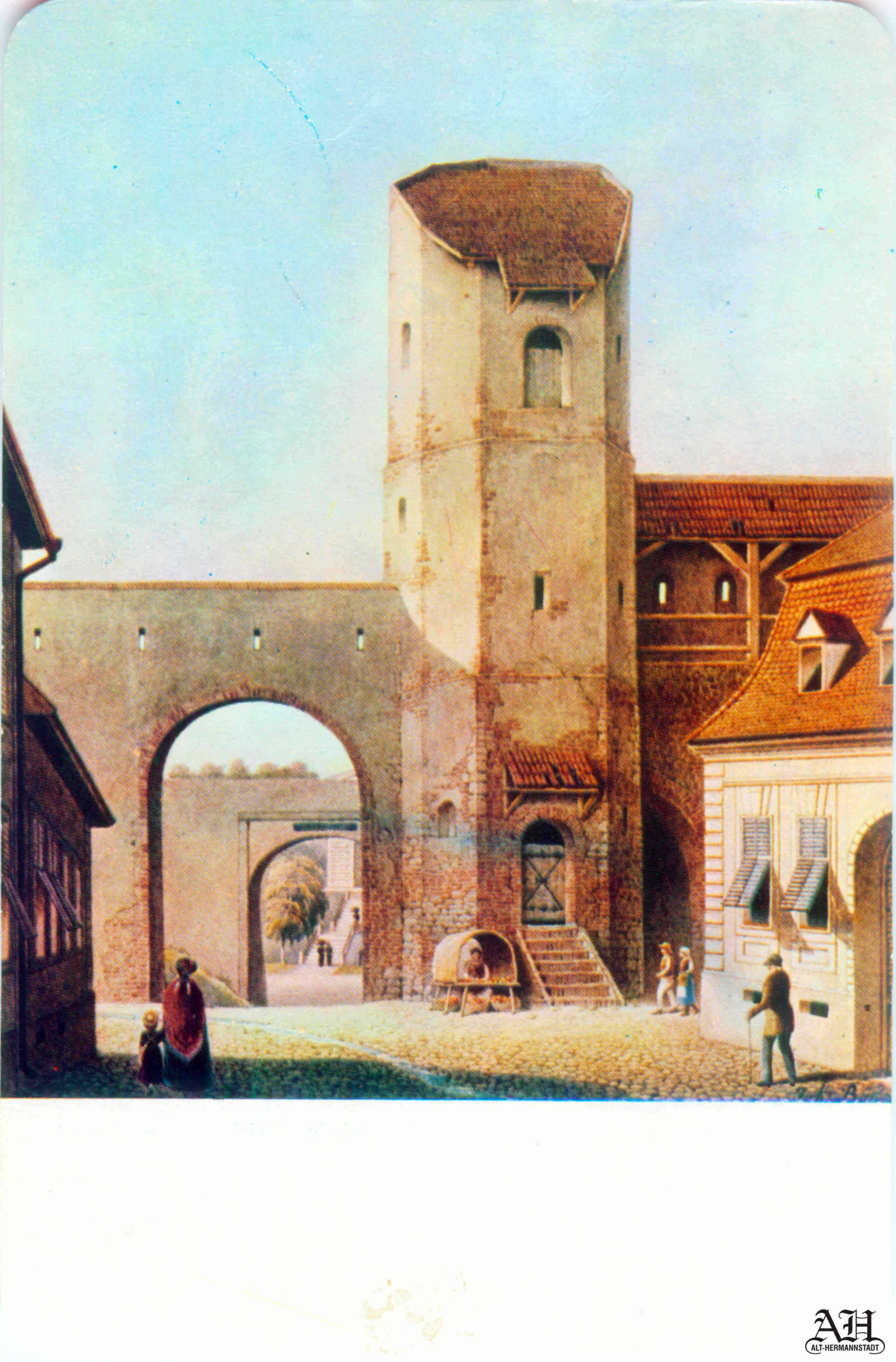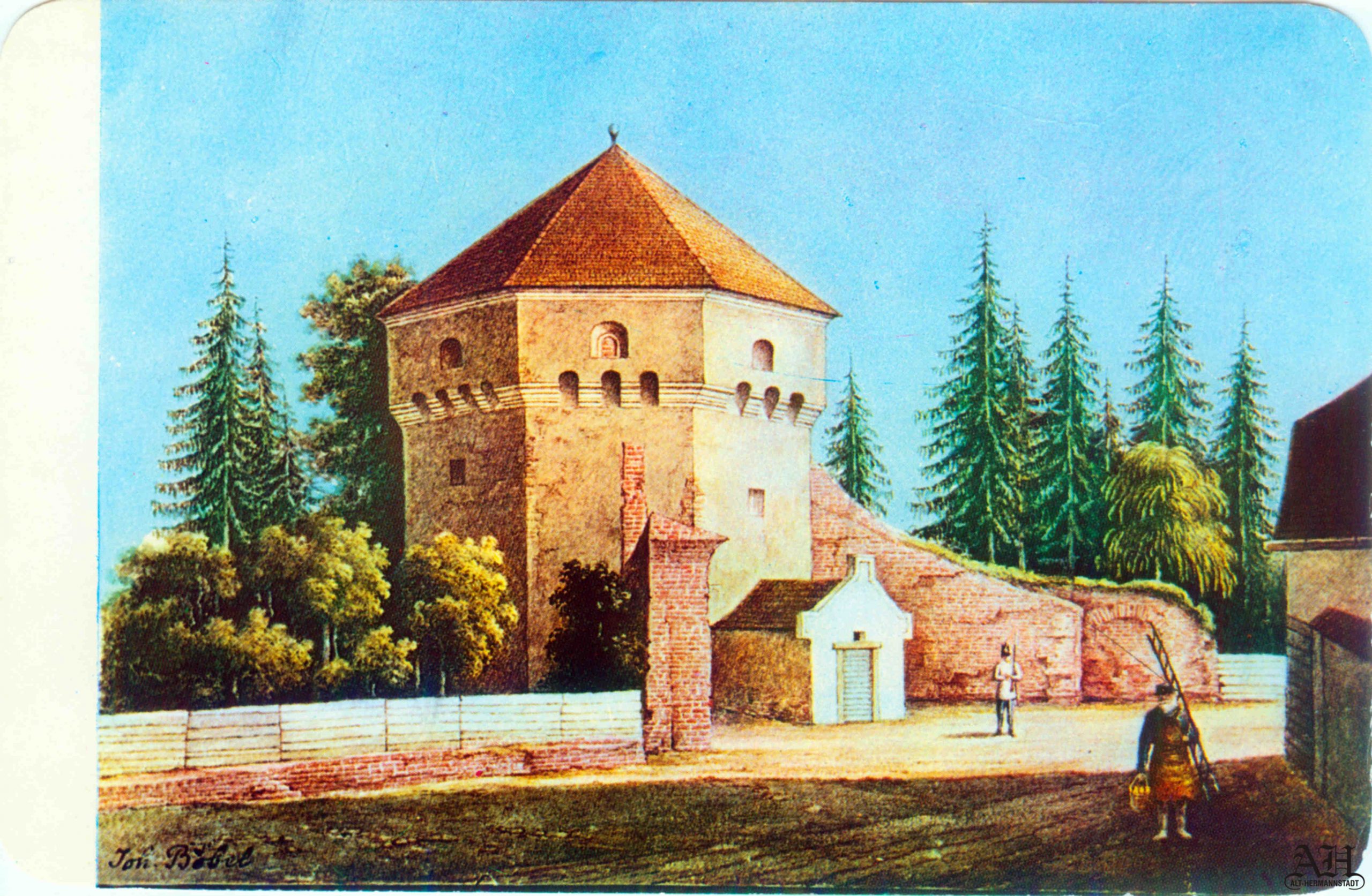 „Johann Böbel – Poarta Burger din Sibiu, vedere din exterior (demolată în 1856?)“ // „Das Hermannstädter Burgertor, Aussenansicht (abgetragen 1856?)“ – Carte Poștală, dintr-un set cu picturi executate de Johann Böbel, tipărite la Intreprinderea Poligrafică Sibiu.