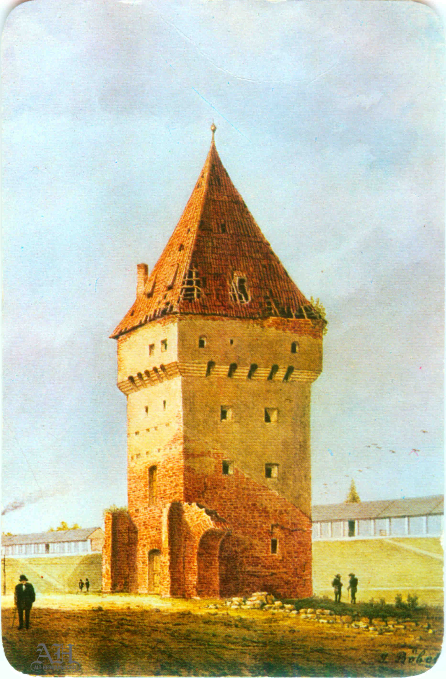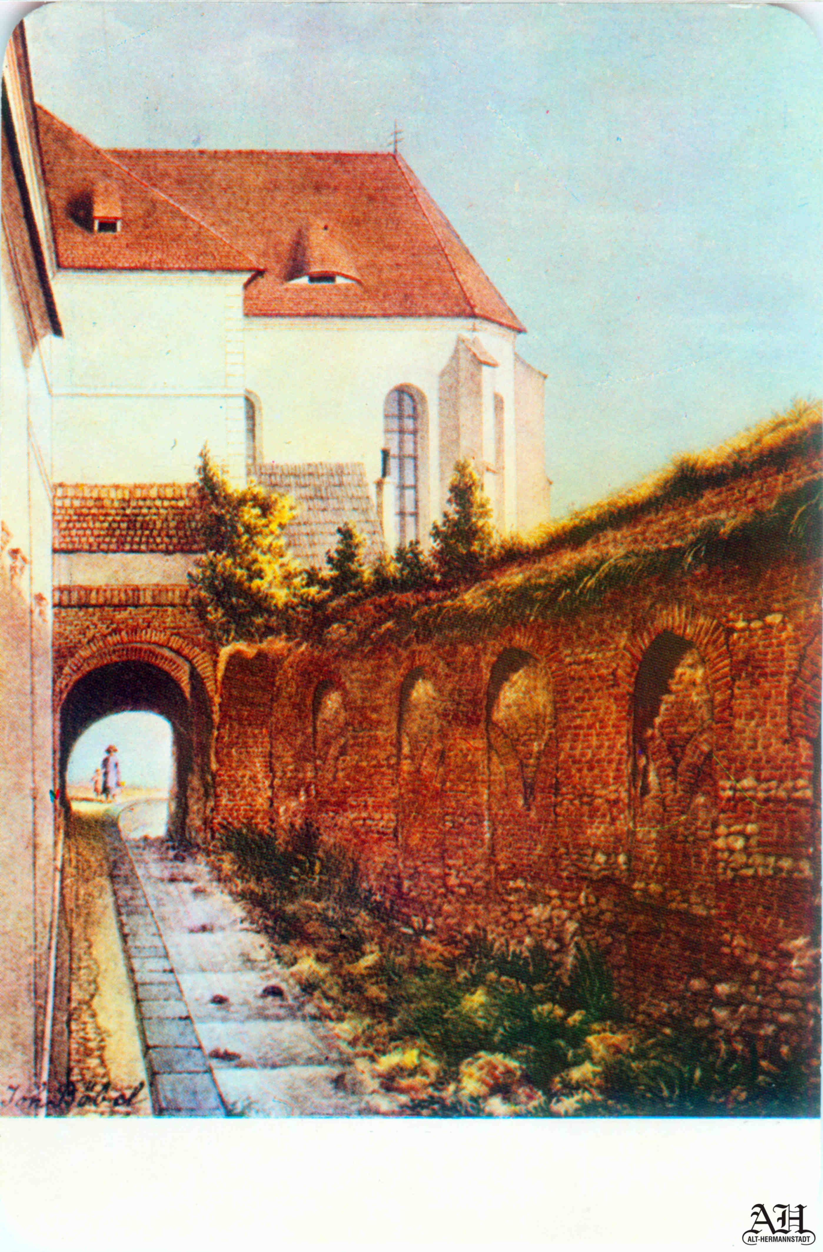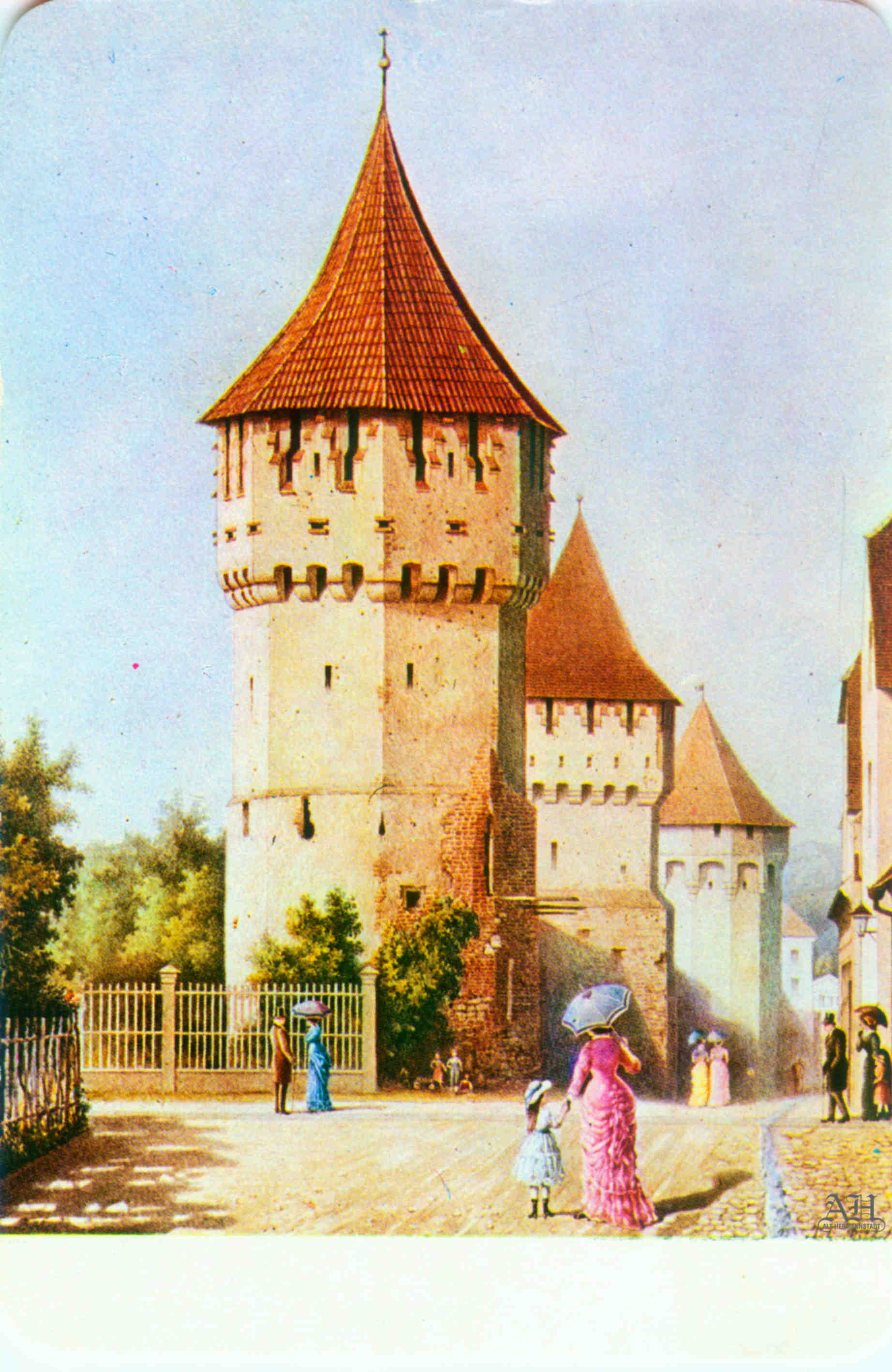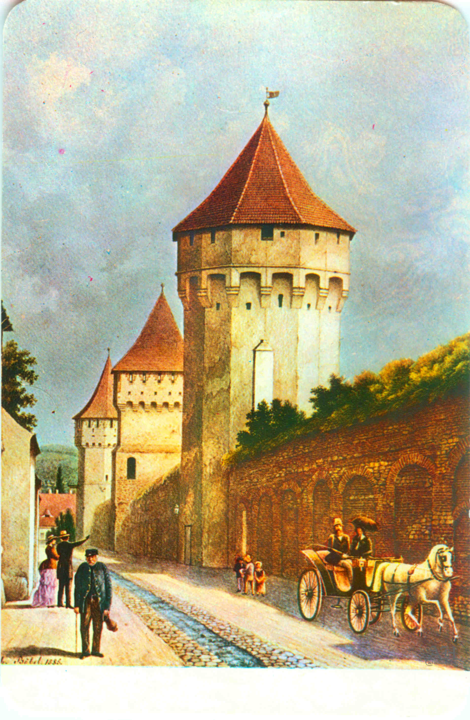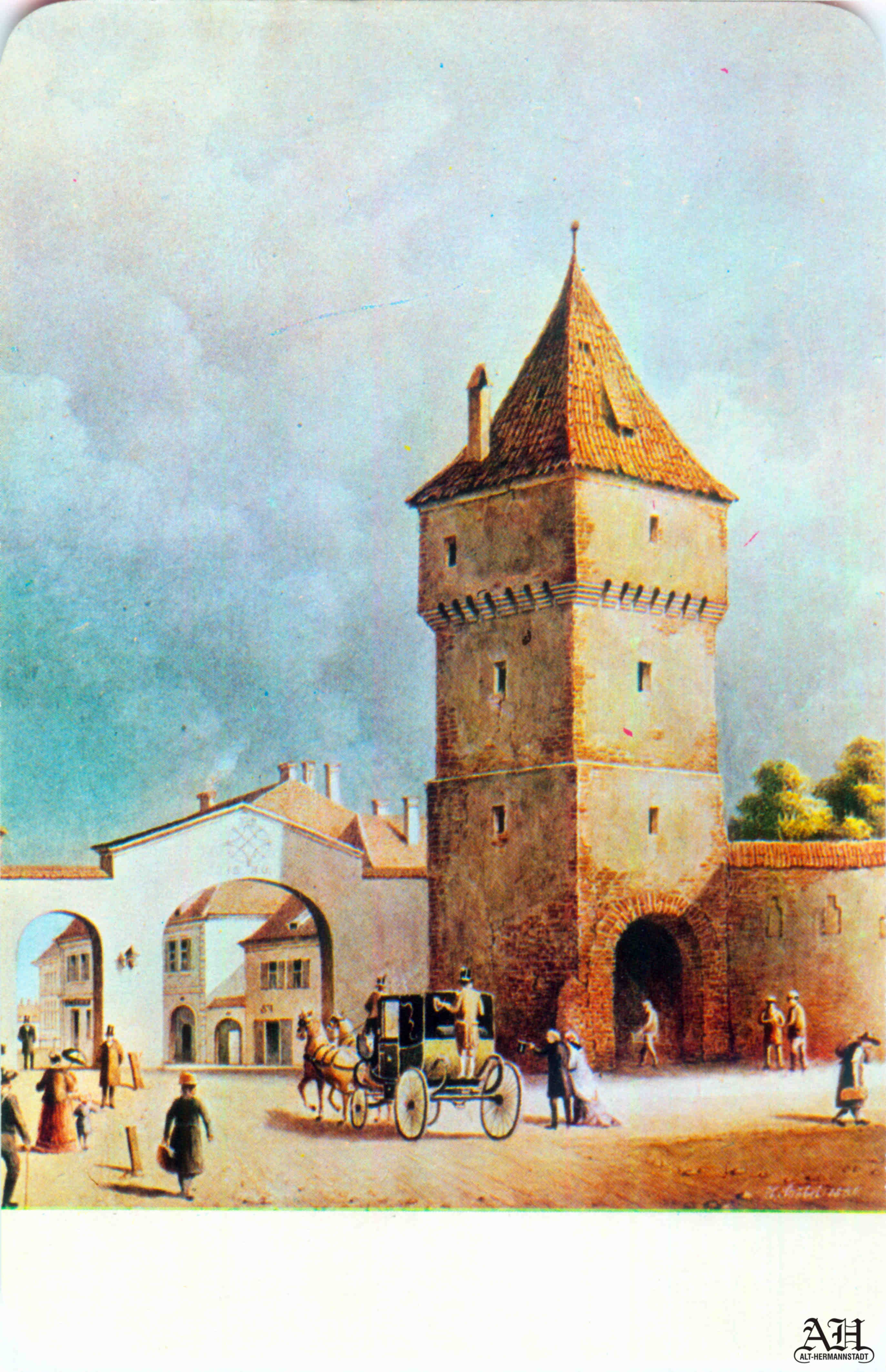 „Johann Böbel – Poarta Burger din Sibiu, vedere din exterior (demolată în 1856?)“ // „Das Hermannstädter Burgertor, Aussenansicht (abgetragen 1856?)“ – Carte Poștală, dintr-un set cu picturi executate de Johann Böbel, tipărite la Intreprinderea Poligrafică Sibiu.