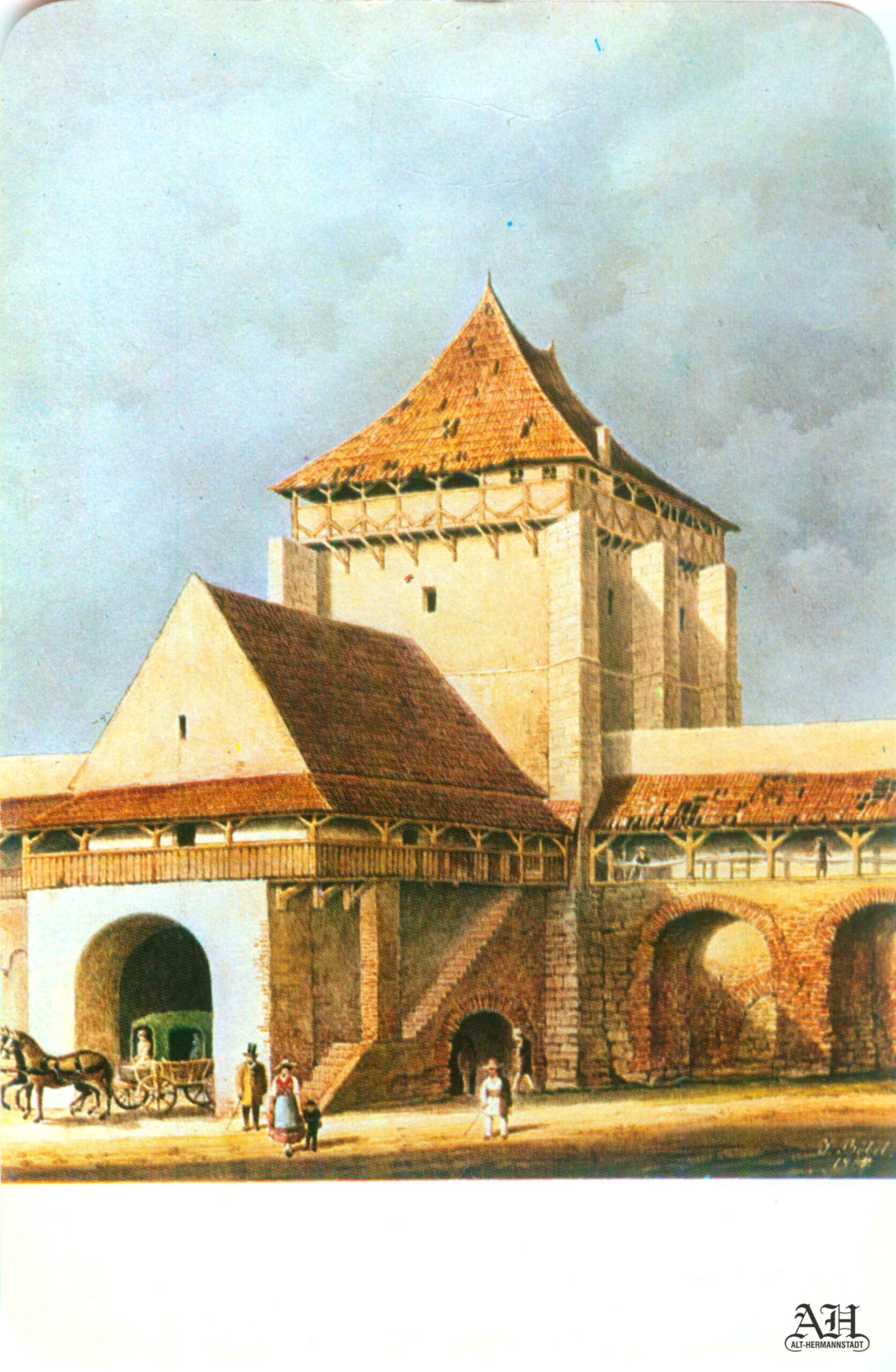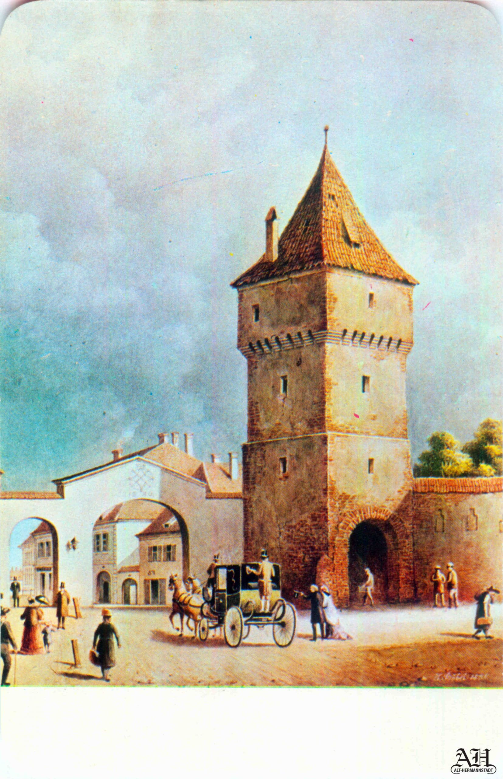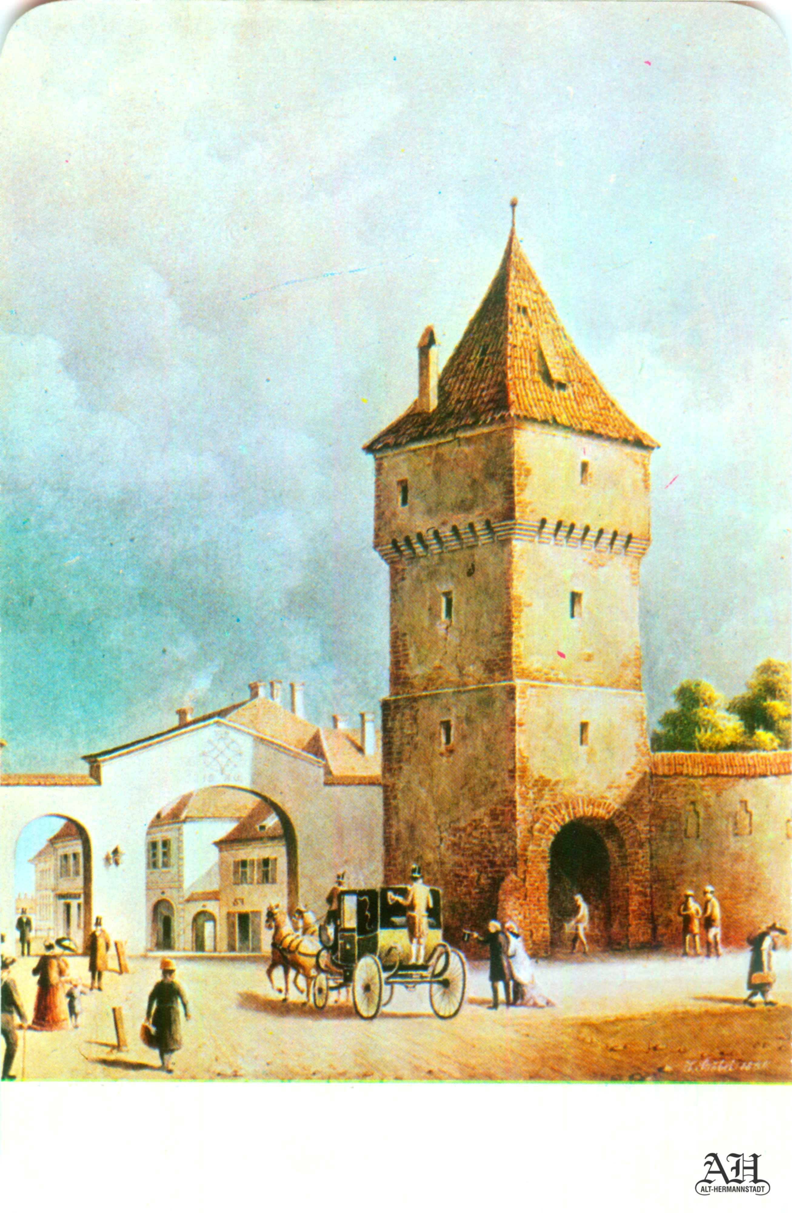 Stânga: Ilustrație realizată după o pictură de Johann Böbel arată Poarta Turnului văzută dinspre oraș. Ilustrația a fost realizată pentru albumul „Aus Alter Zeit“ // „Din vremuri vechi“ editat de Emil Sigerus 1903, tipărit la Institulul tipografic sibian „Kunstanstalt Jos. Drotleff, Hermannstadt“ în 1904. Albumul conține 50 de reproduceri realizate prin procedeul tiparului în dublu ton // Doppelton-Lichtdruck – colecția Helmut Wolff (anterior Langstein).