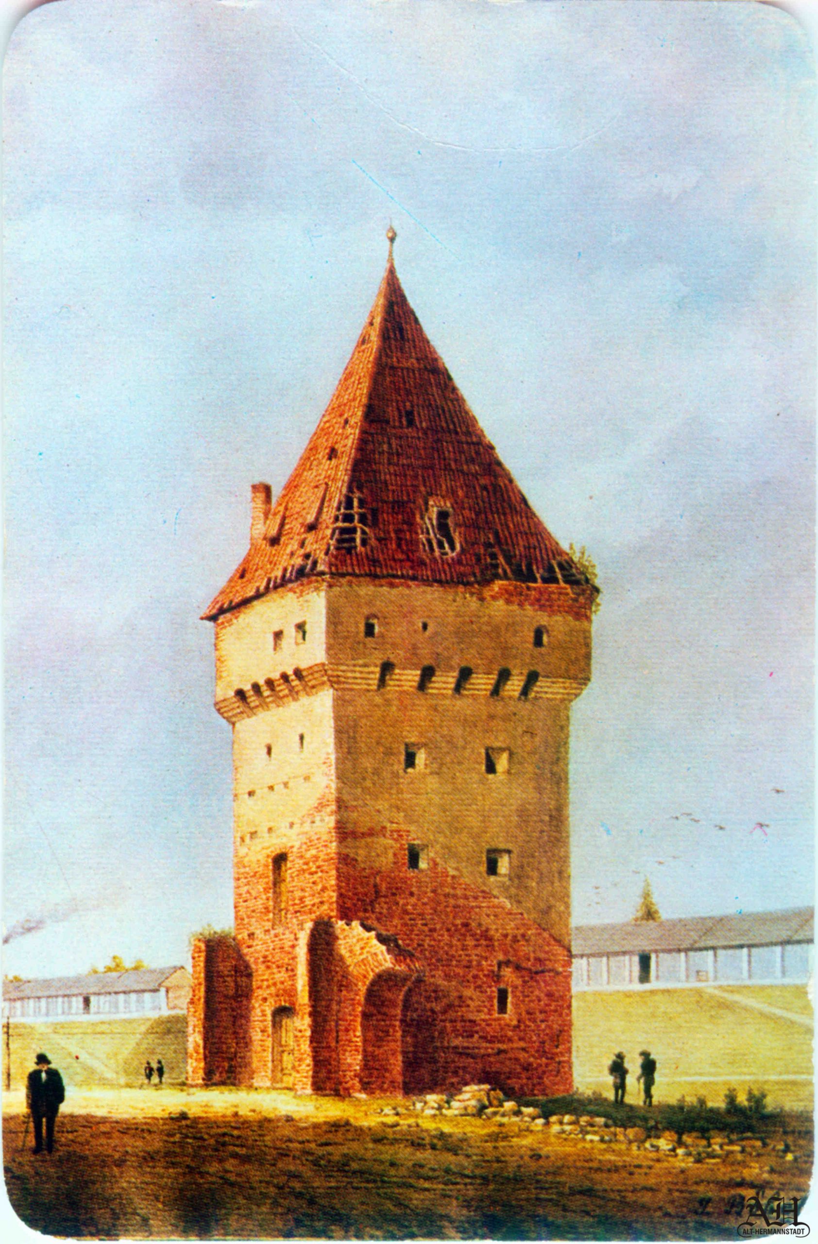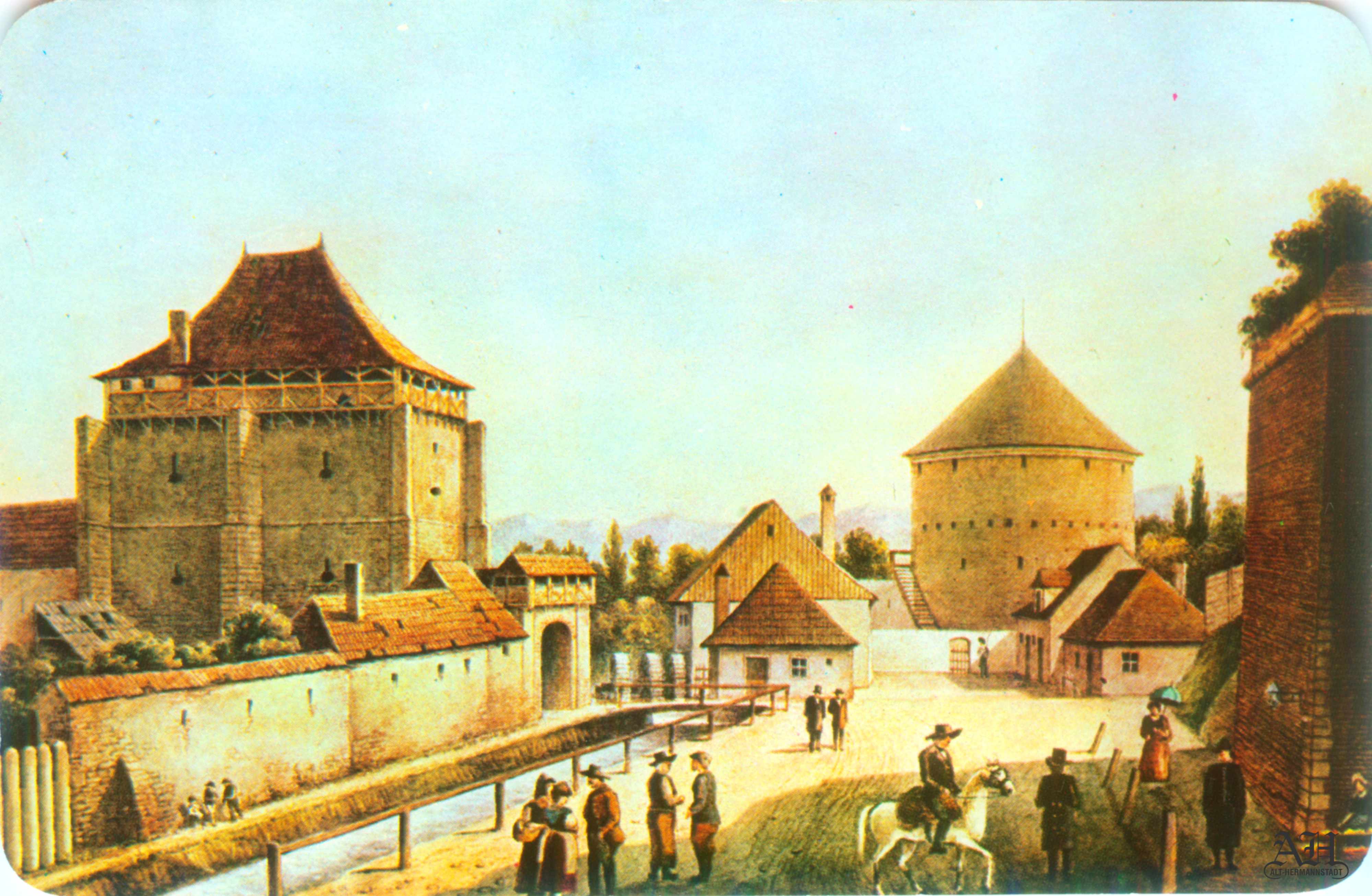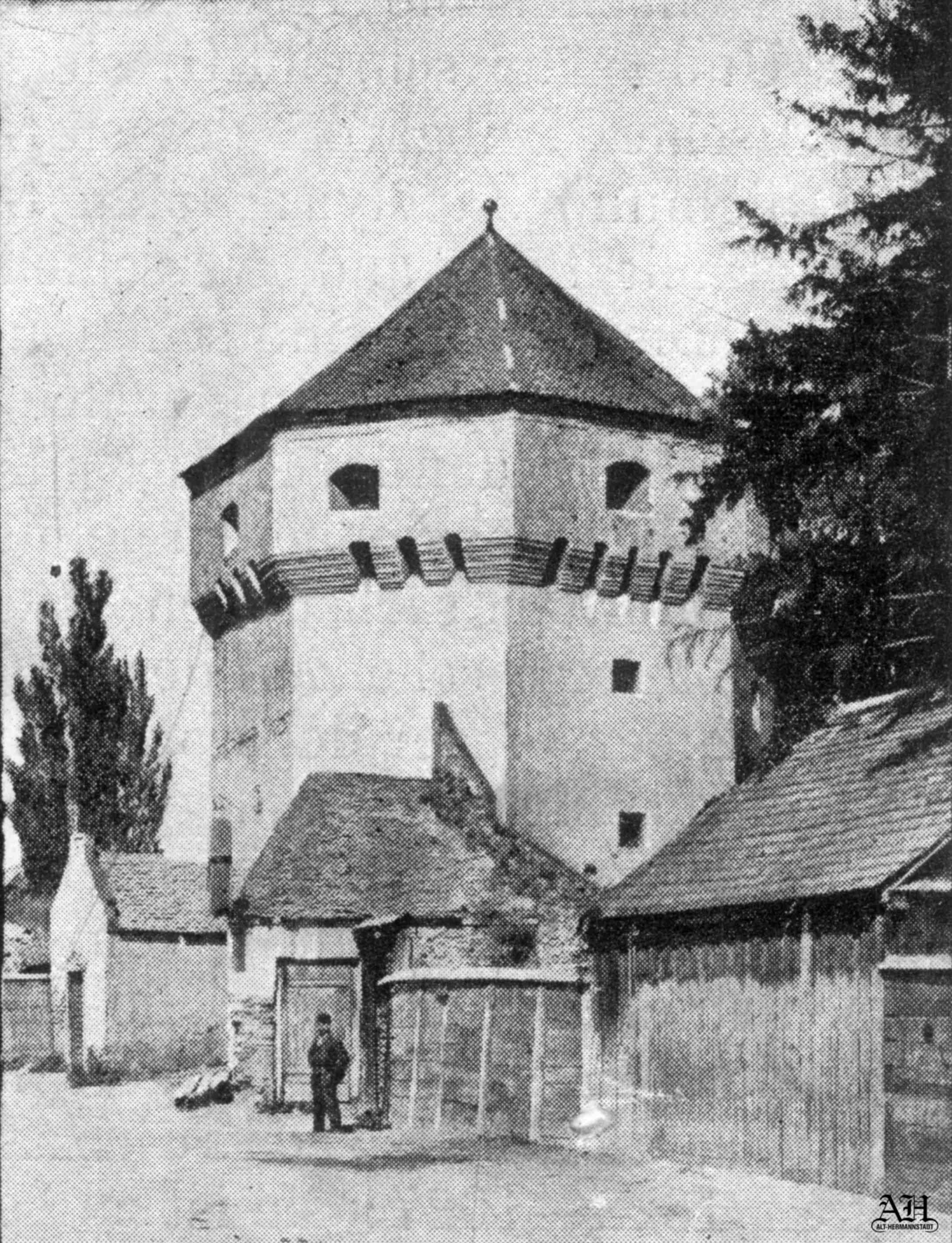 „Turn de apărare lângă Poarta Cisnădiei” – turnul se afla în zona Parcul Astra, în față clădirii str. Ioan Lupaș nr.4. (sursa ilustrație: „Alt-Hermannstadt“)