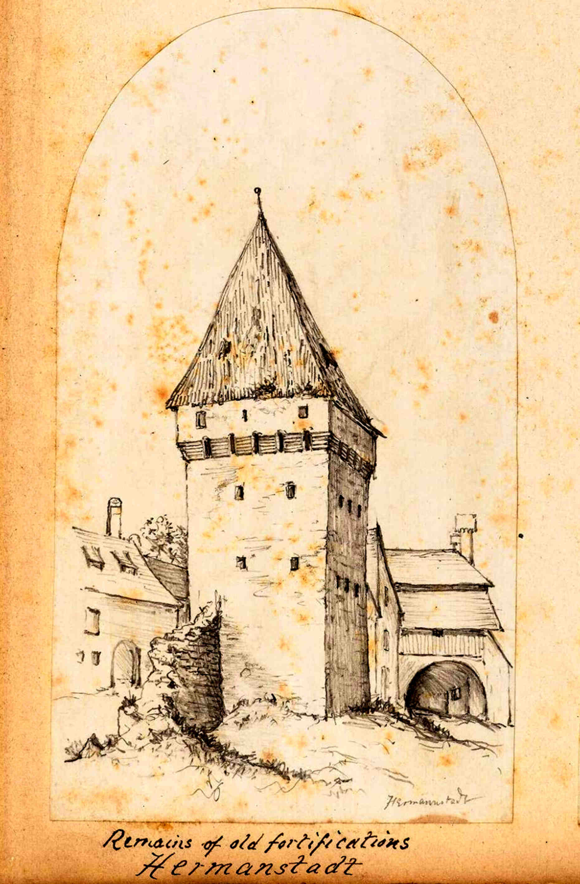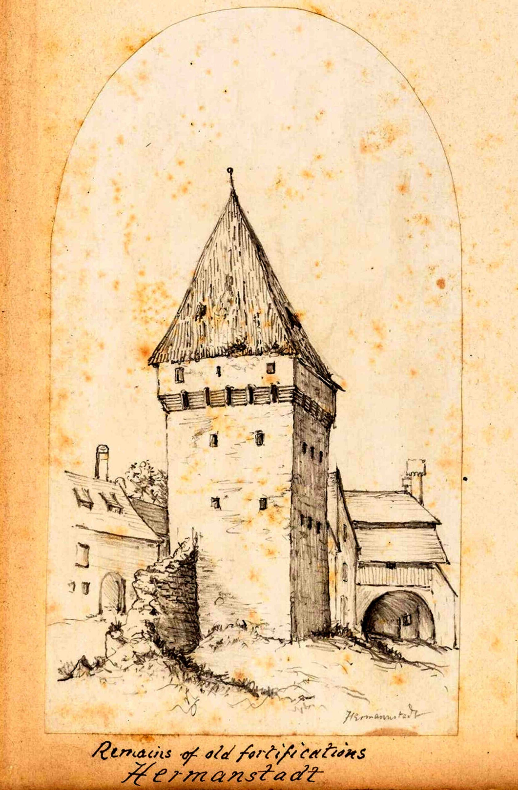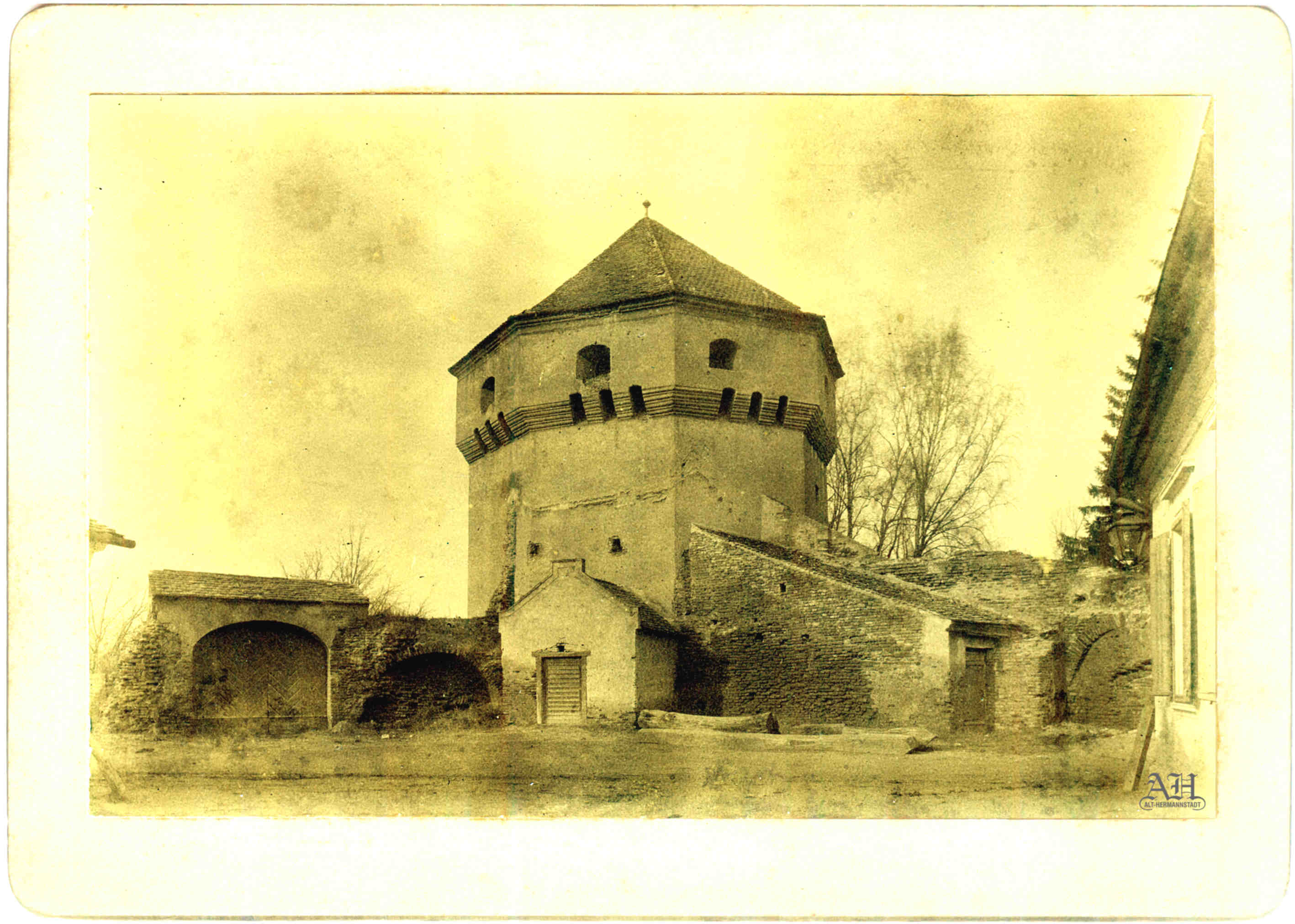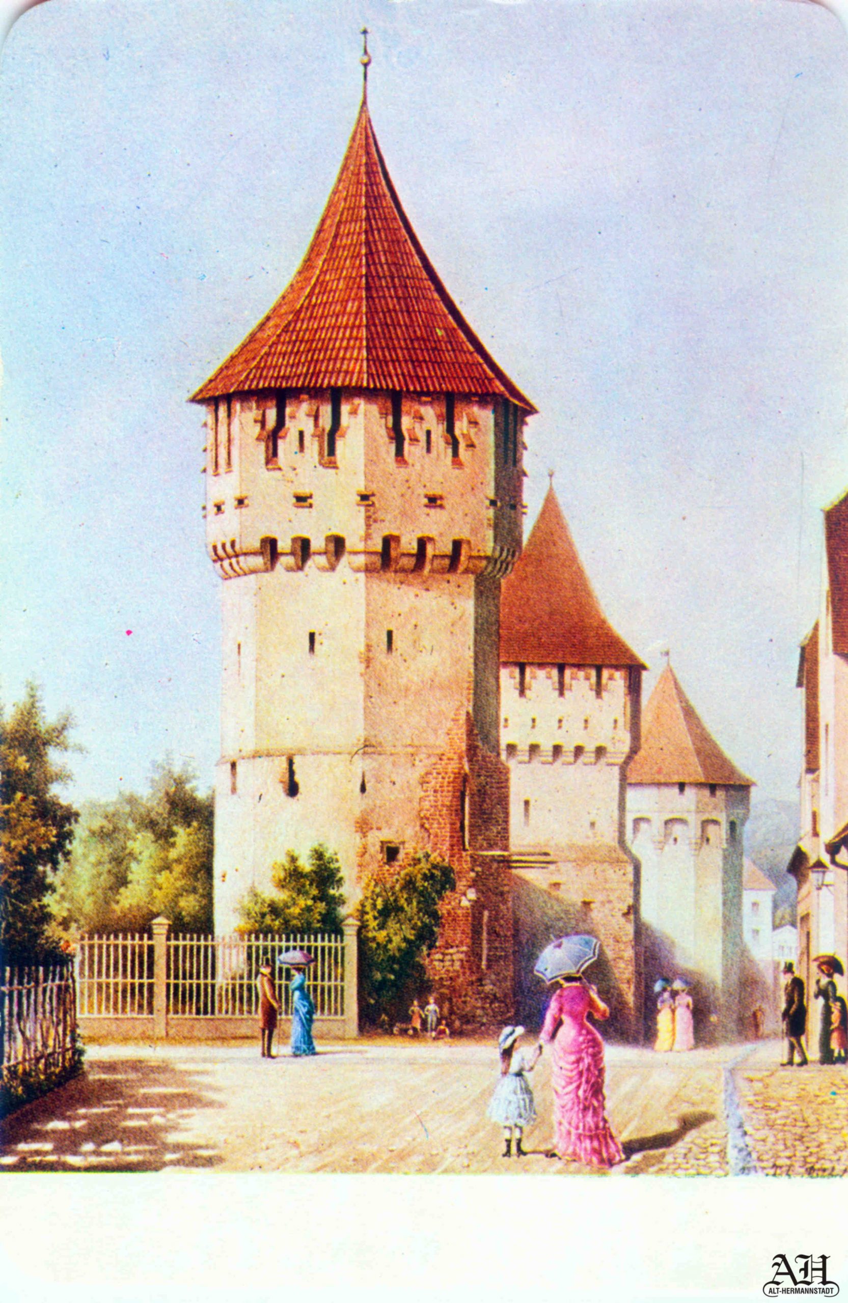 „Turn de apărare lângă Poarta Cisnădiei” – turnul se afla în zona Parcul Astra, în față clădirii str. Ioan Lupaș nr.4. (sursa ilustrație: „Alt-Hermannstadt“)