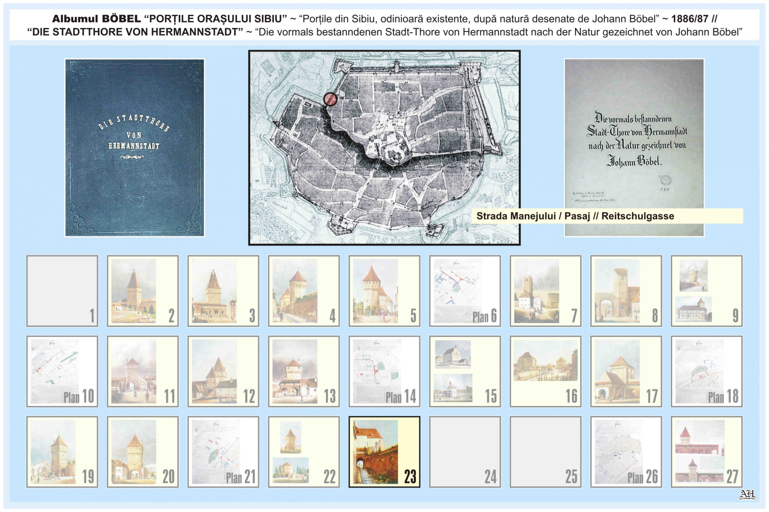 Planul orașului Sibiu din 1875 realizat după un desen al gravorului Franz J. Dimitrowits la Institutul litografic F. A. Robert Krabs din Sibiu, Piața Mare 13, a fost completat, în anii 1882/1883 de pictorul amator sibian Johann Böbel cu detalii grafice policrome și texte scrise de mână referitoare la; „schimbările care au avut loc între 1830 și 1883, în incinta și în afara orașului Sibiu”.