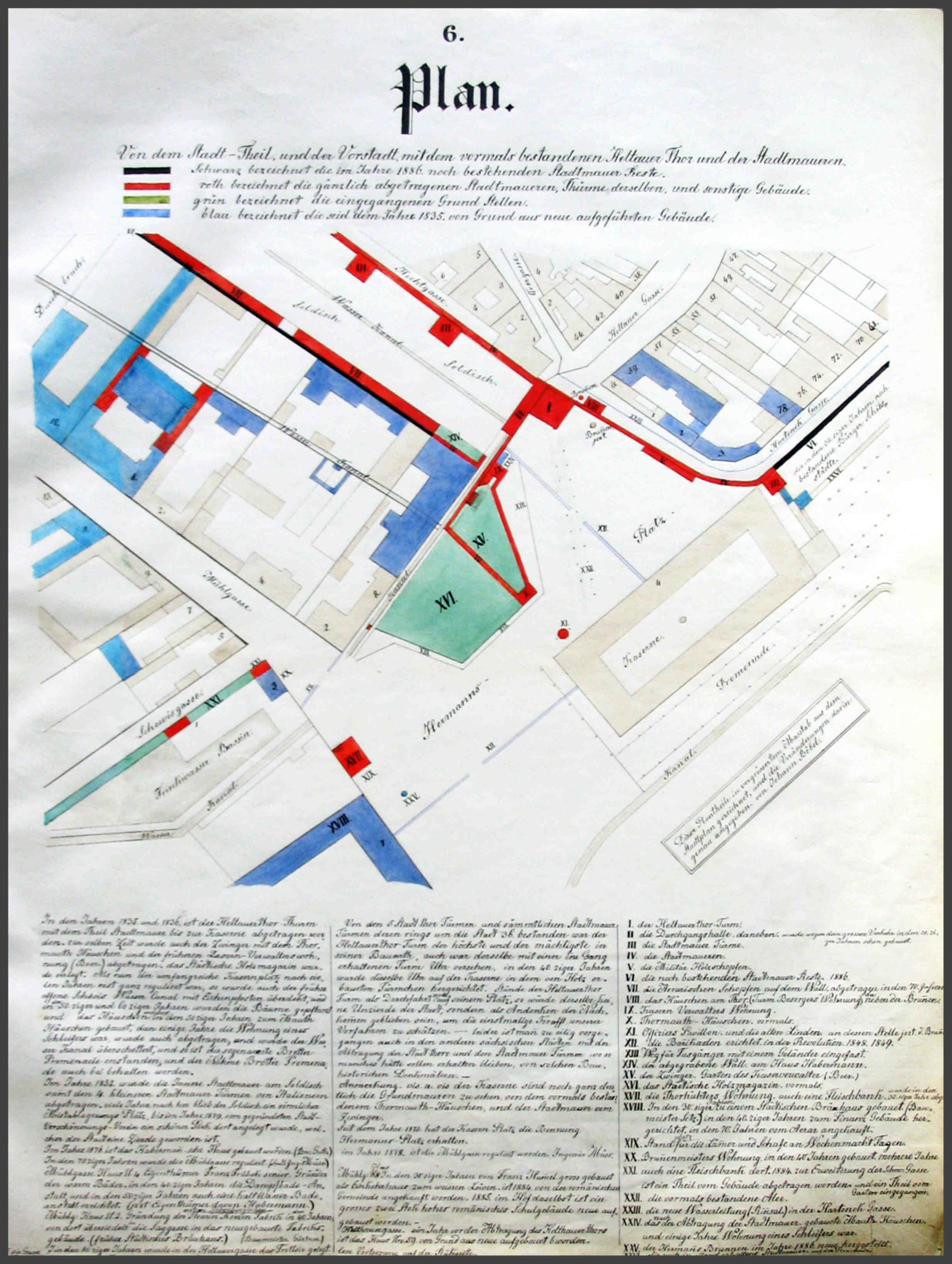 6. In den 70ziger Jahren wurden die ärarischen Schöpfen welche auf dem Erdwall standen, abgetragen. Viele Jahre war der Soldisch ein förmlicher Mist ablagerungs Platz. Im Jahr 1878 wurde durch den ins Leben getretene Stadt Verschönerungs Verein, der grösste Theil des Soldisch zu einem sehr schönen Park angelegt und ist nun eine Zierde der Stadt geworden.